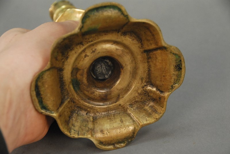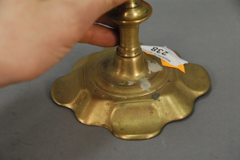 Queen Anne brass candlestick, 18th century. ht. 7 3/4in.