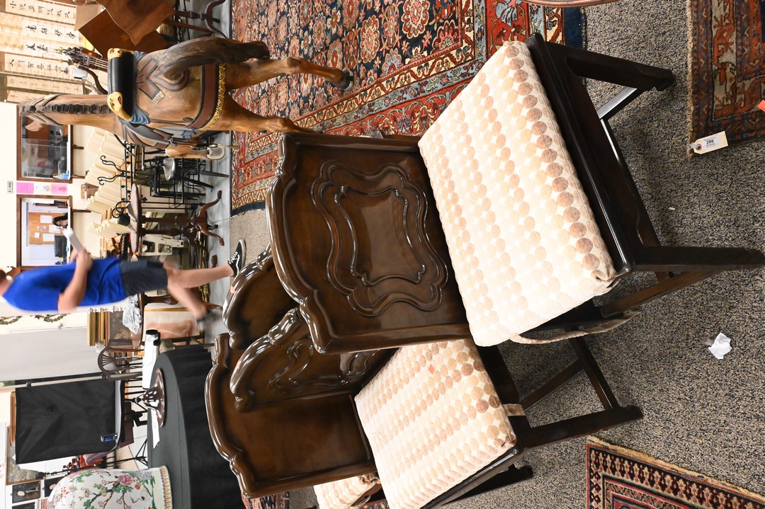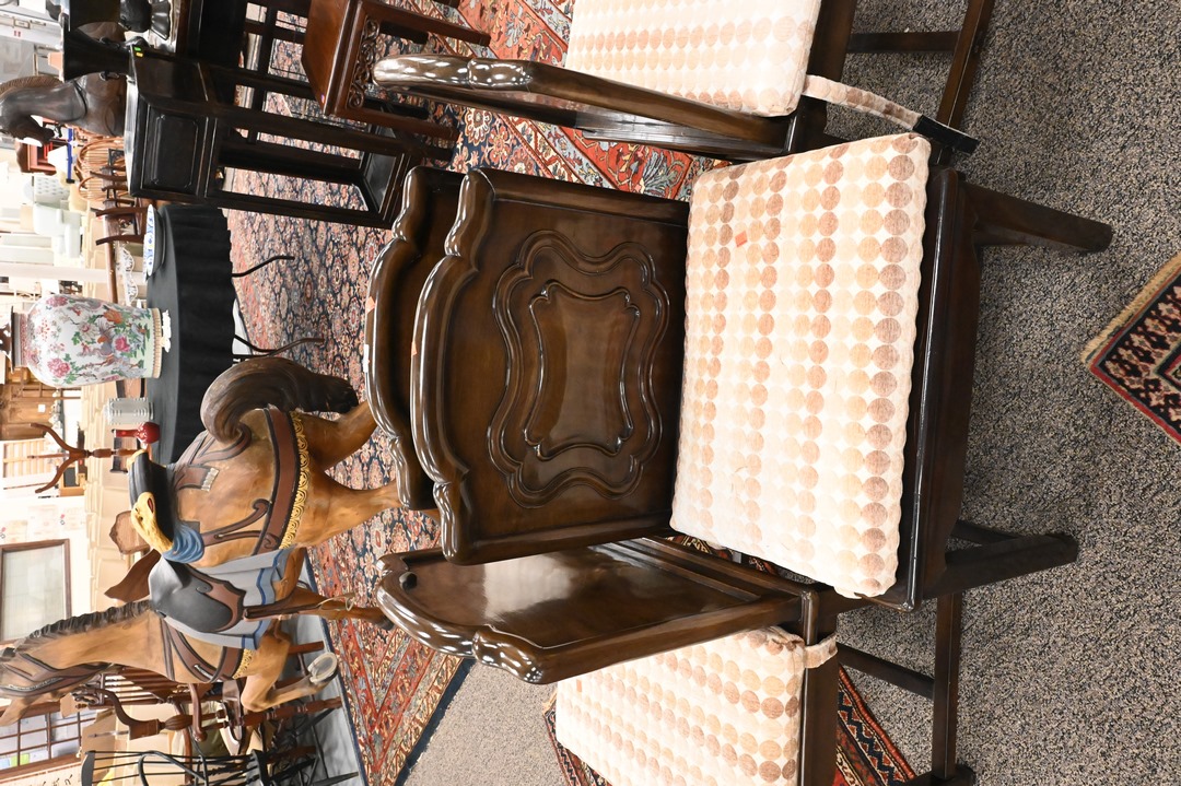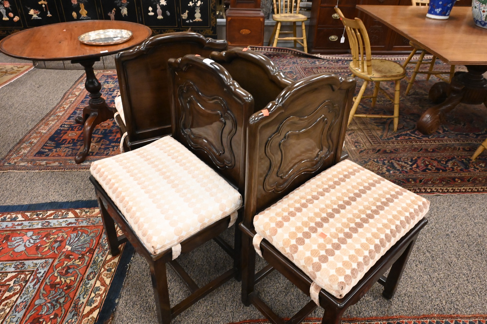 Set of Four Chinese Hardwood Side Chairs, having carved panel backs, now with custom cushion seats, height 36 1/2 inches, width 20 1/2 inches.
