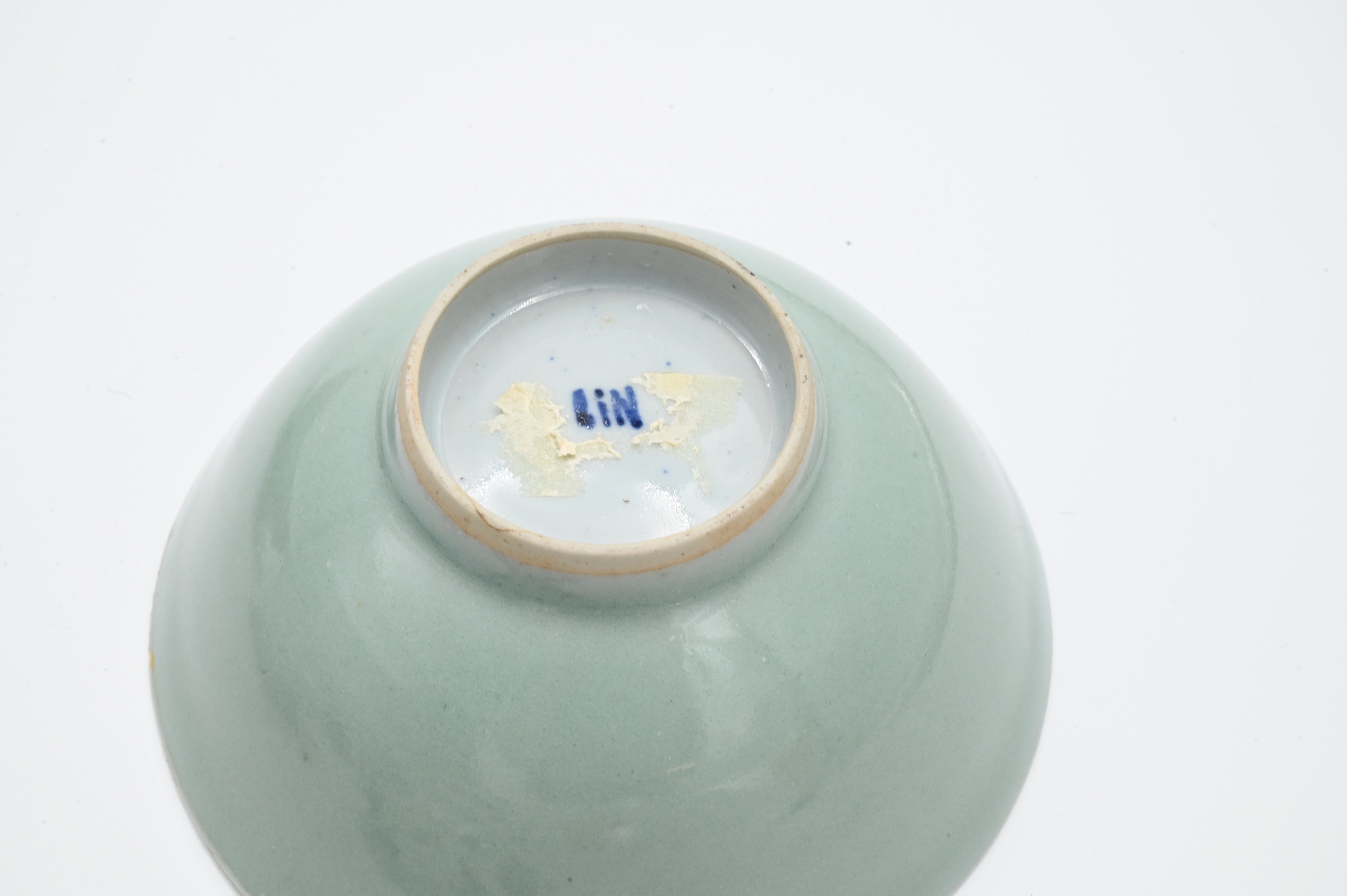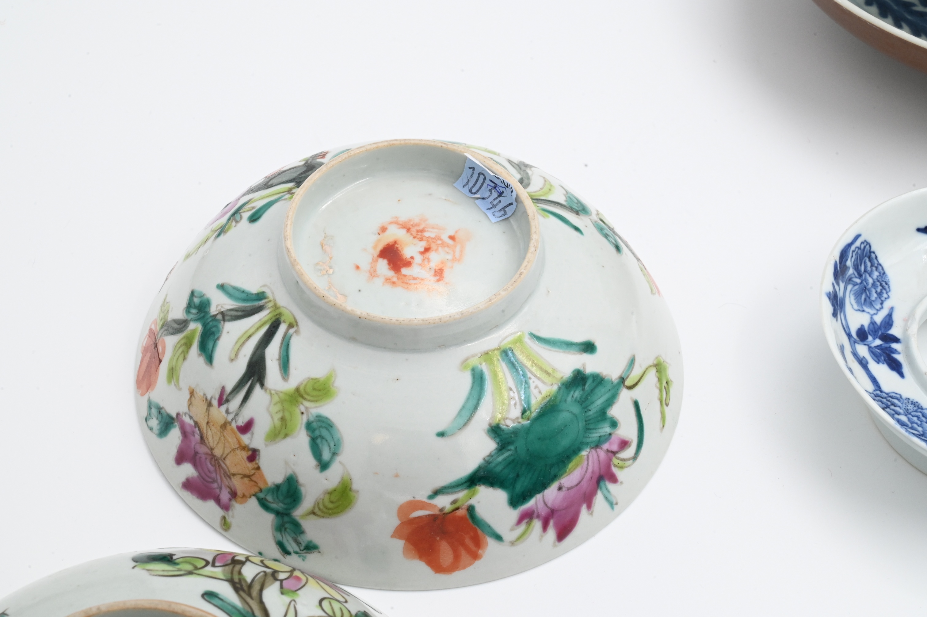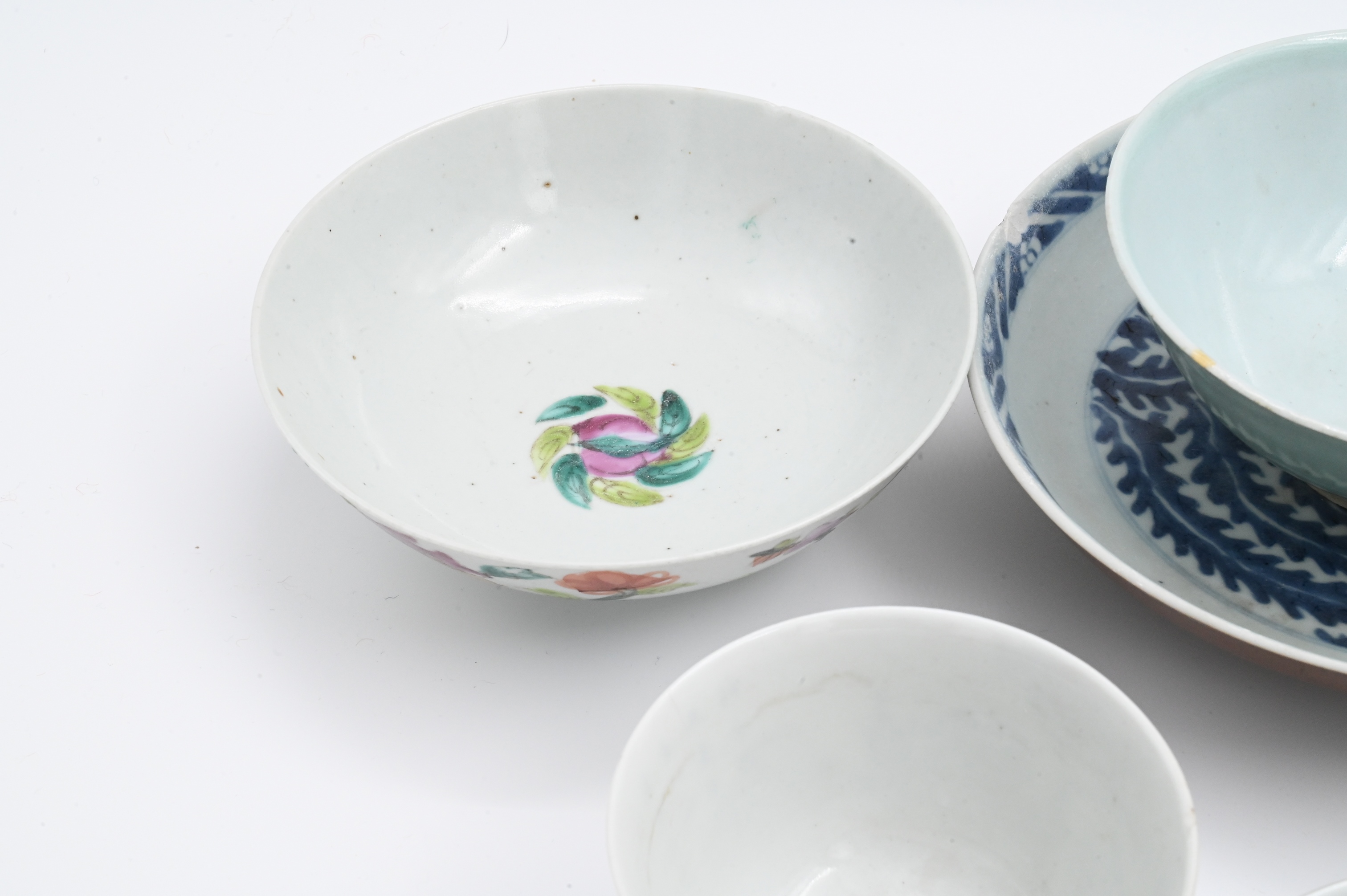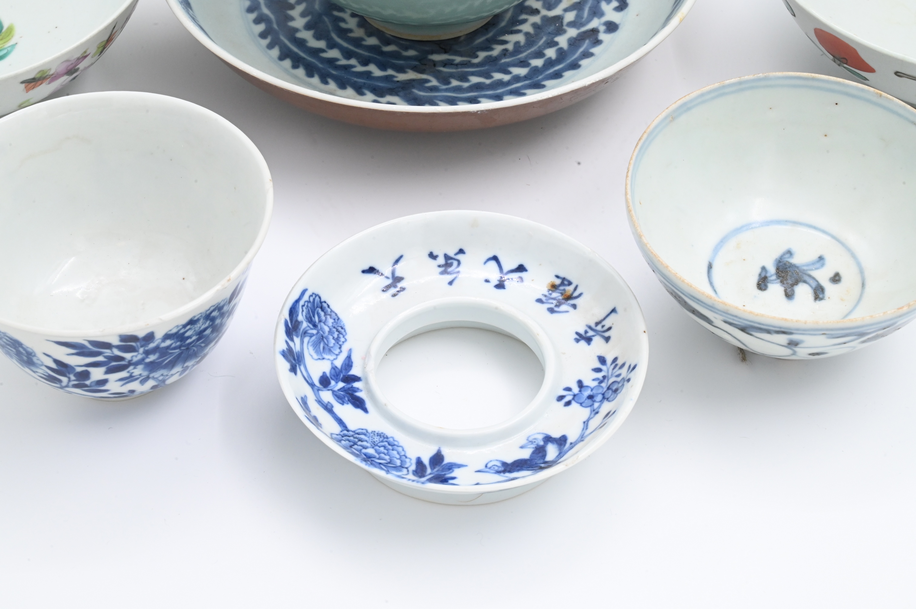 to include Celadon bowl having mark on base Lin, pair of famille rose bowls, blue and white cup with hollow saucer, blue and white shallow bowl having brown exterior diameter 7 3/4 inches, small blue and white scrolling vine bowl
