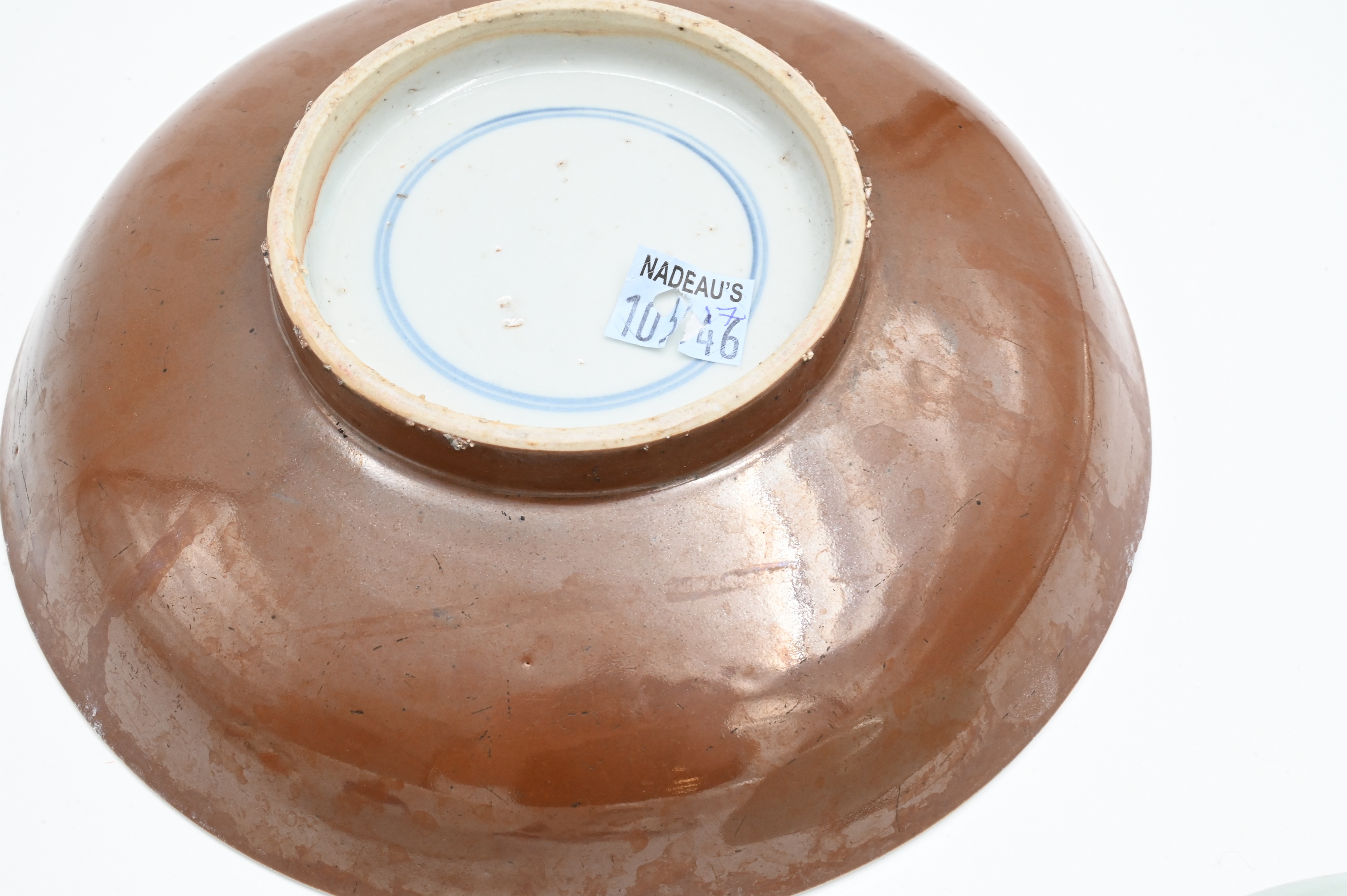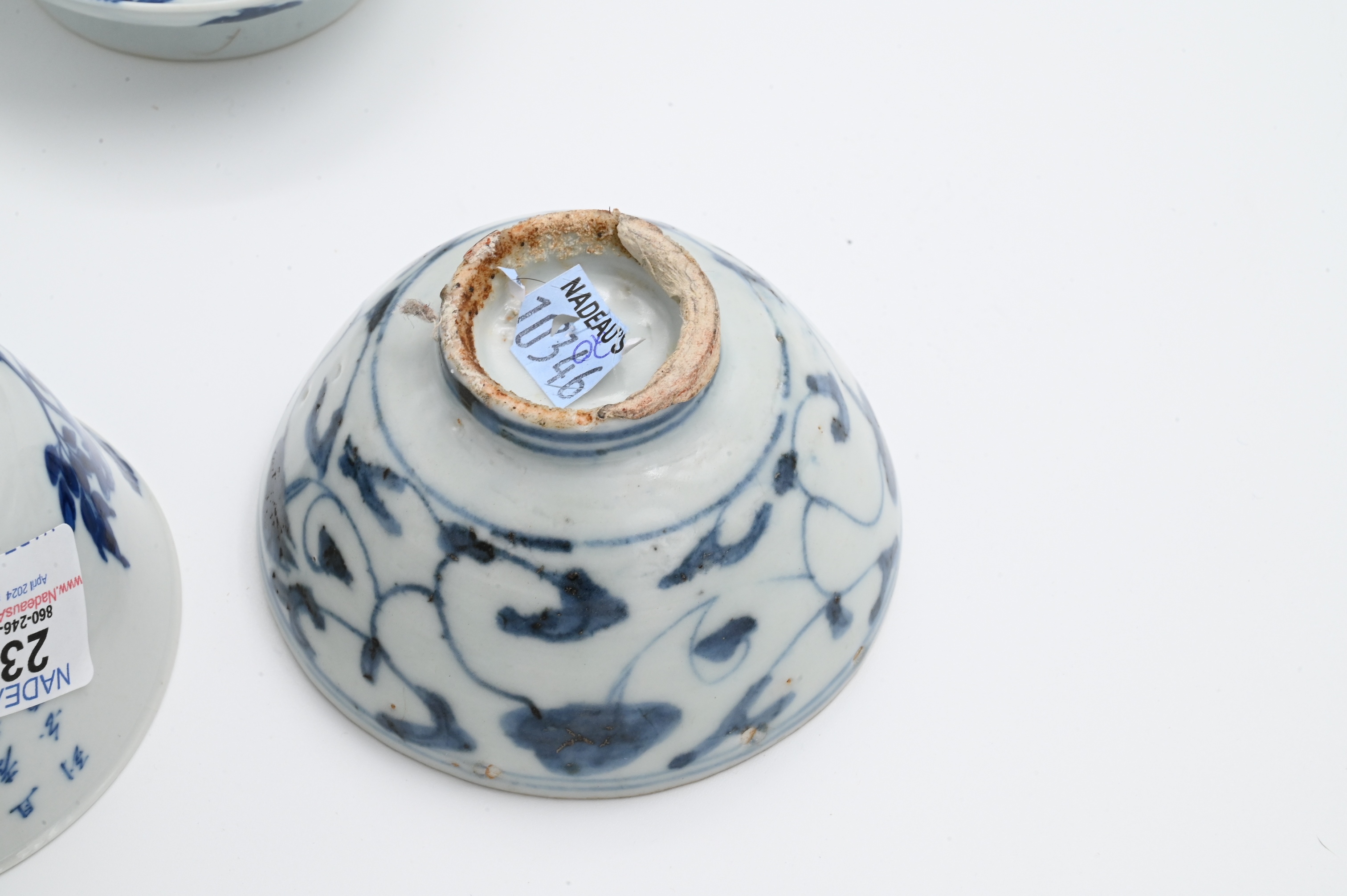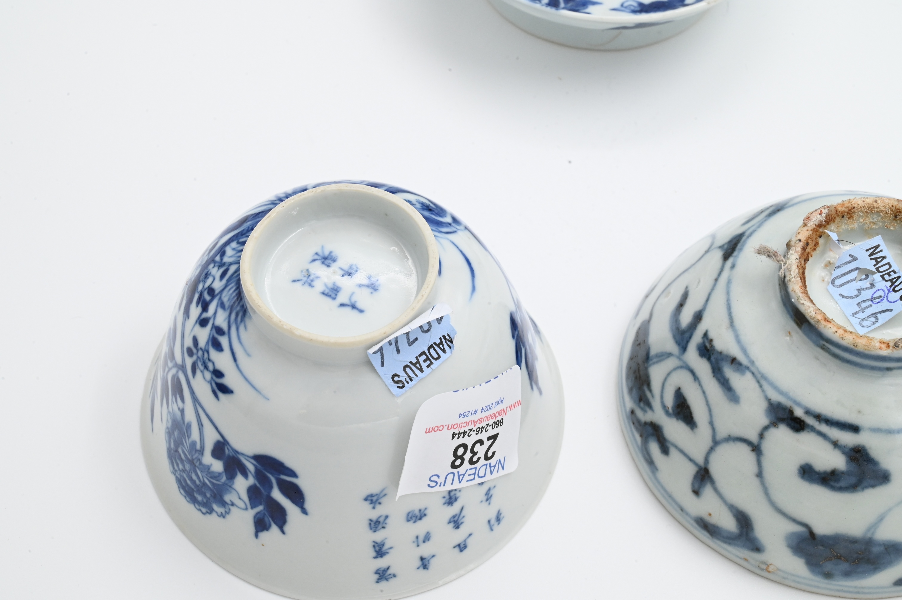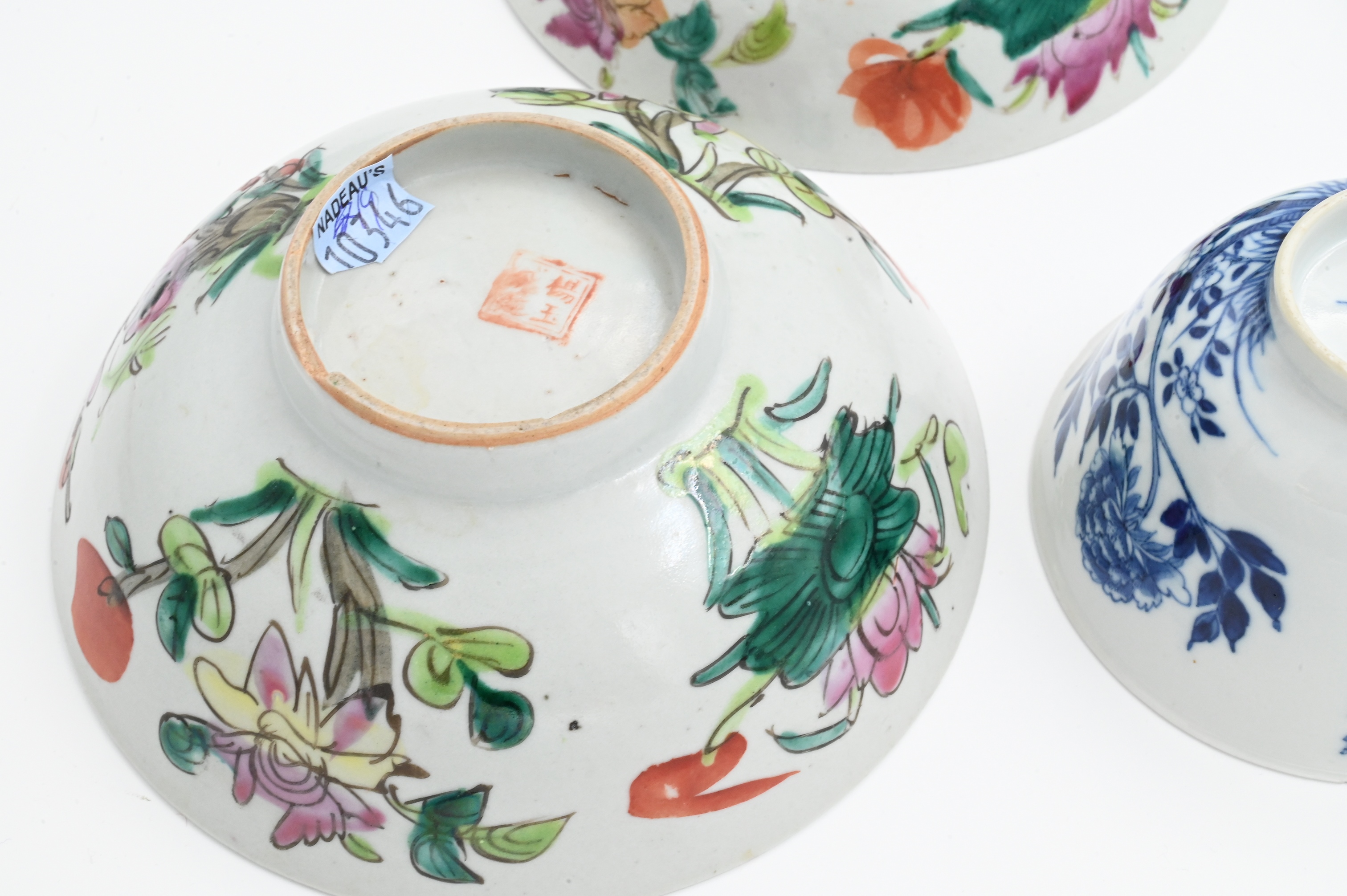 to include Celadon bowl having mark on base Lin, pair of famille rose bowls, blue and white cup with hollow saucer, blue and white shallow bowl having brown exterior diameter 7 3/4 inches, small blue and white scrolling vine bowl