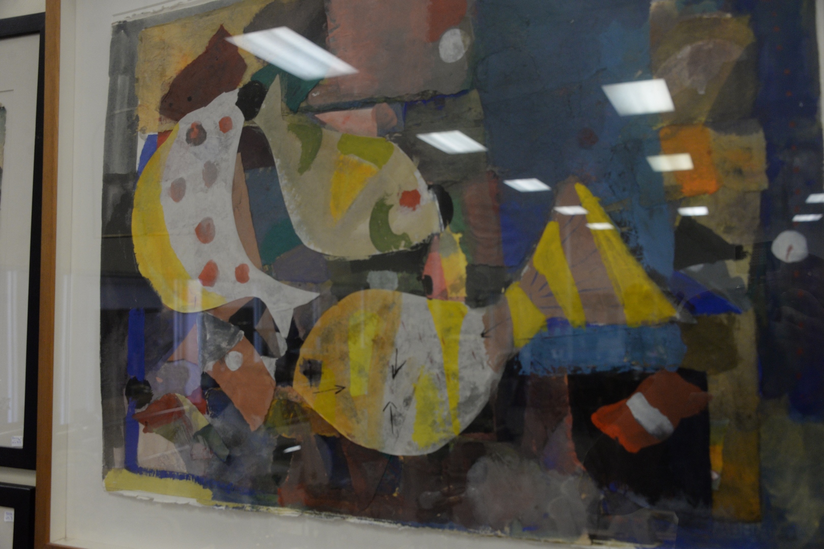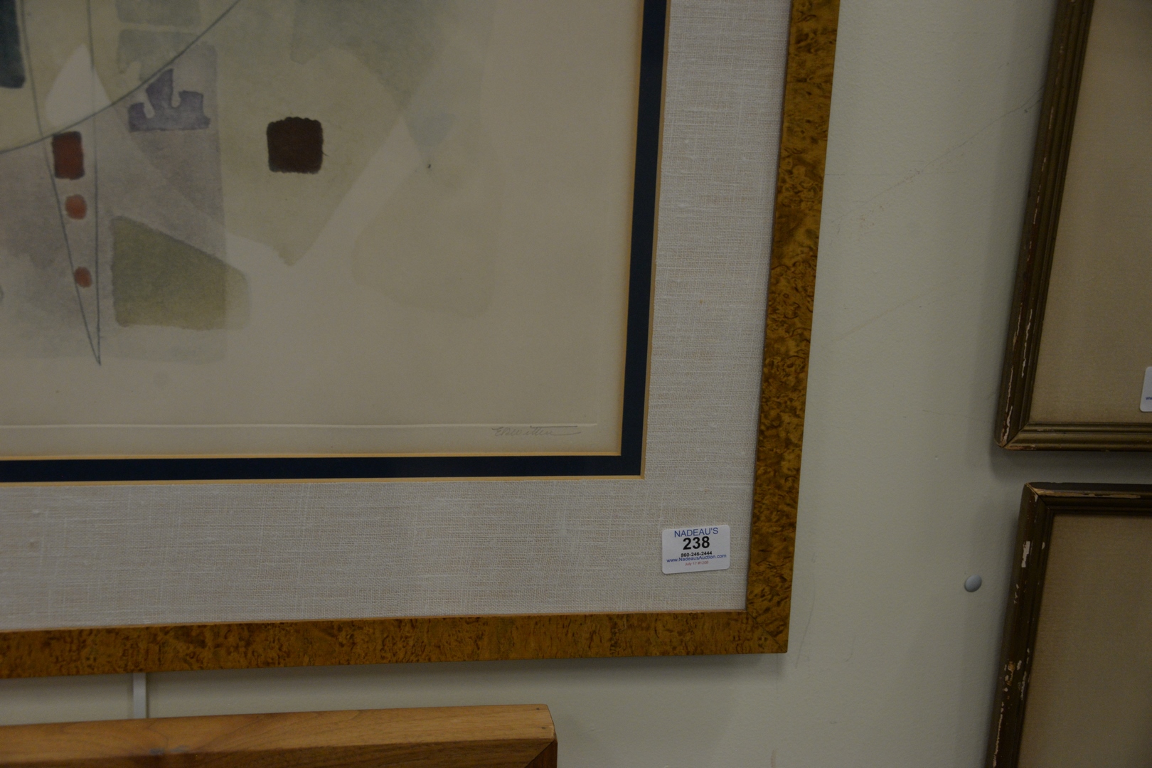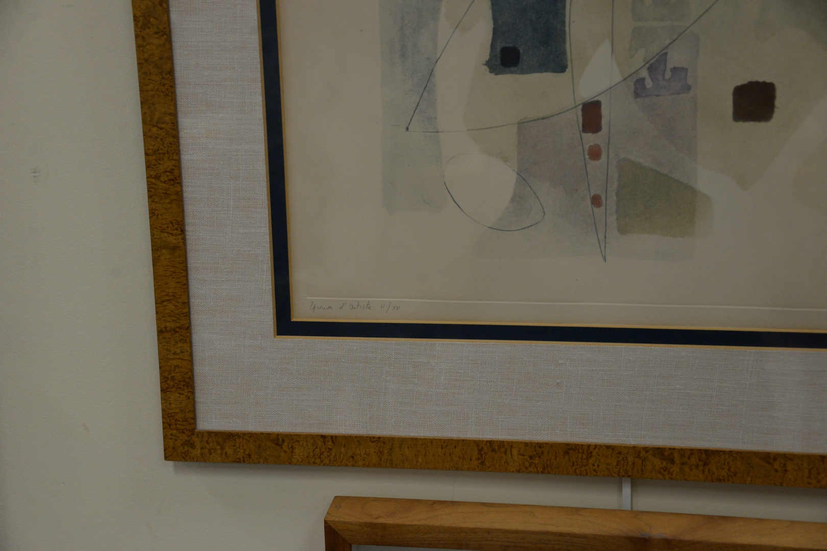 Lot 238: Three Piece Group of Three Abstractions, to include Dan Mueller, “To Catch a Falling Star”, ink on paper, signed and dated lower left; Eugene Witten lithograph, signed, titled, and dated in pencil along the lower edge; along with “Clownfish Dancer” by Dan Mueller, a mixed media with collage, having a David Barnett Gallery label adhered to the reverse.