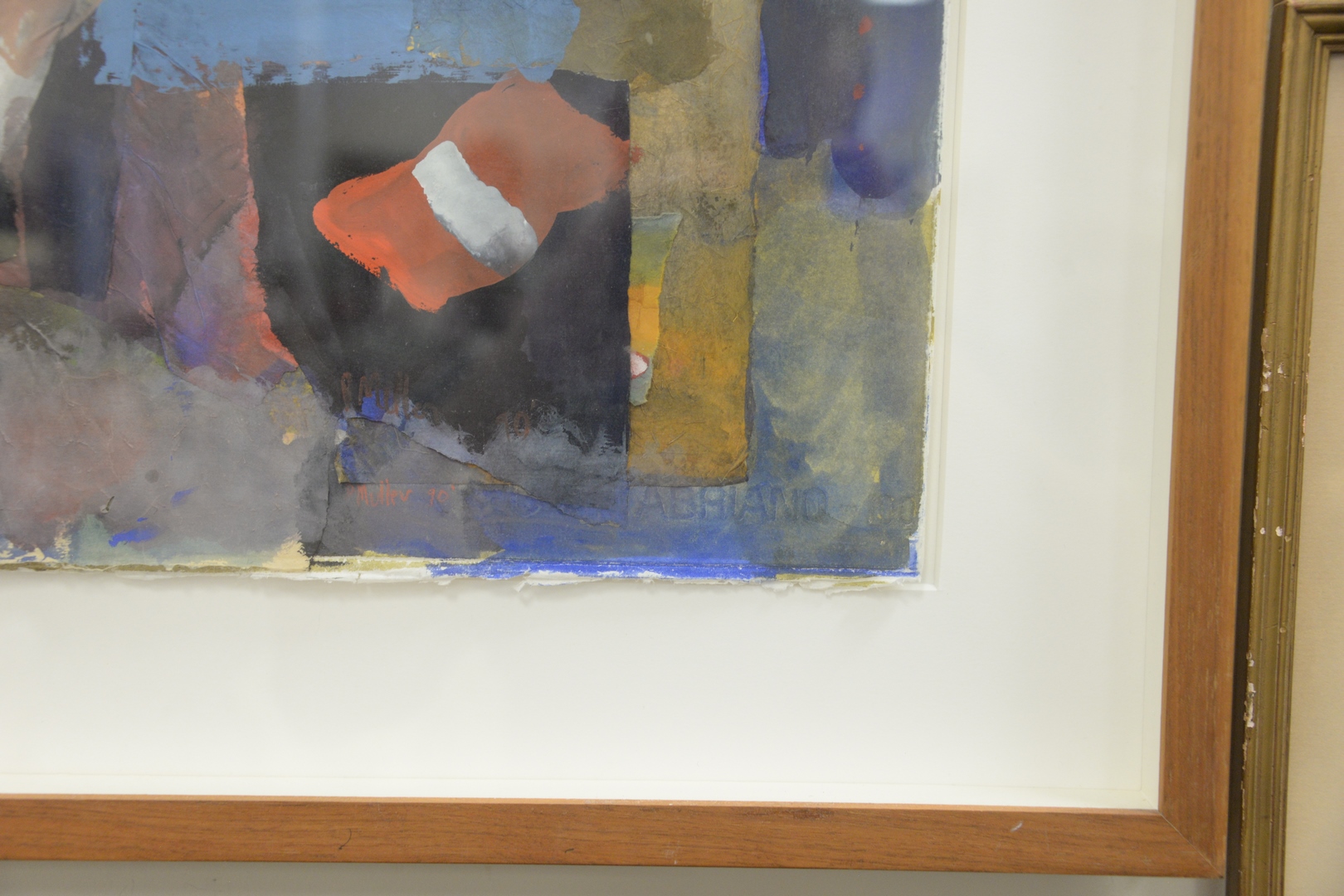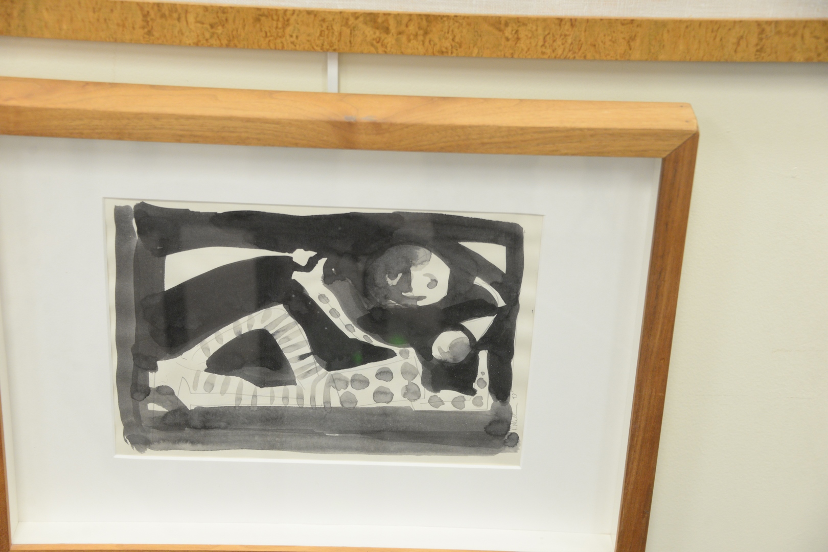 Three Piece Group of Three Abstractions, to include Dan Mueller, “To Catch a Falling Star”, ink on paper, signed and dated lower left; Eugene Witten lithograph, signed, titled, and dated in pencil along the lower edge; along with “Clownfish Dancer” by Dan Mueller, a mixed media with collage, having a David Barnett Gallery label adhered to the reverse.