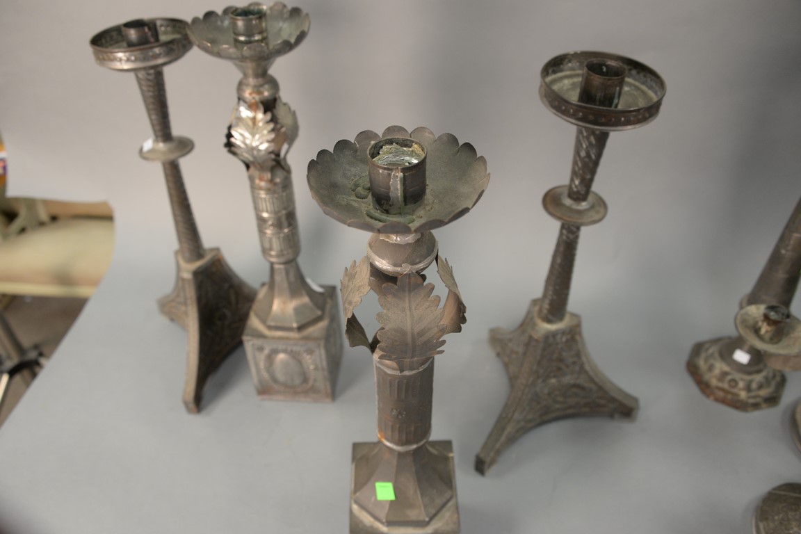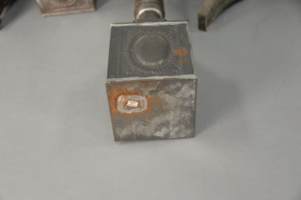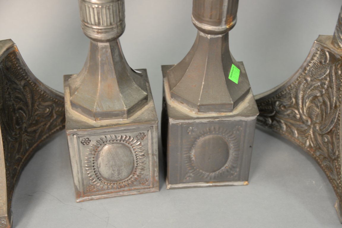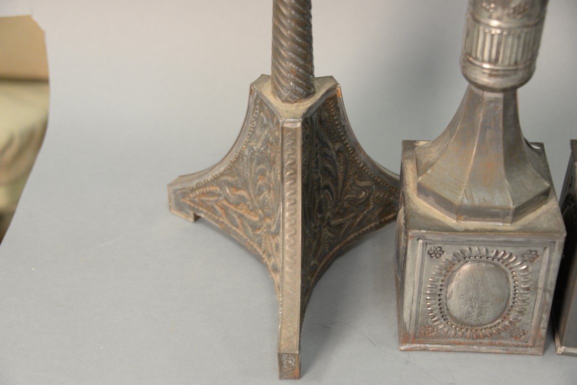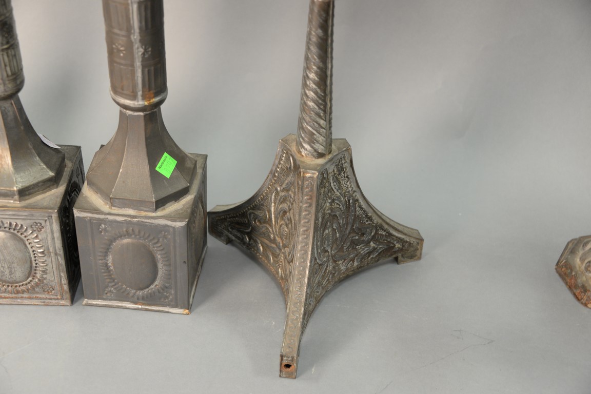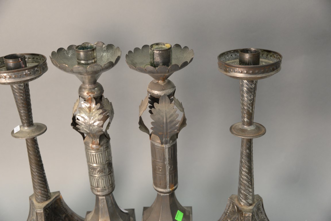 Two pairs of tin candlesticks, 19th/20th century. ht. 21in. & 20in.