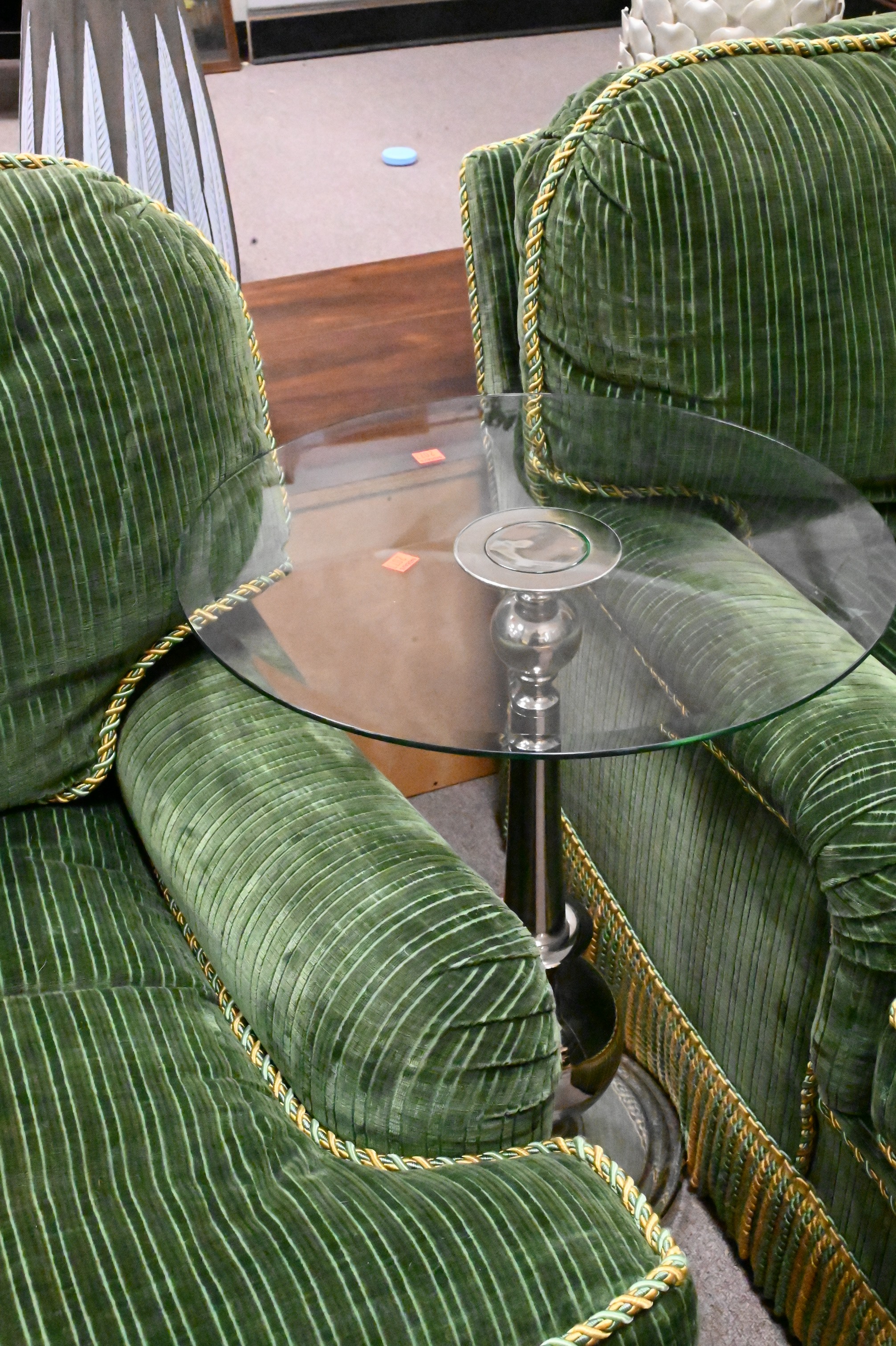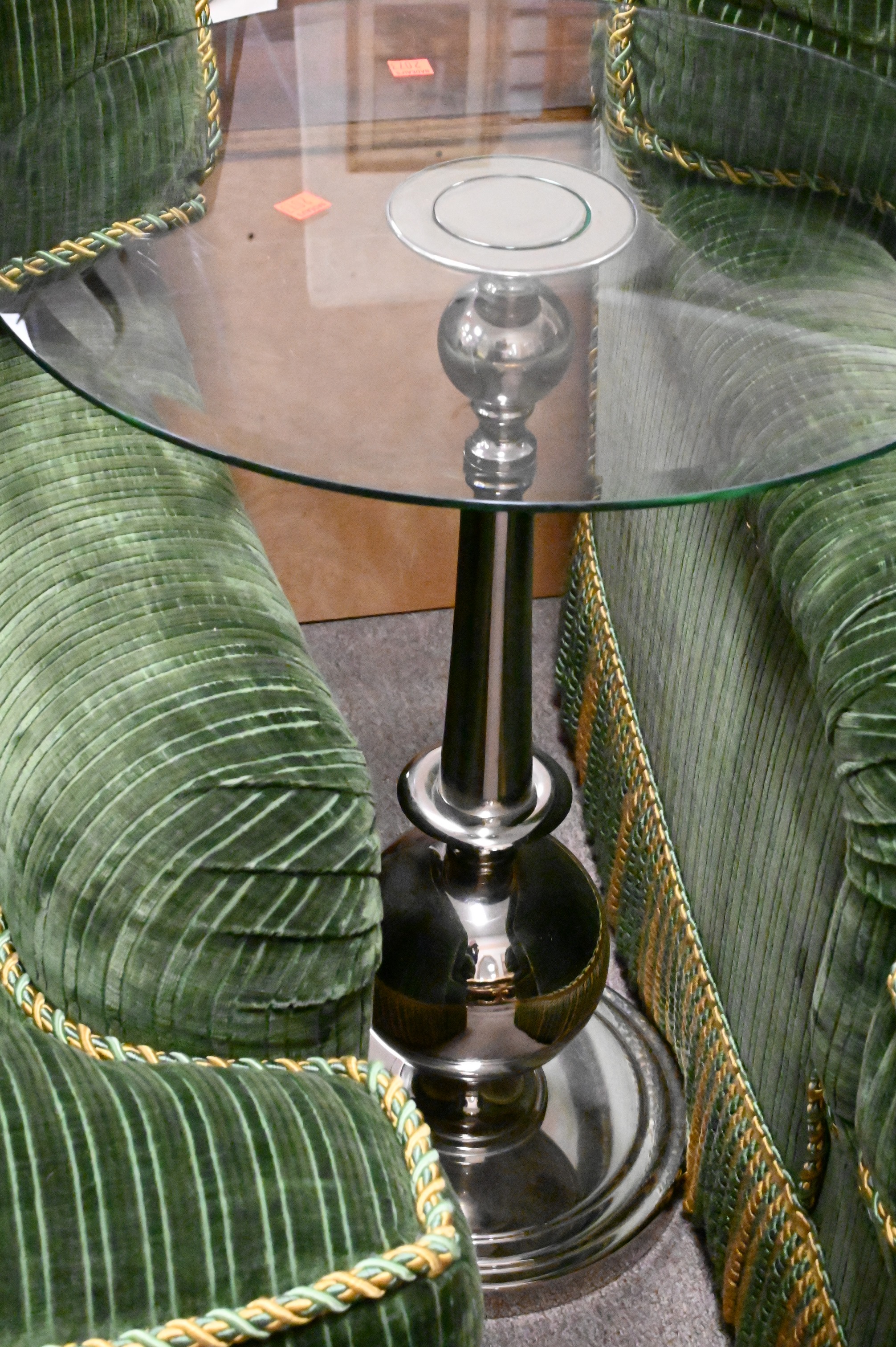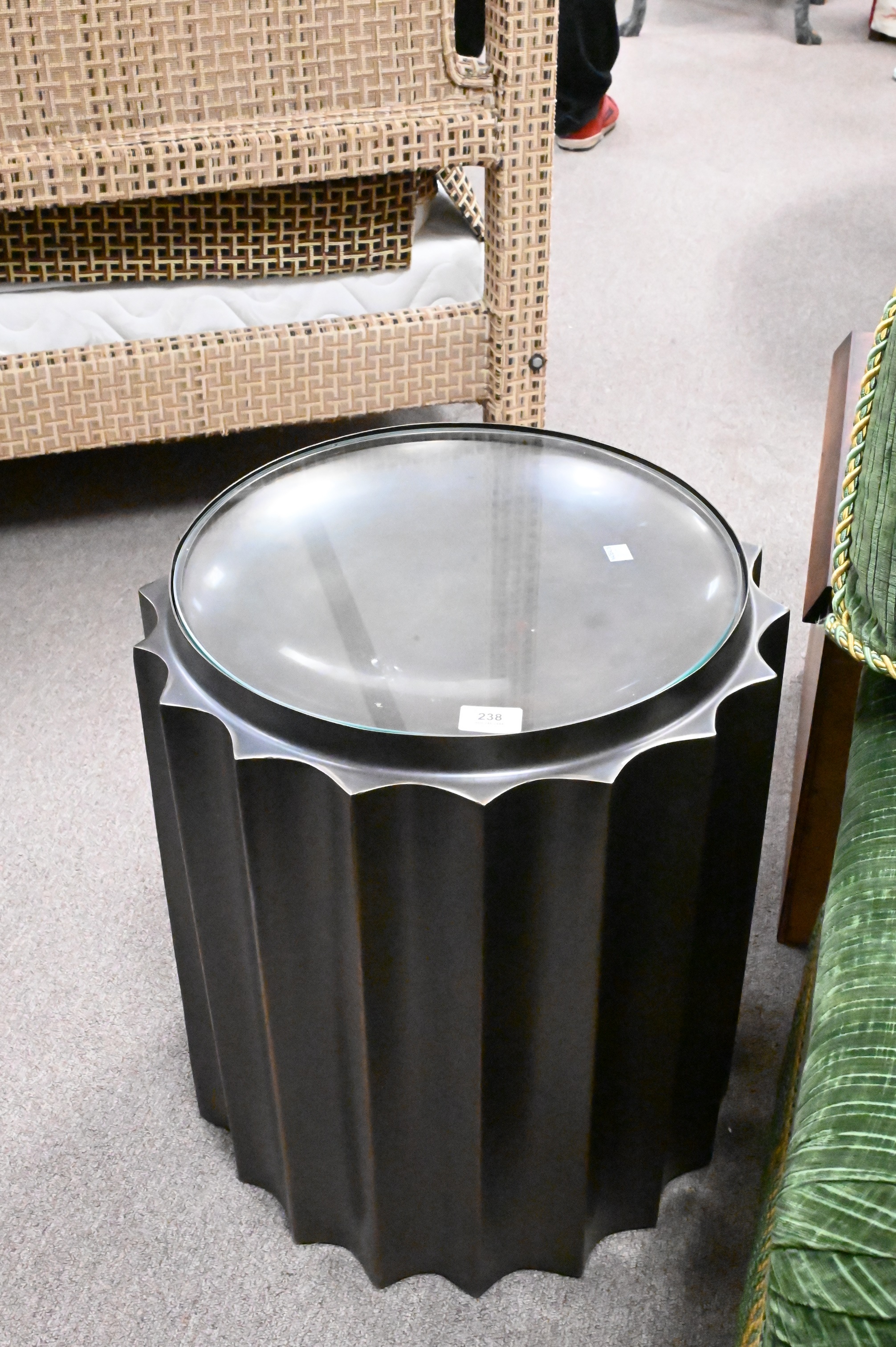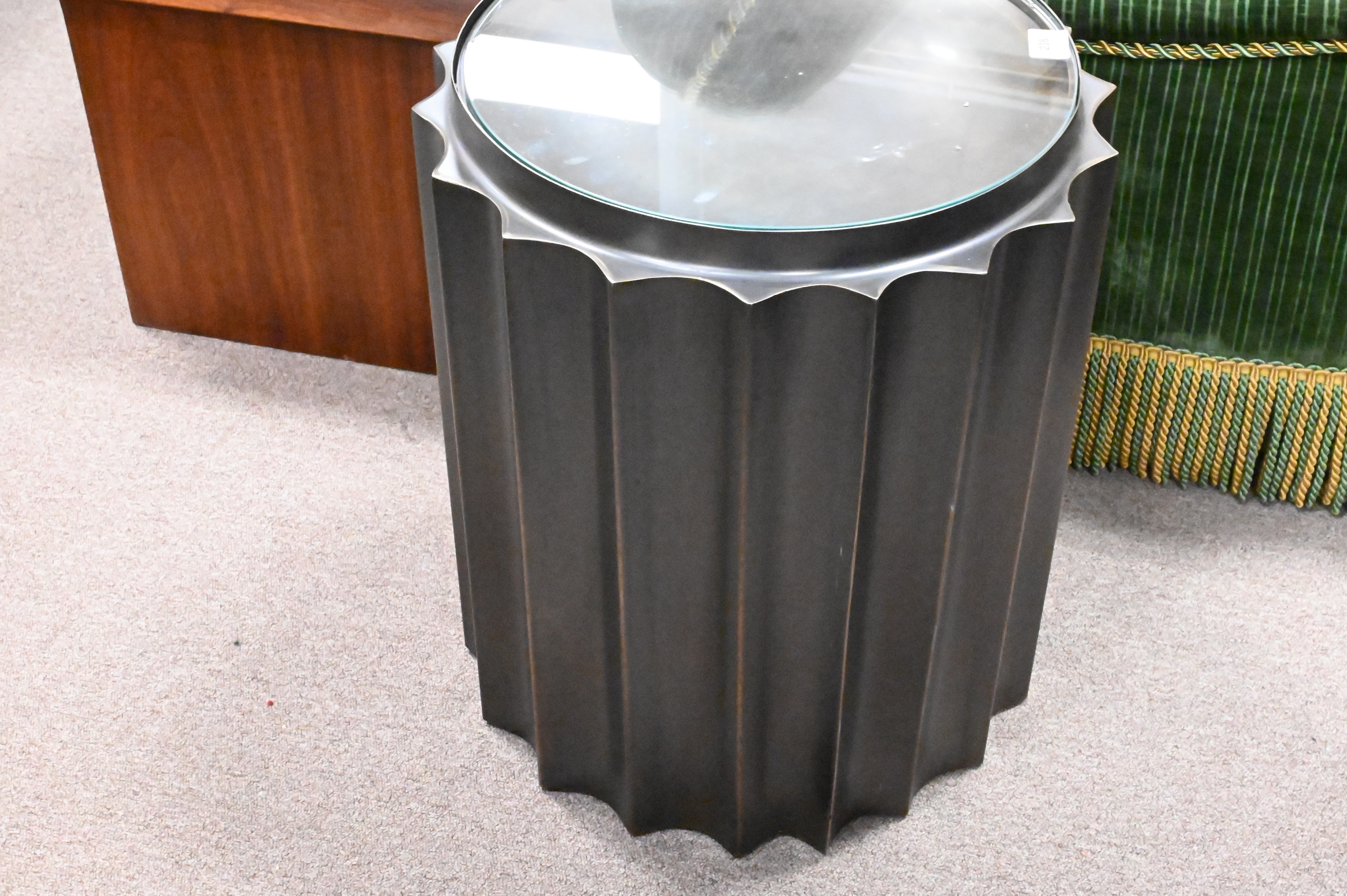 Two Piece Lot, to include a fluted side table, antique bronze finish, in the form of a drum with glass top, Global Views; along with a glass top chrome table, height 21 1/2 inches, diameter 16 inches.