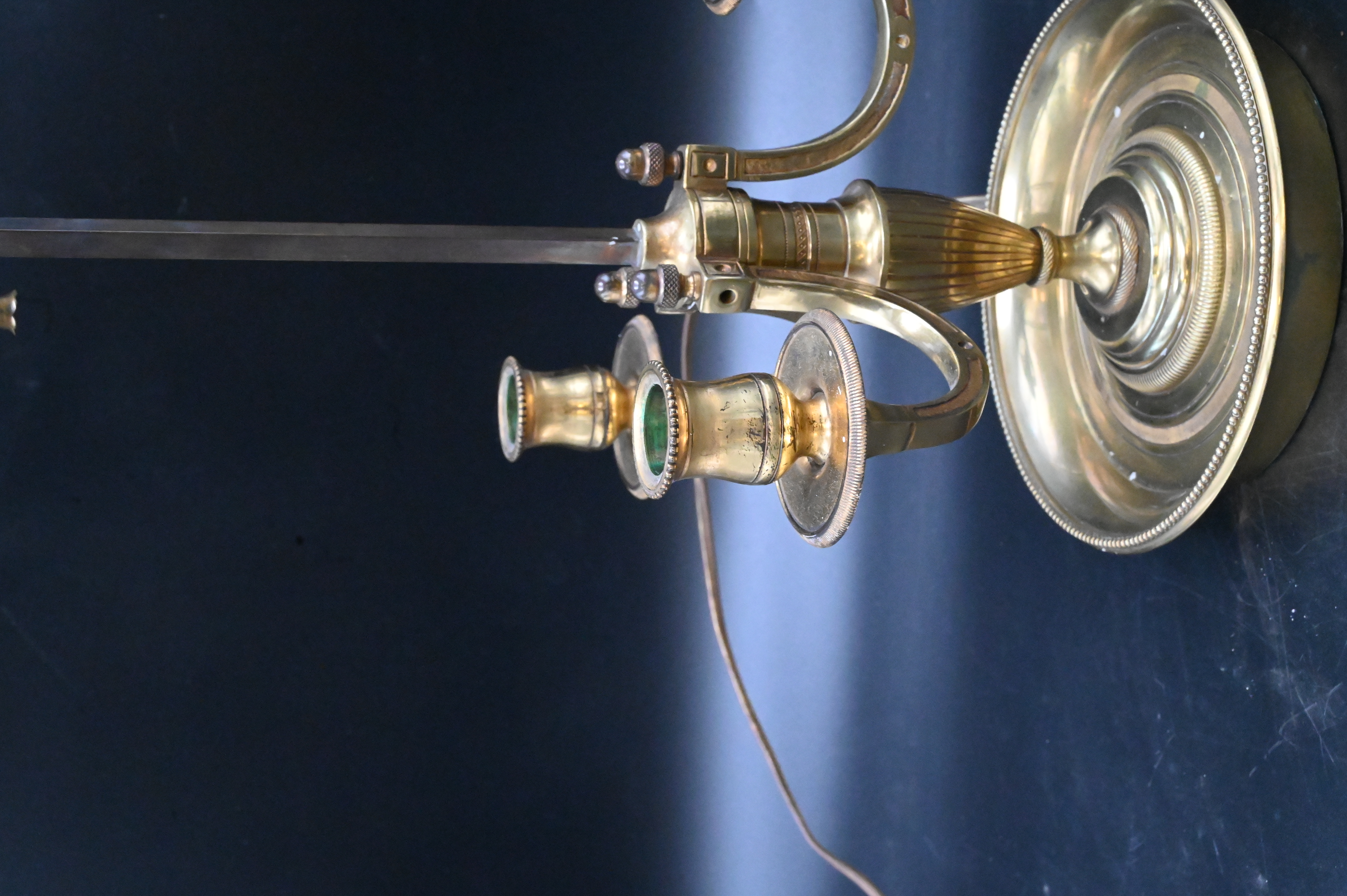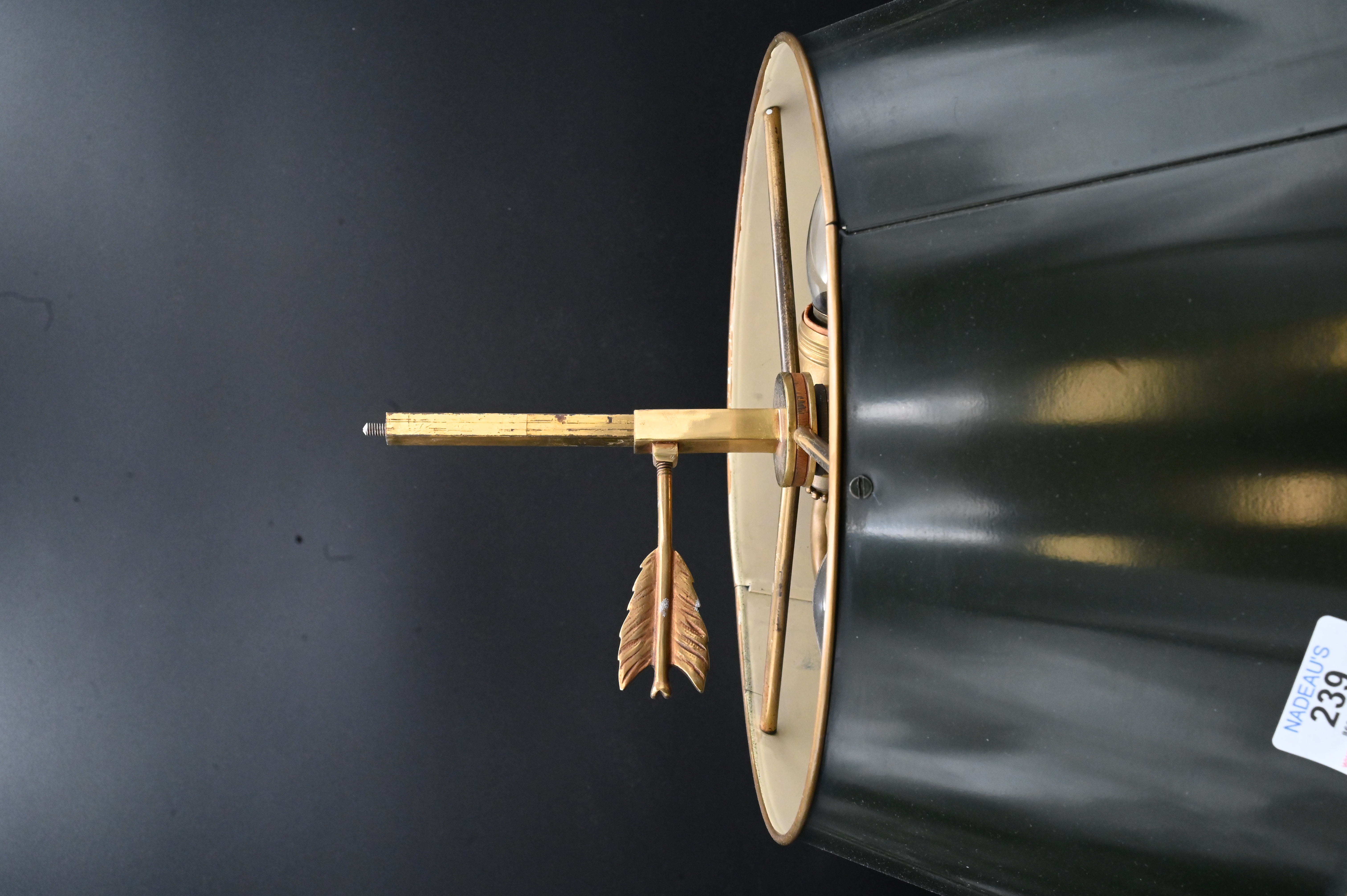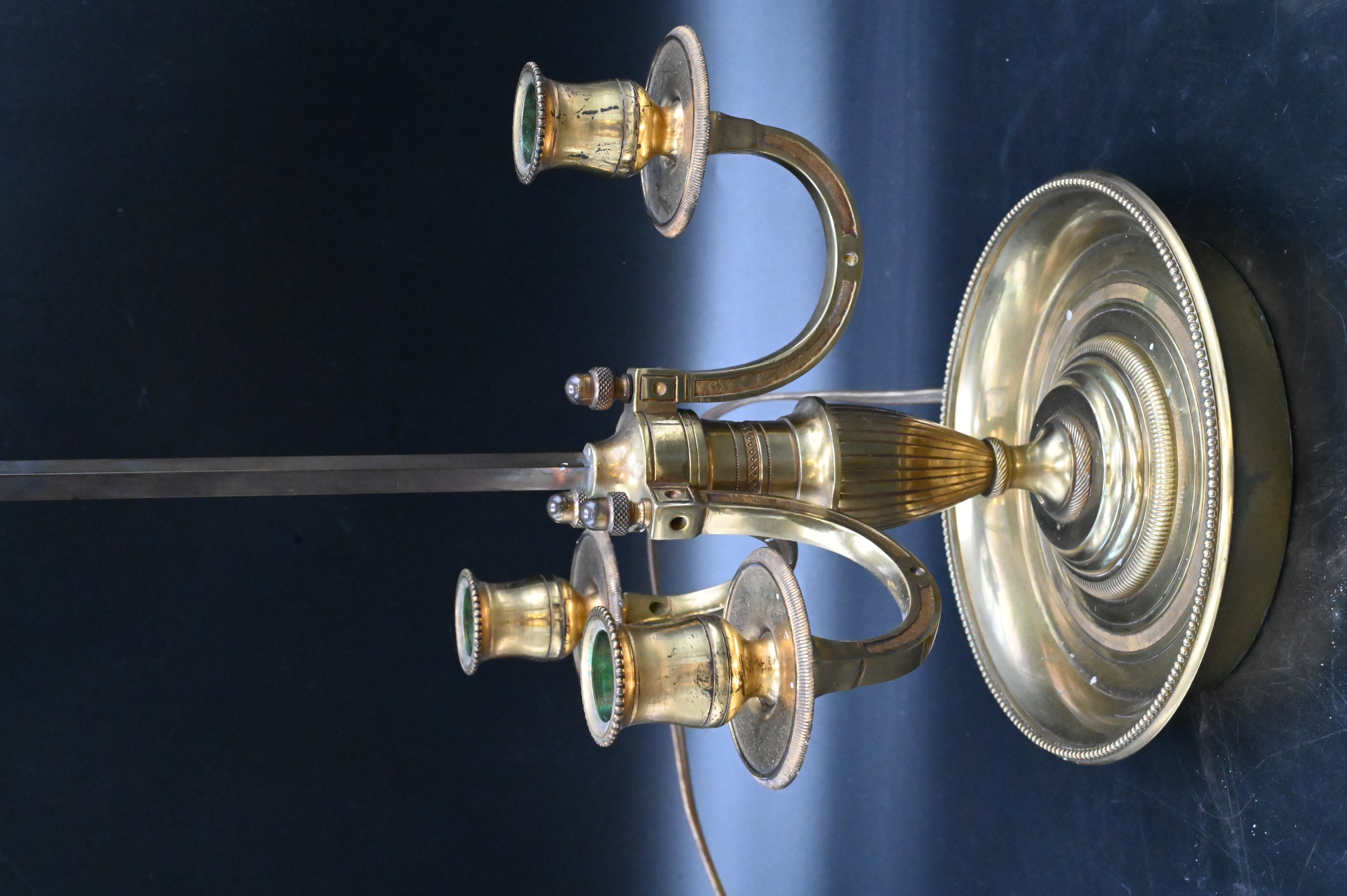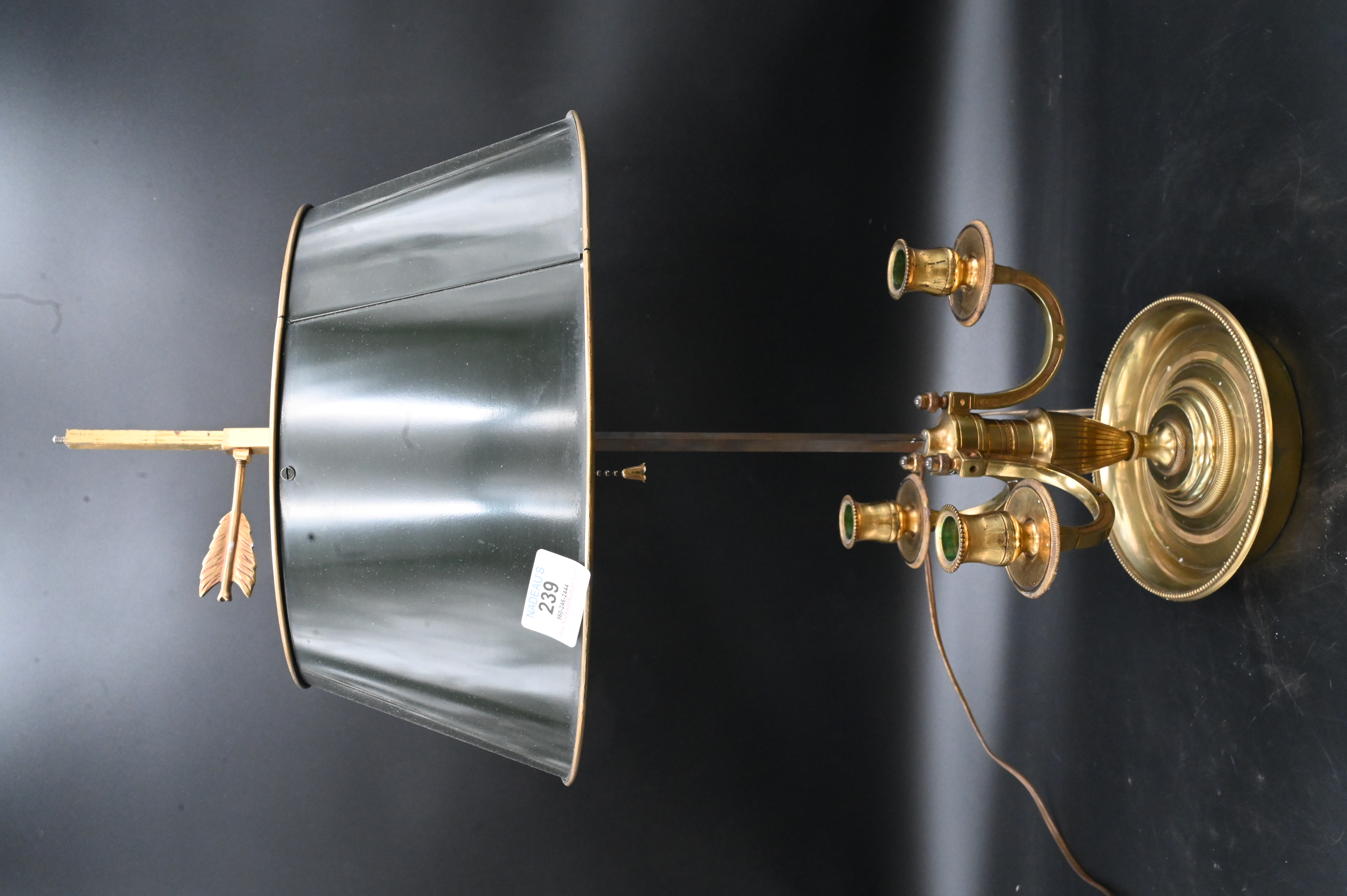 Bouillet Table Lamp, having green tole shade, brass, three candle brackets, height 25 inches.