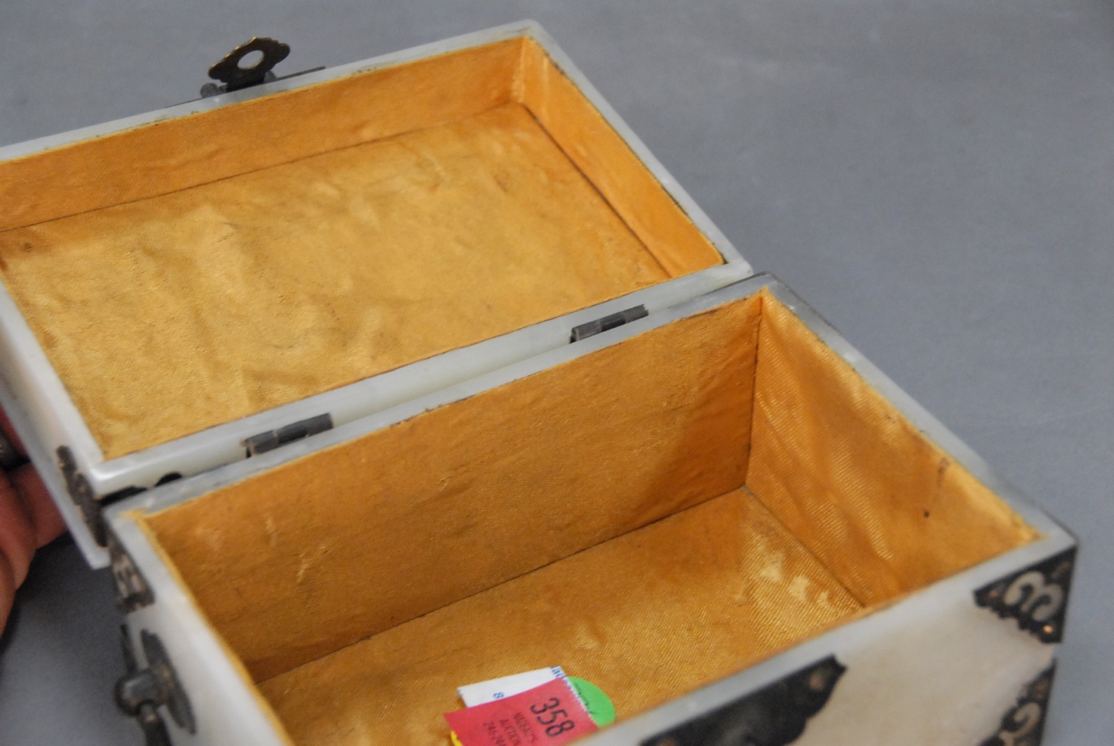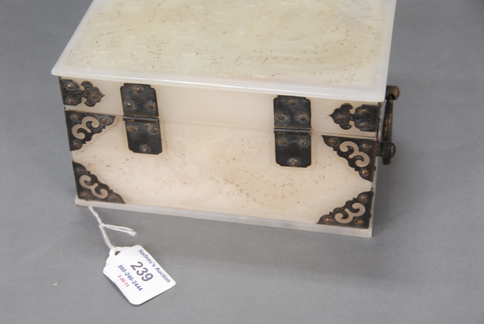 Chinese white jade box and cover, silver corners and lock, dragon and phoenix in relief.