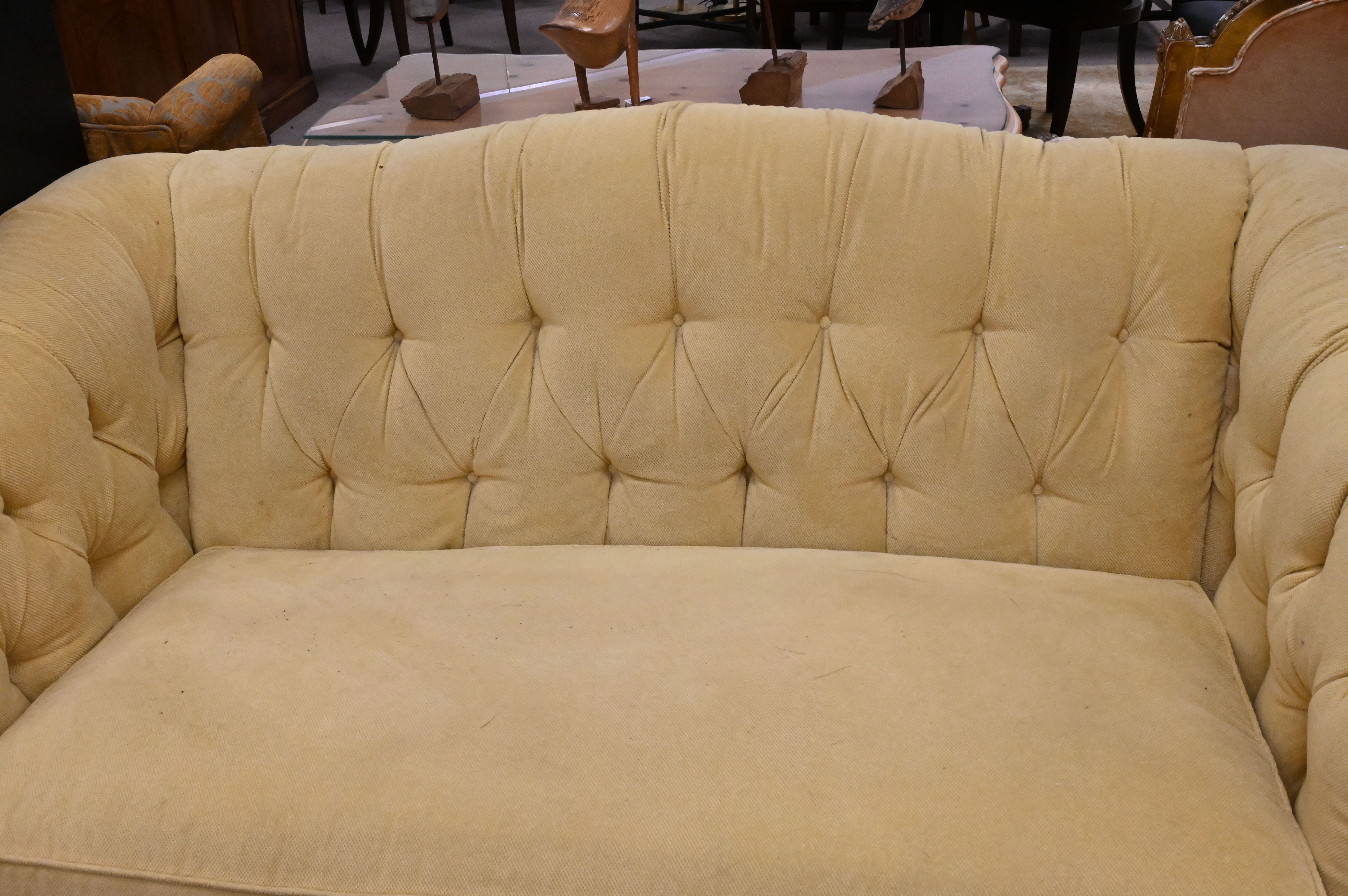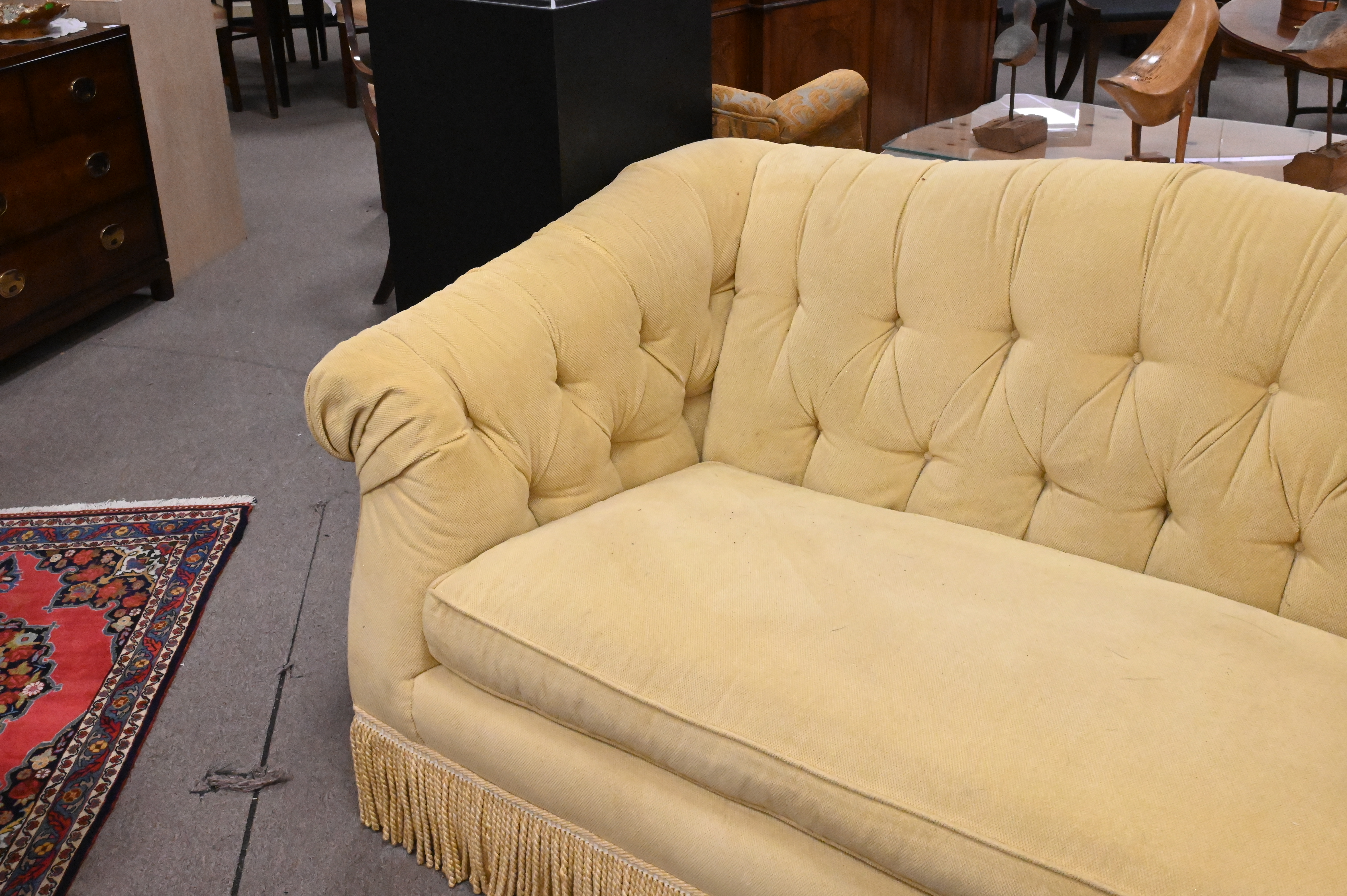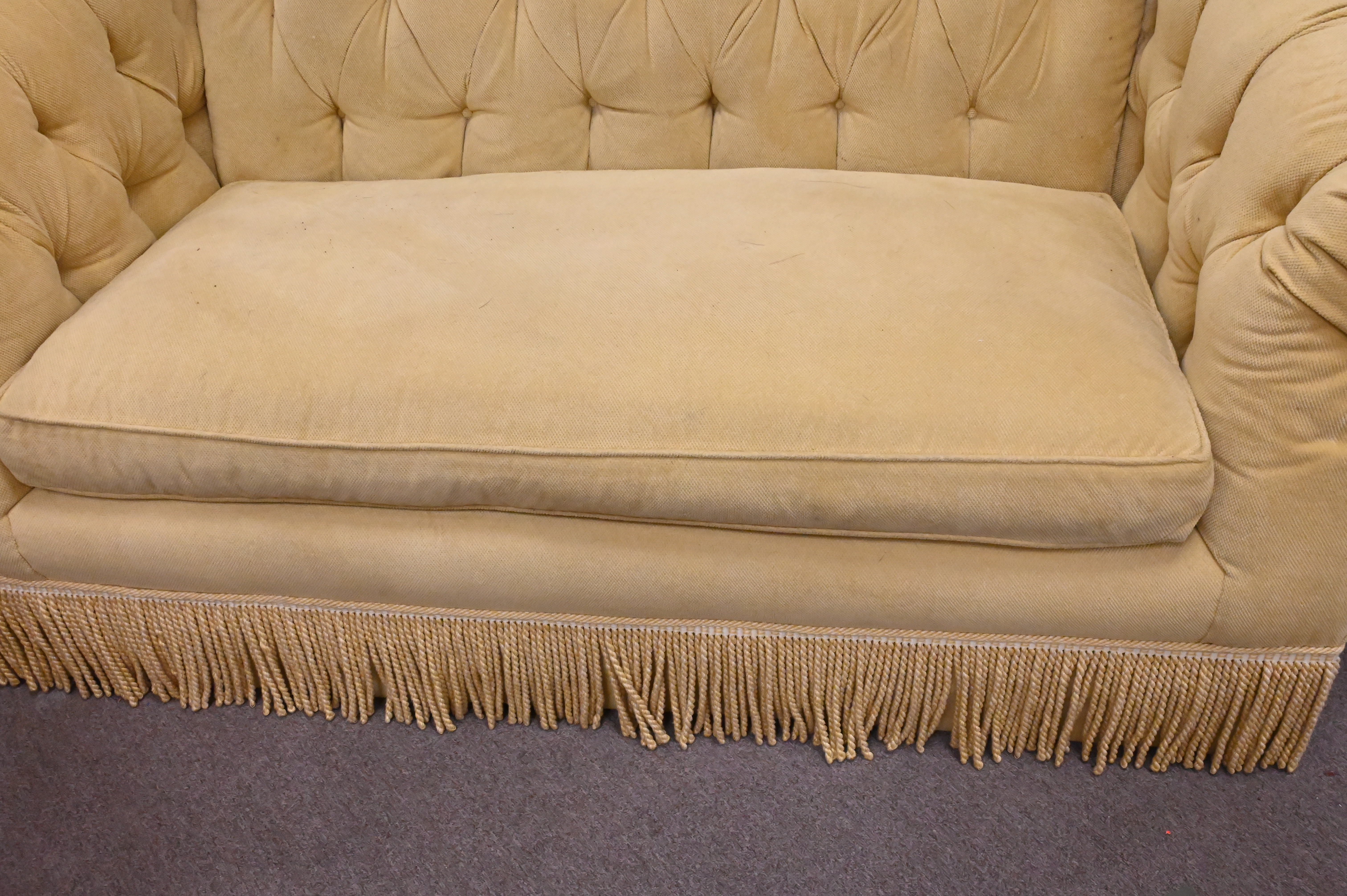 Edward Ferrell Upholstered Loveseat, having tufted back and fringe skirt, minor soiling, height 35 inches, length 66 inches, depth 38 inches.