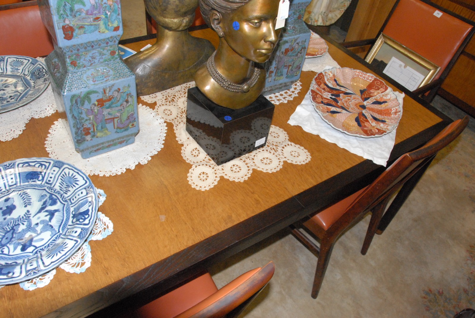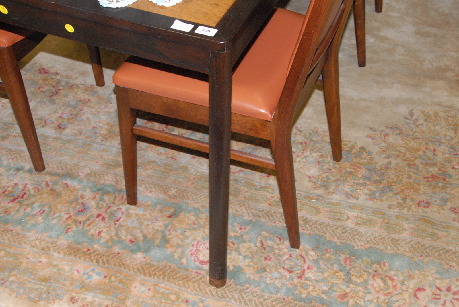 Edward Wormley, for Dunbar dining table with ebonized finish and inset walnut veneer, panel top, with two leaves in storage rack.