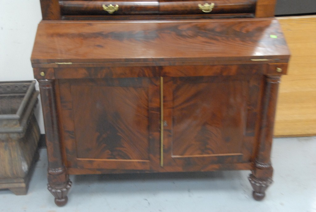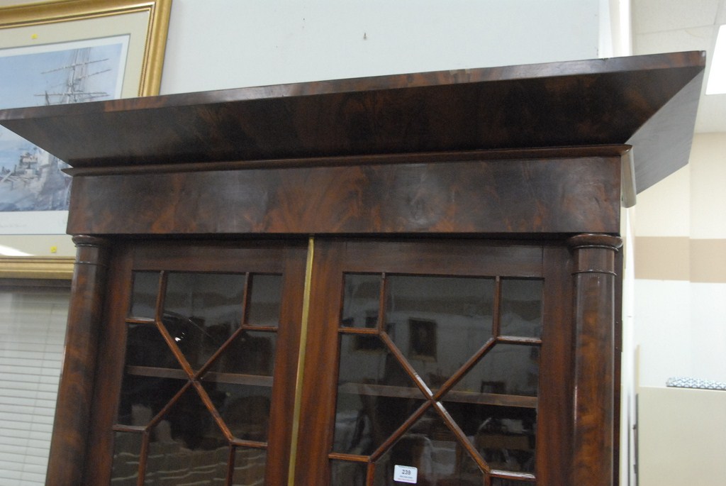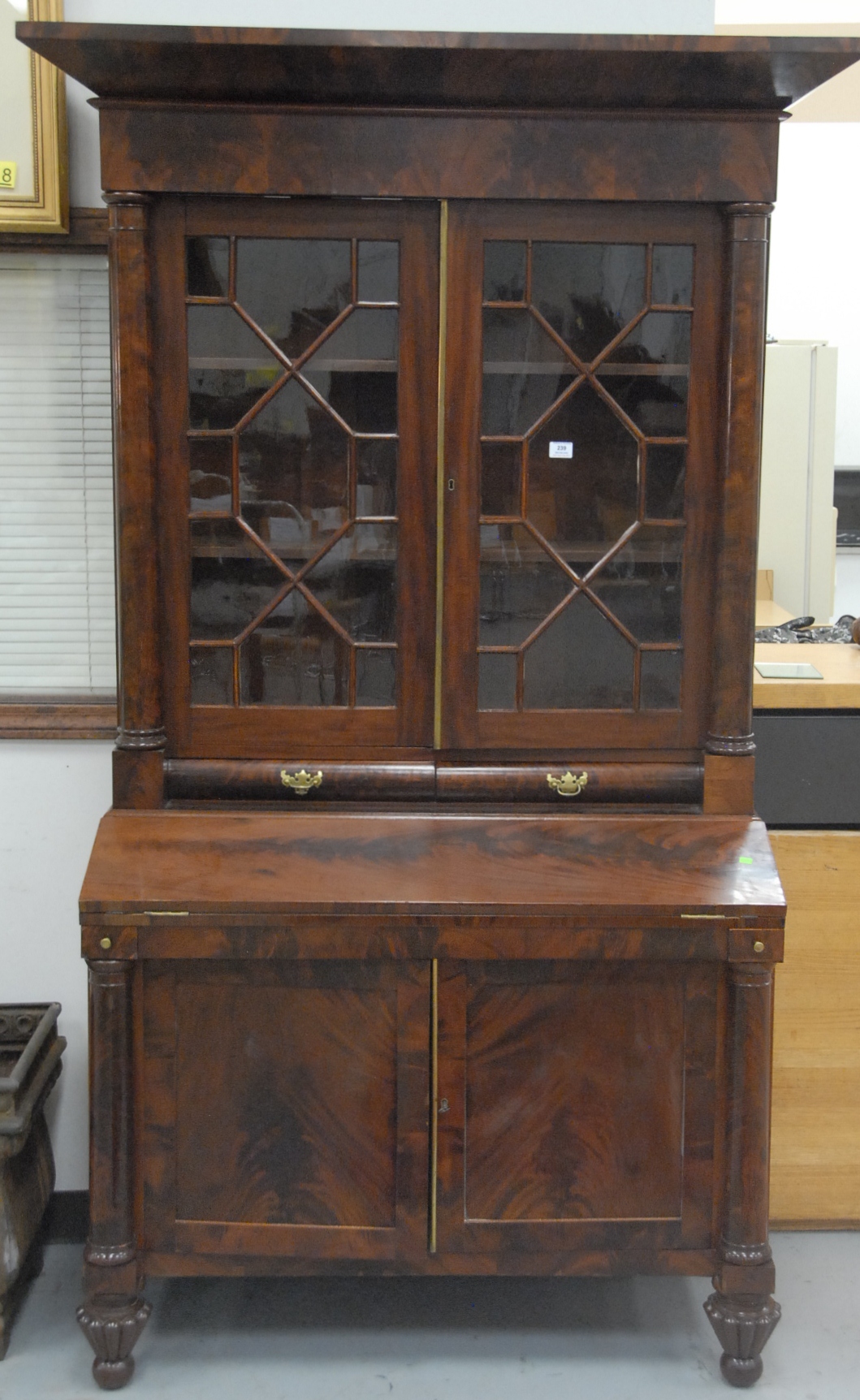 Lot 239: Empire mahogany secretary bookcase in two parts upper section with large cornice molding over two glazed doors over two short drawer…