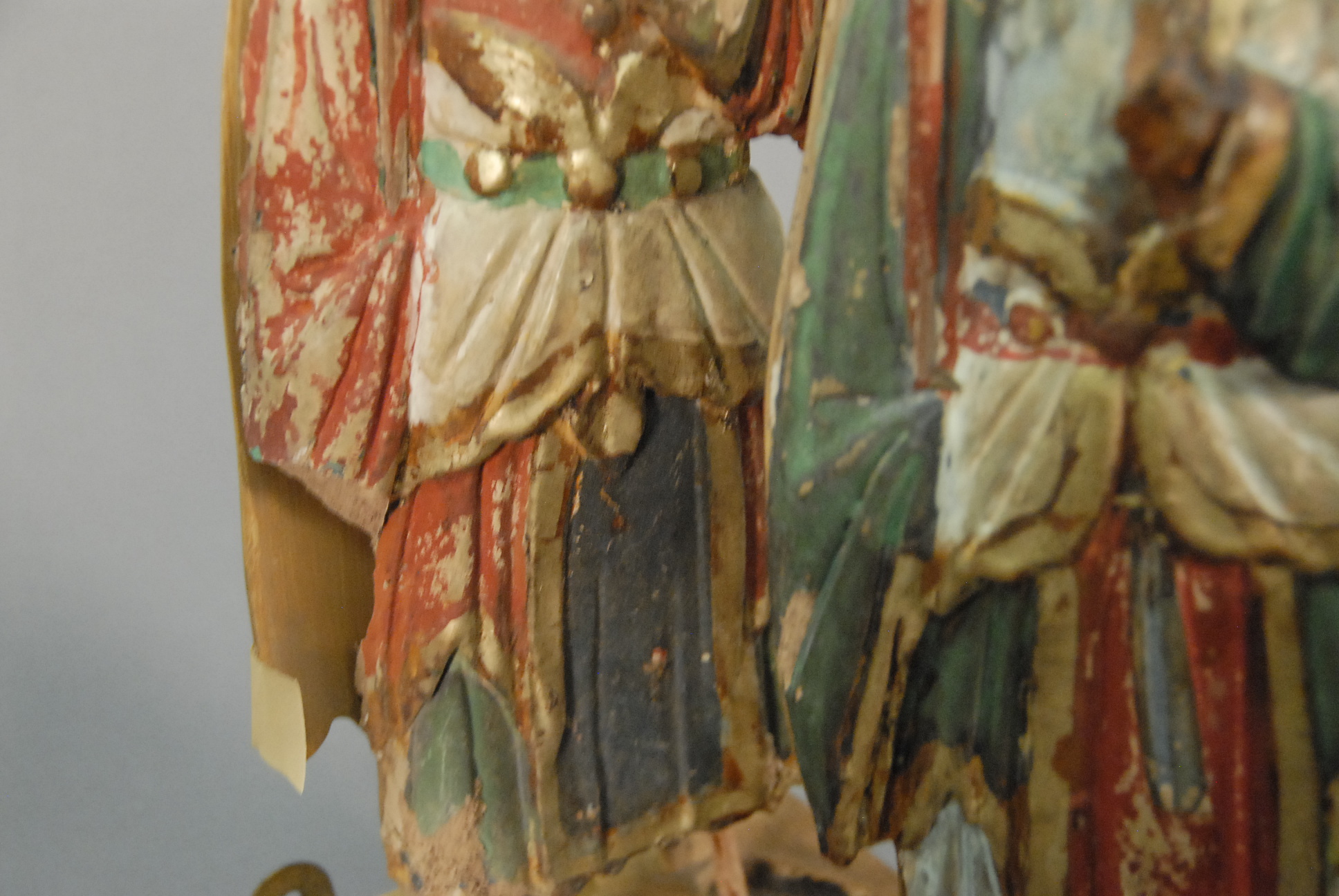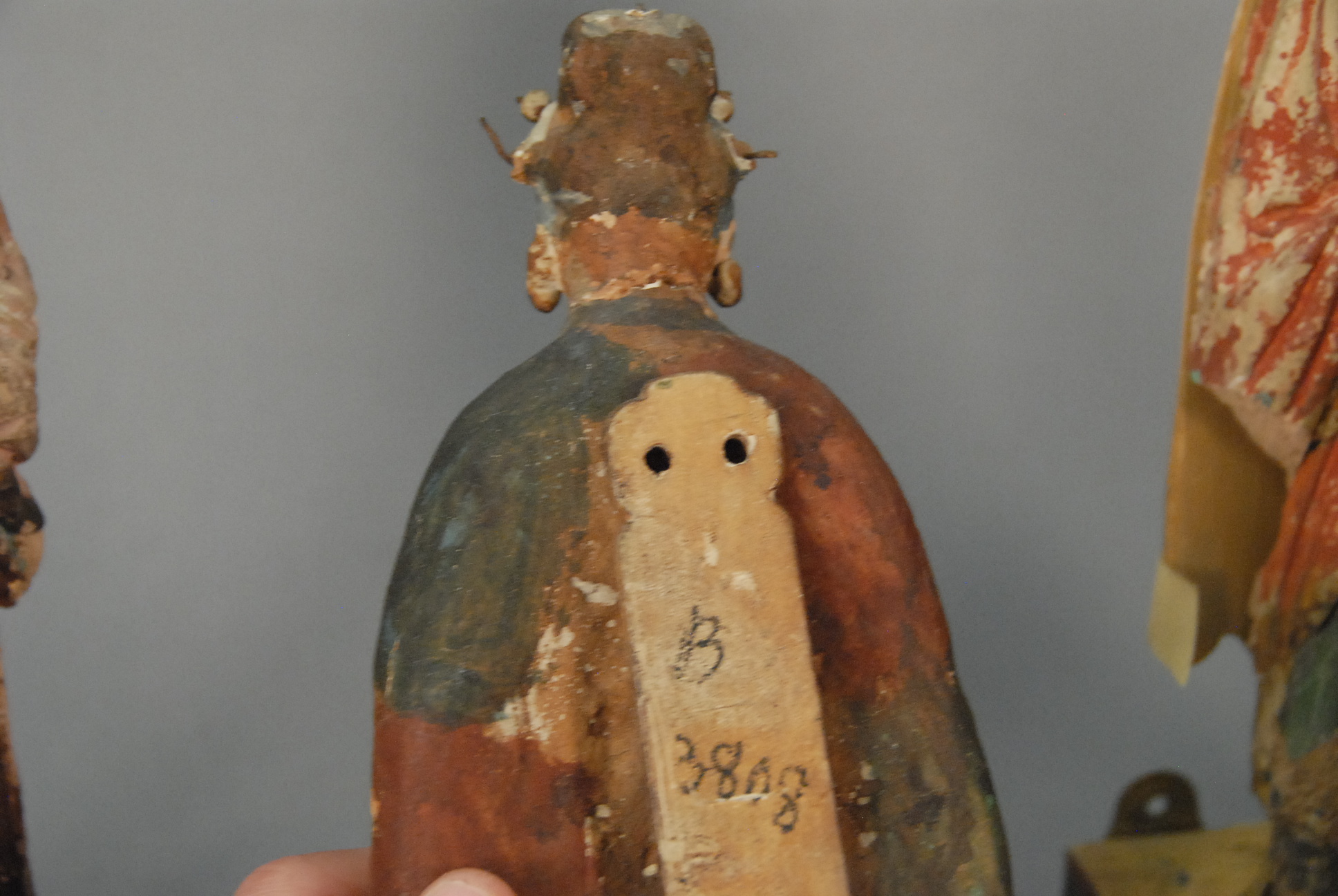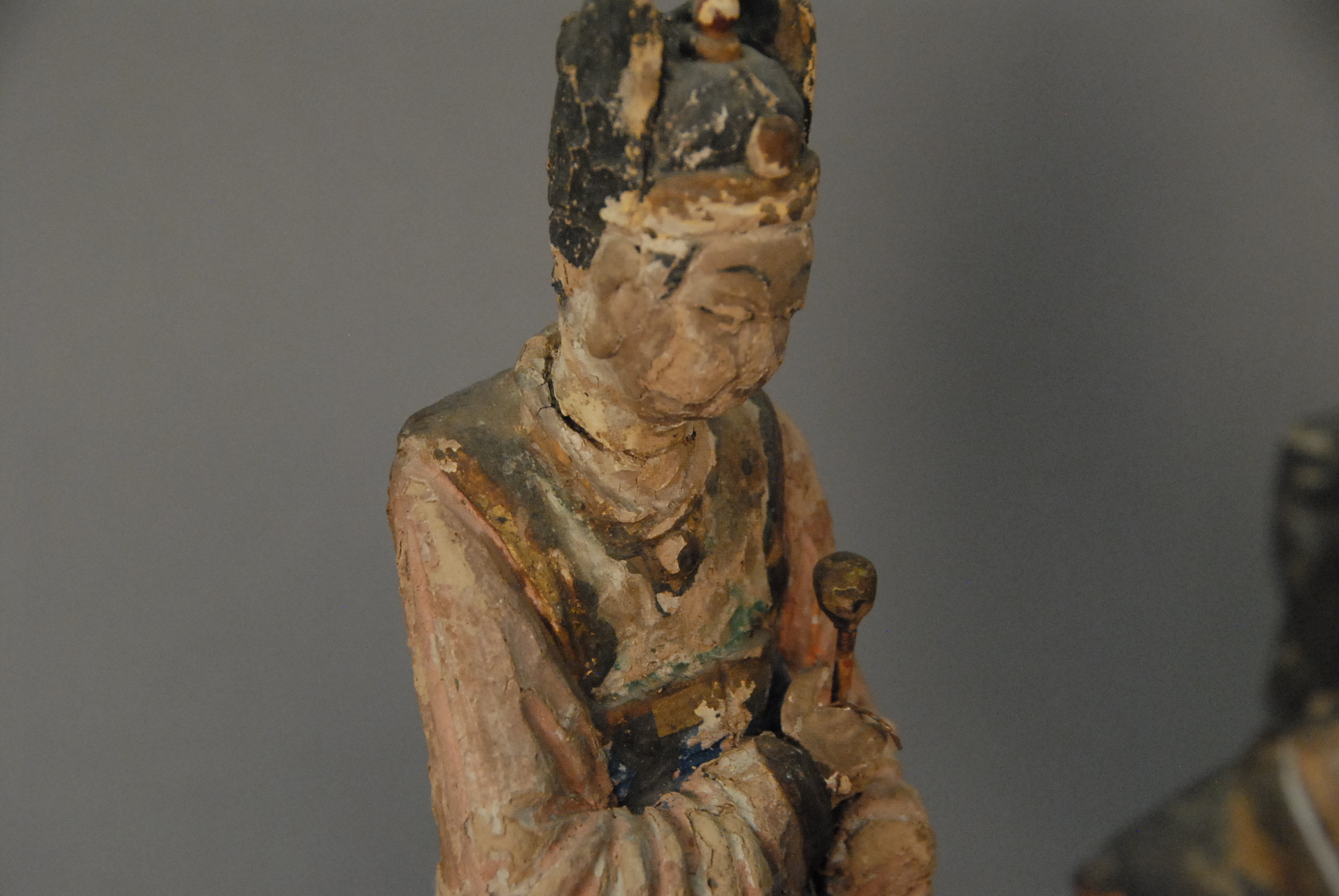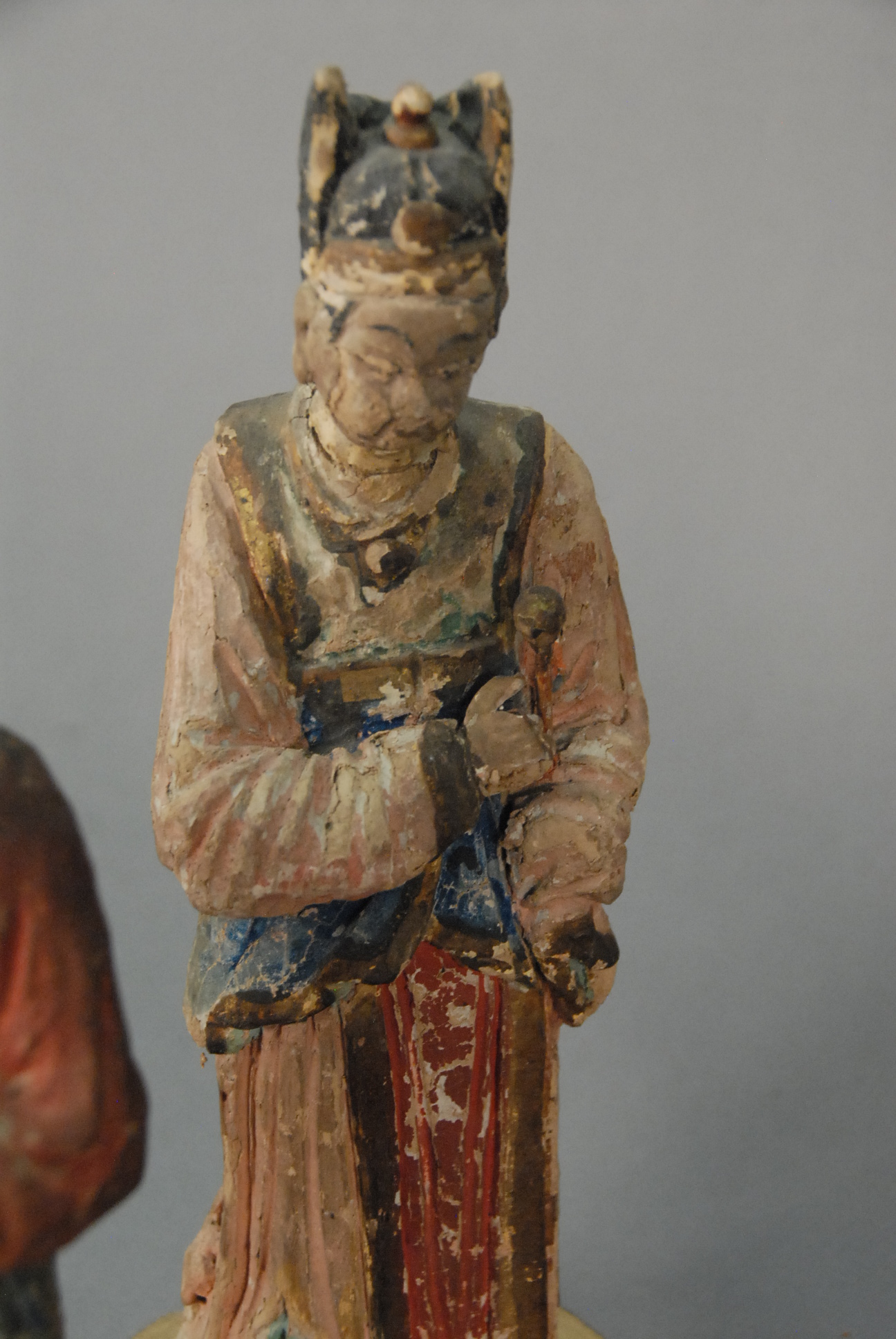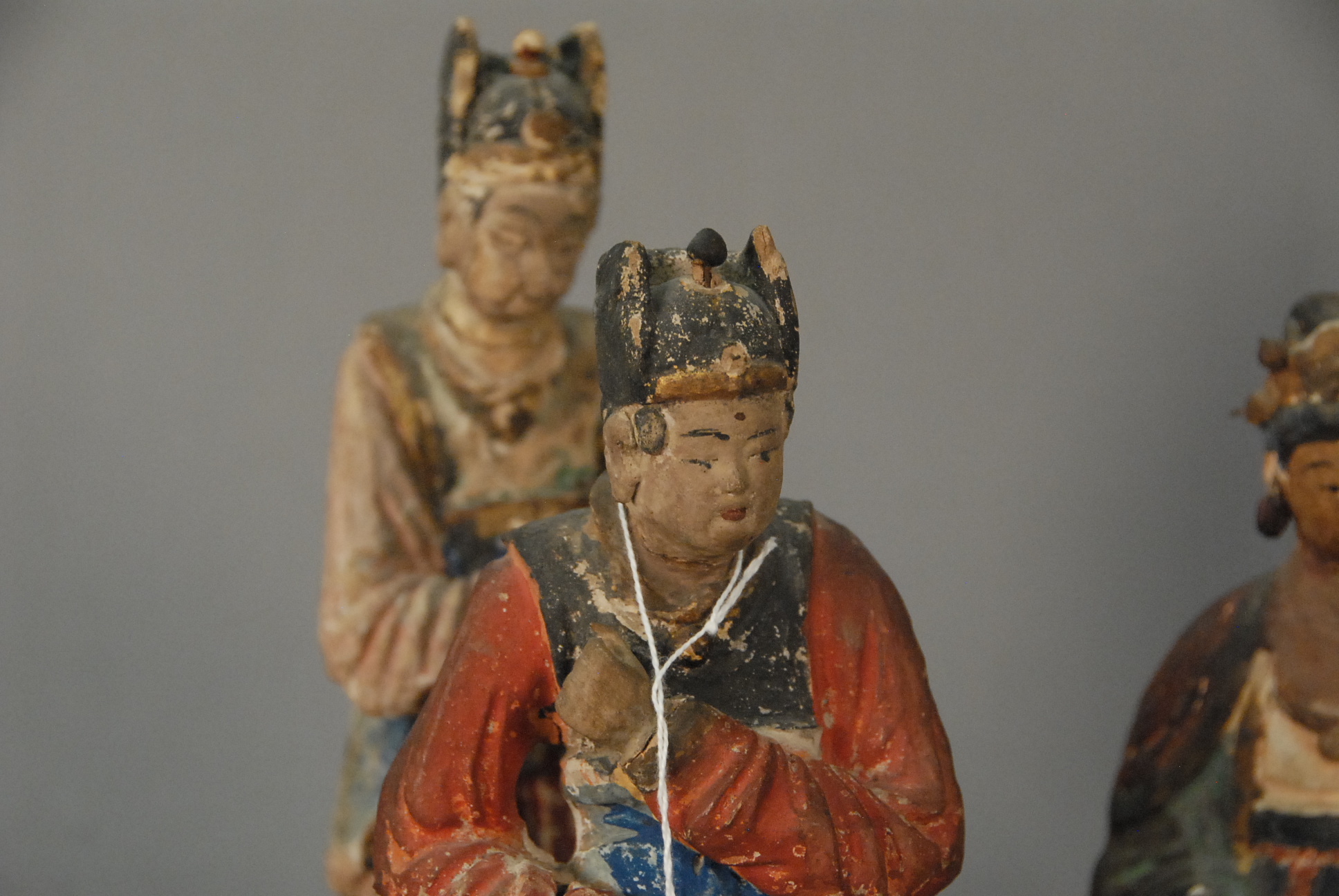 Lot 239: Group of six clay figures seated and standing attendants and dancers, with wood bases, China, 20th century one missing head as is ht. 8in. – 11in.