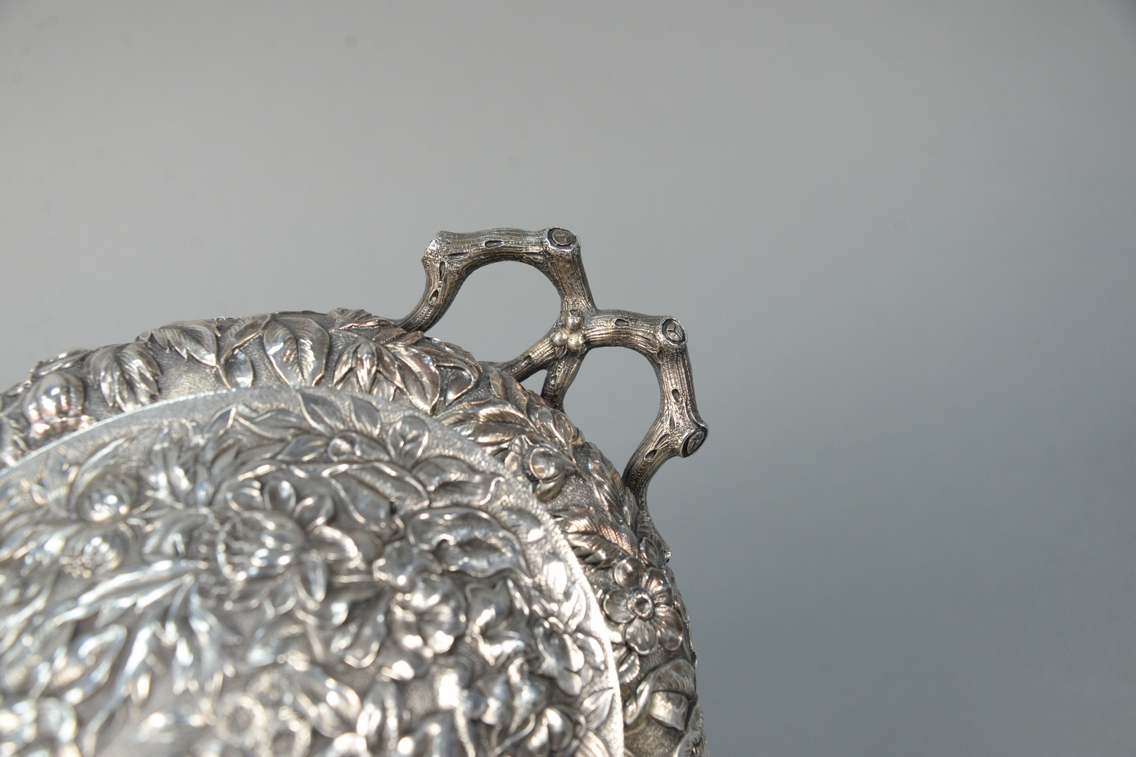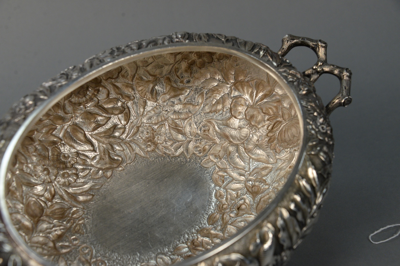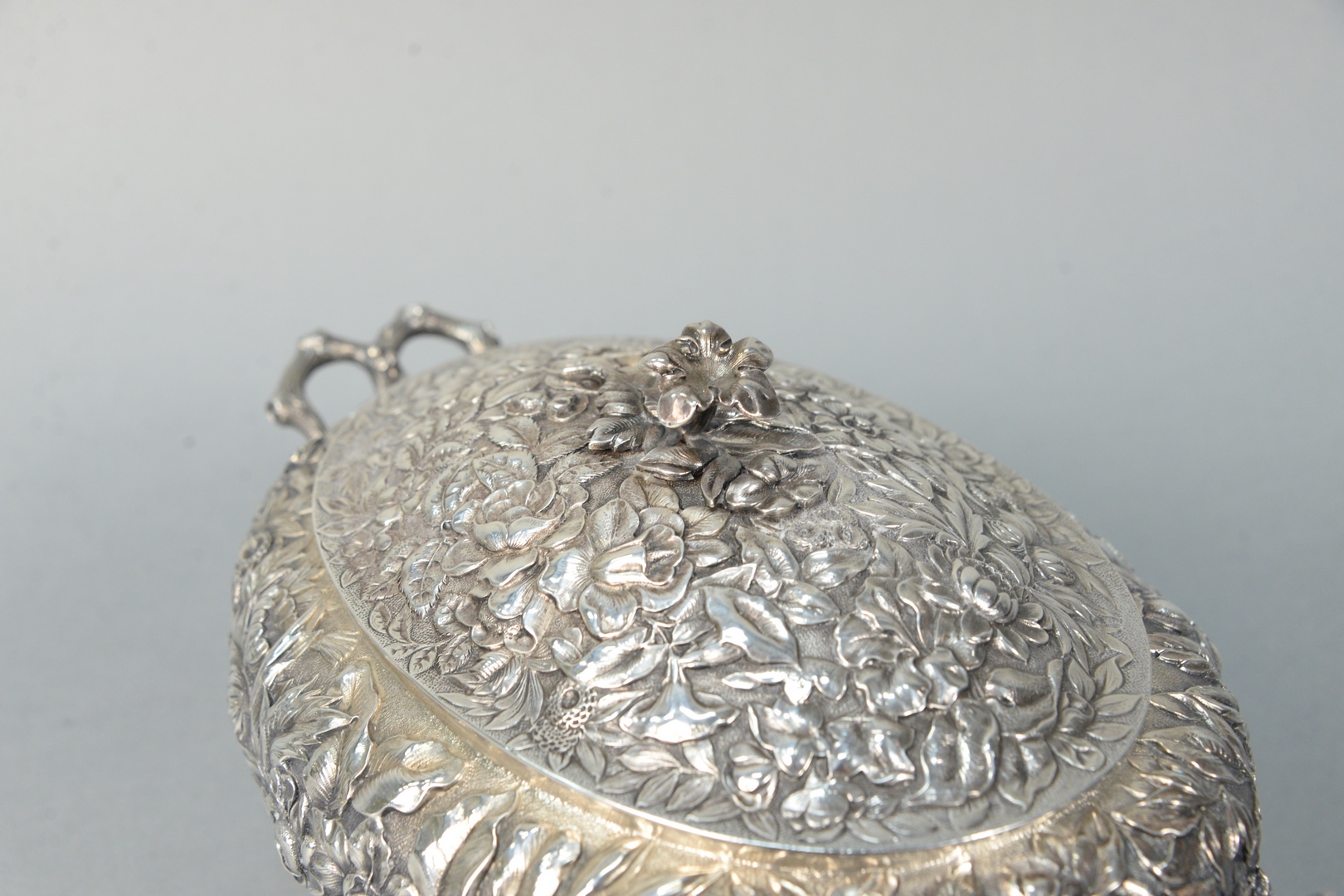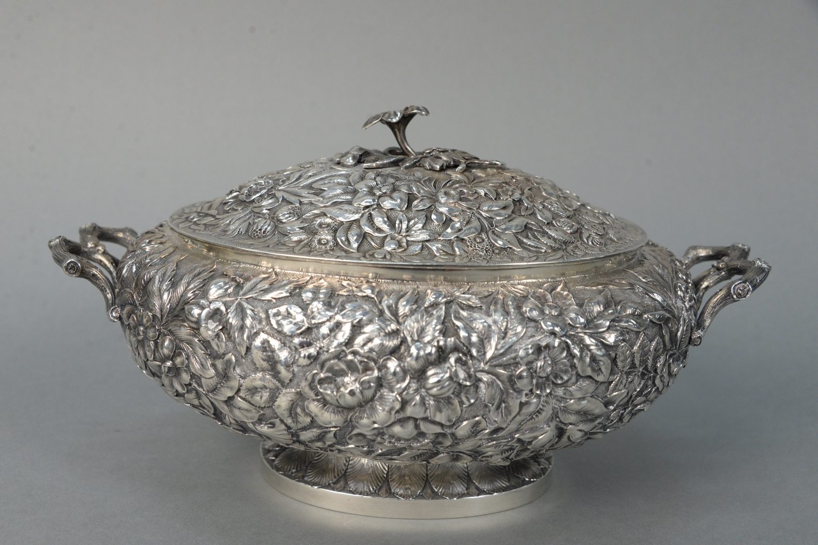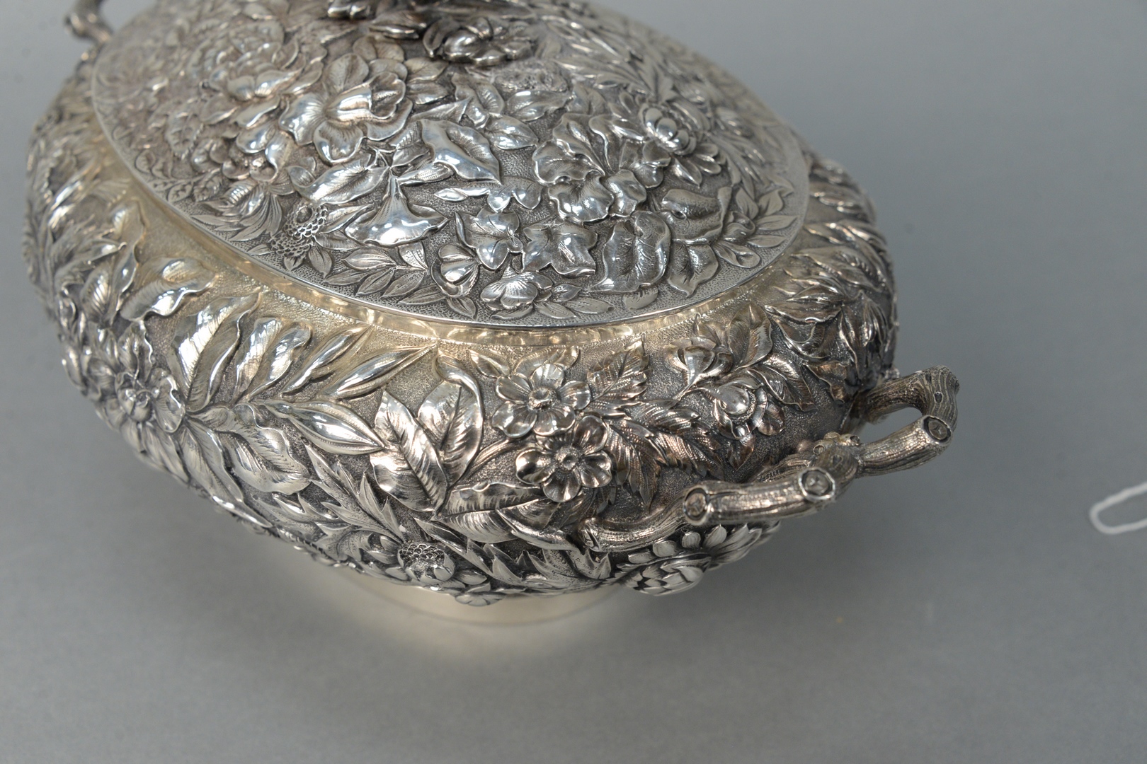 Lot 239: Large Sterling Repousse Covered Serving Dish having scrolling flowers, and leaves design, with flower finial handle on the cover, an…