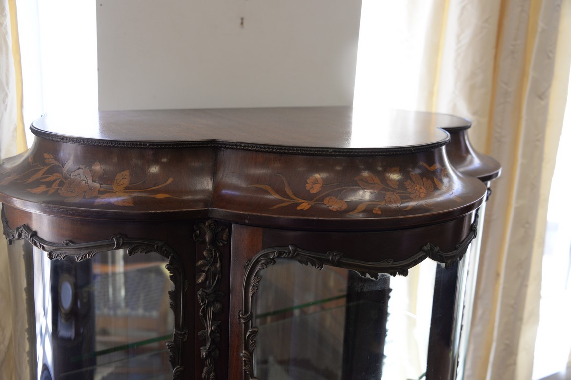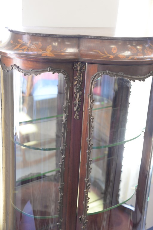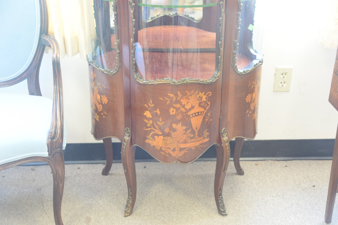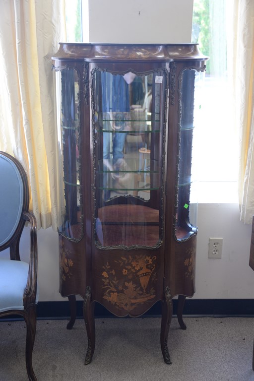 Lot 239: Marquetry inlaid Louis XV style curio cabinet with glass shelves and mirror back. ht. 56 1/2in., wd. 27in.