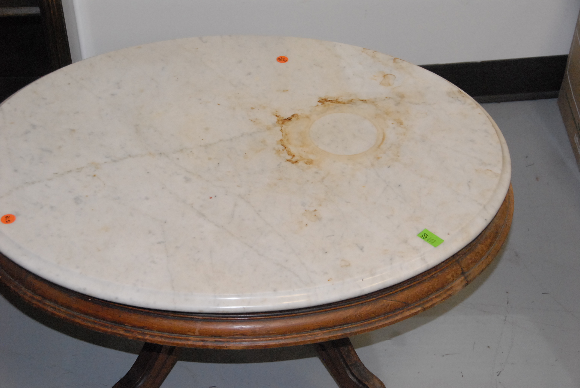Oval Victorian marble top table, cut down.