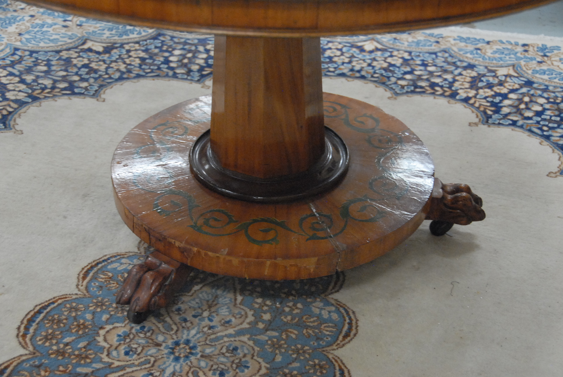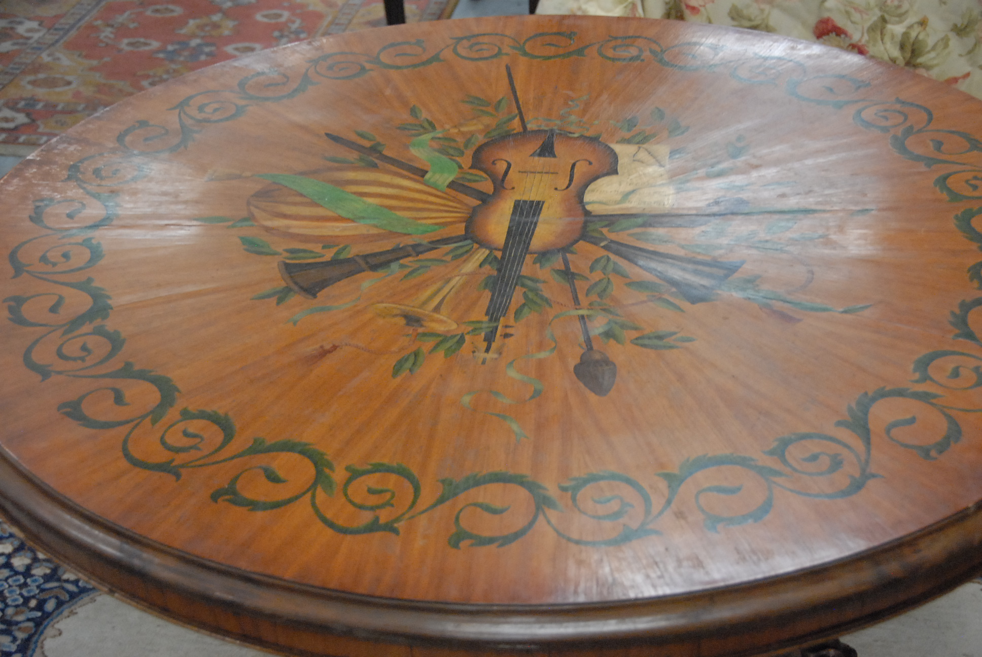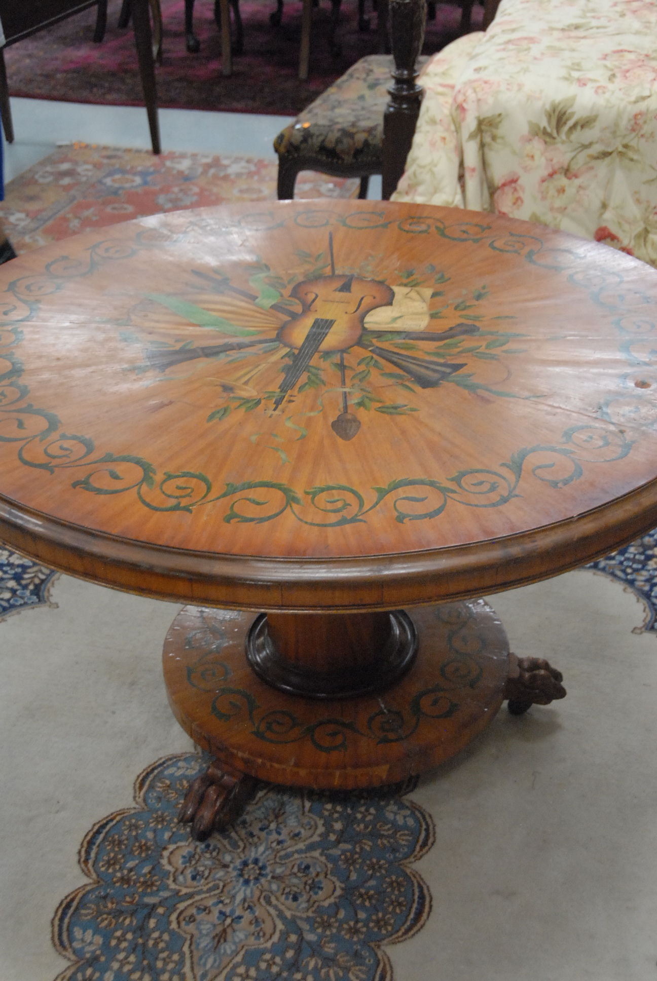 Pedestal table with paint decorated top veneer damage, ht. 29 in. dia. 47 in.