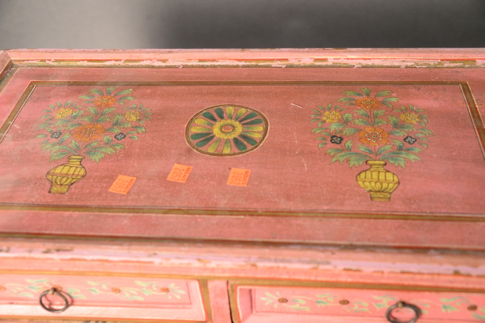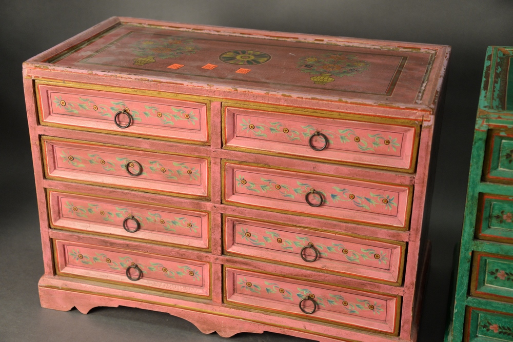 Lot 239: Two Diminutive Paint Decorated Chests, each having eight drawers, height 15 1/2 inches, width 23 inches, depth 12 1/4 inches.