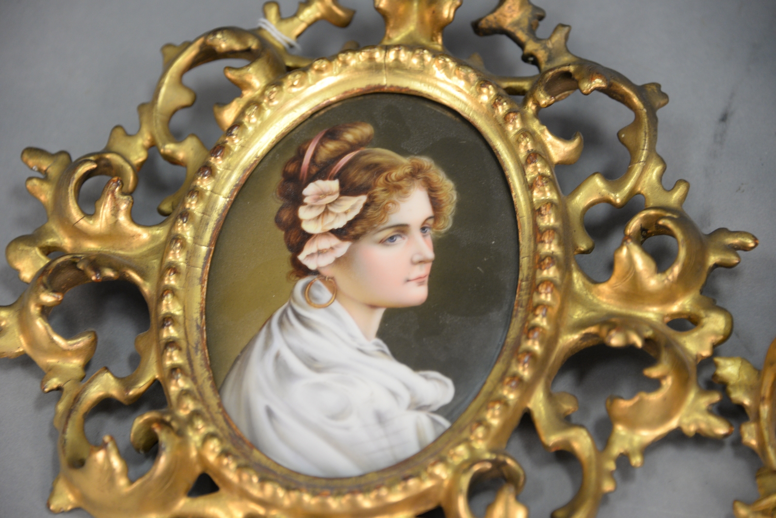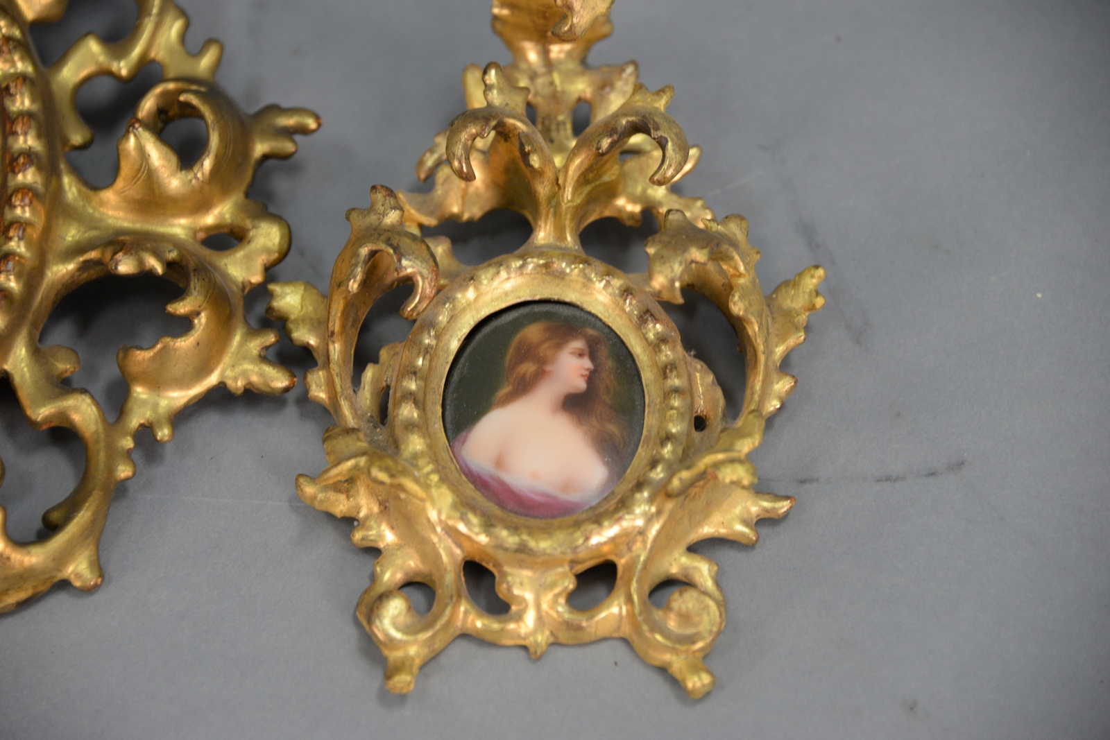 Lot 239: Two hand painted porcelain plaques bust of woman in rococo gilt frames. 9 x 8 & 3 1/4 x 4 1/4
