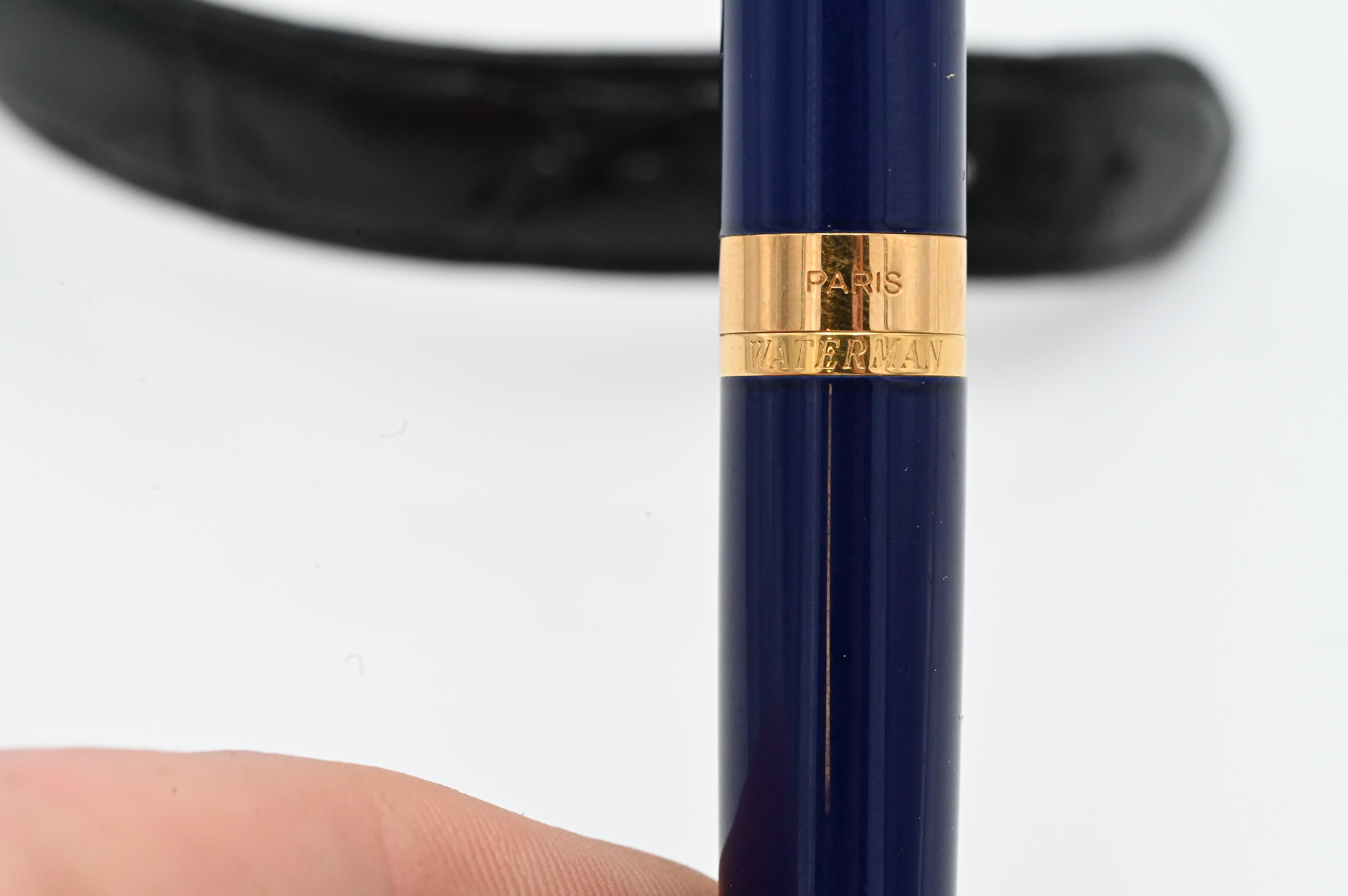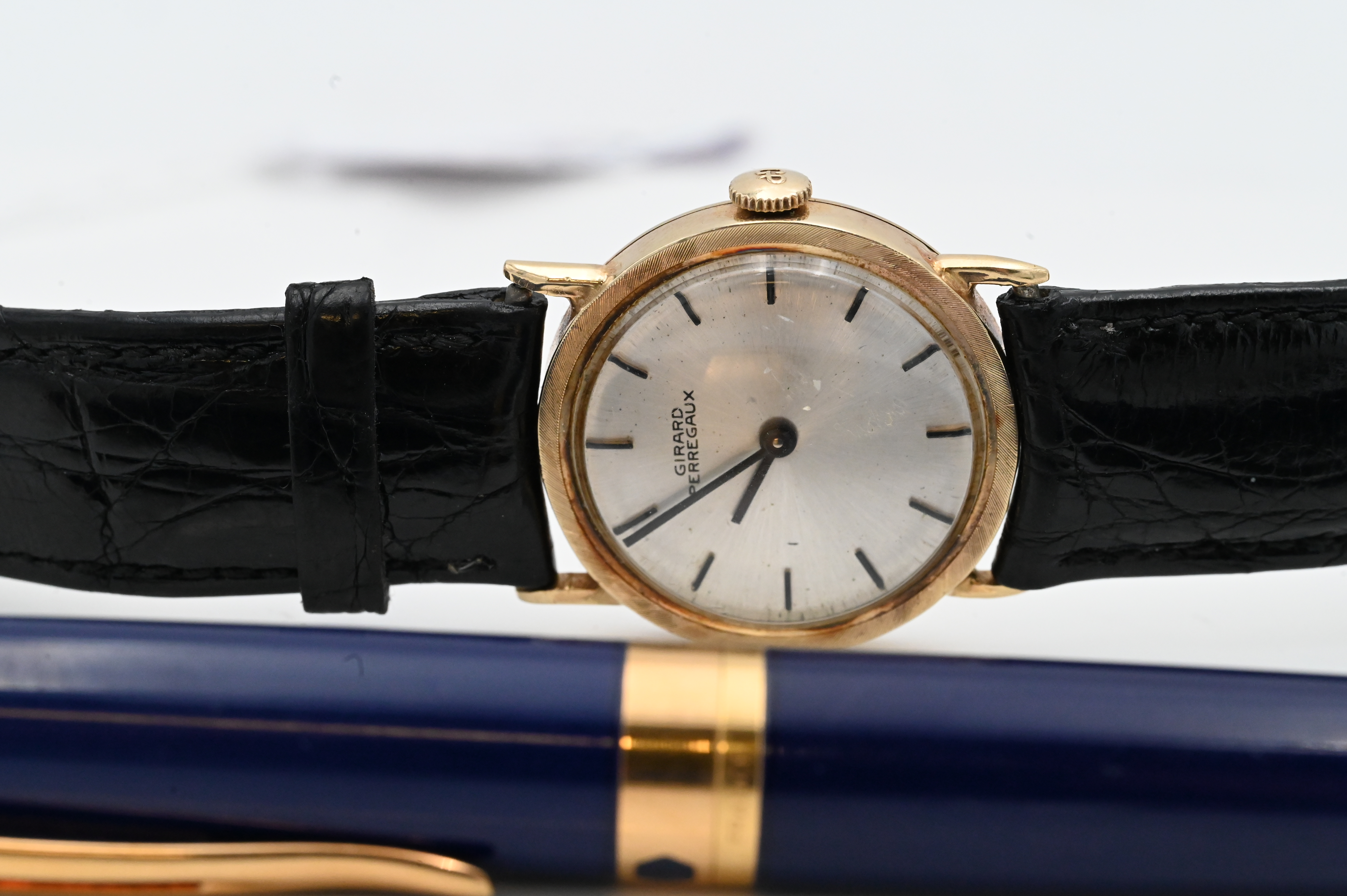 Two Piece Lot, to include a Girard Perregaux 14 karat yellow gold wristwatch, along with a Waterman pen marked Paris, trimmed in 18 karat yellow gold.