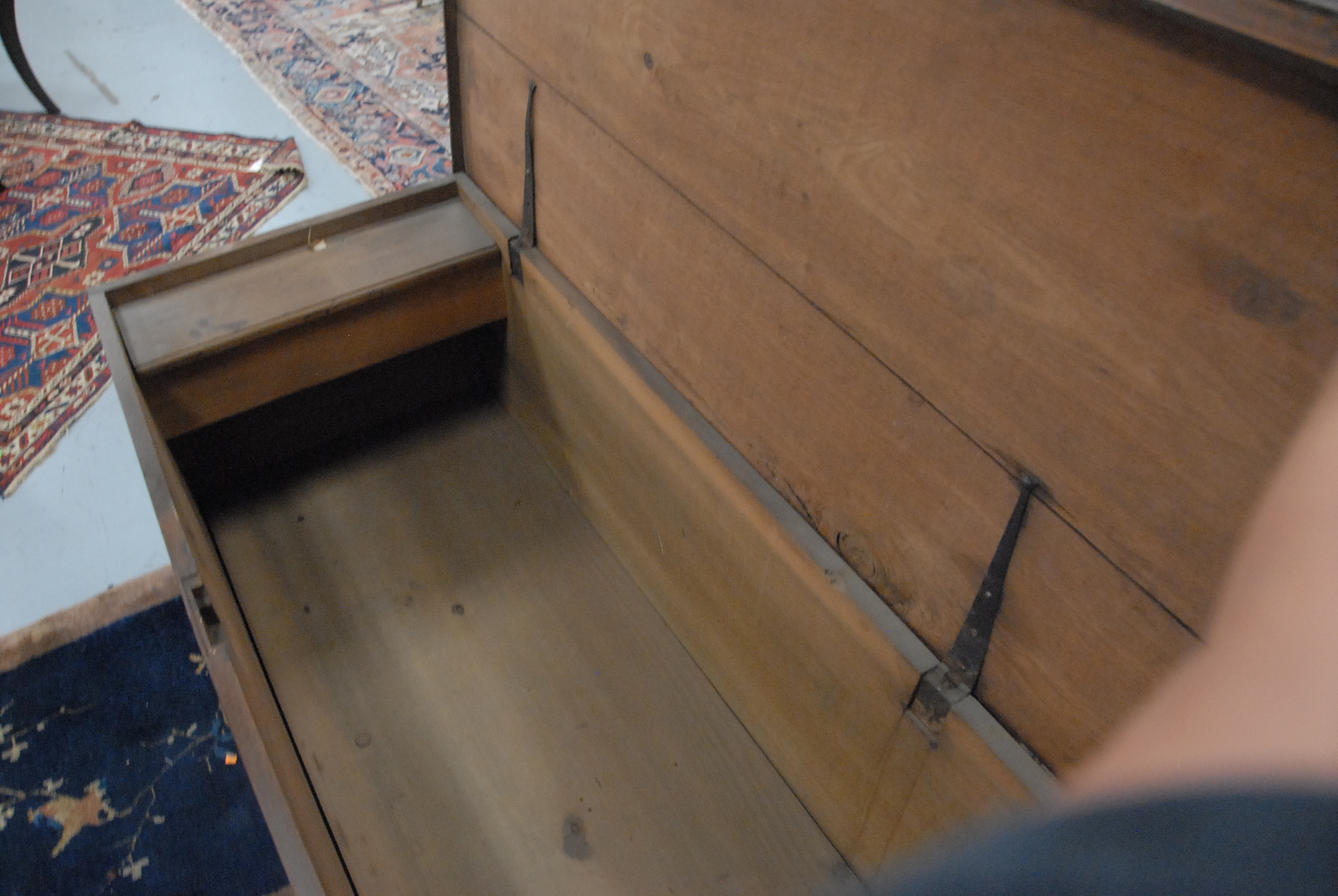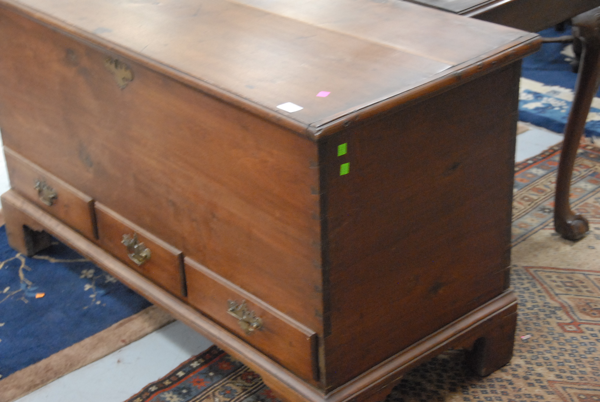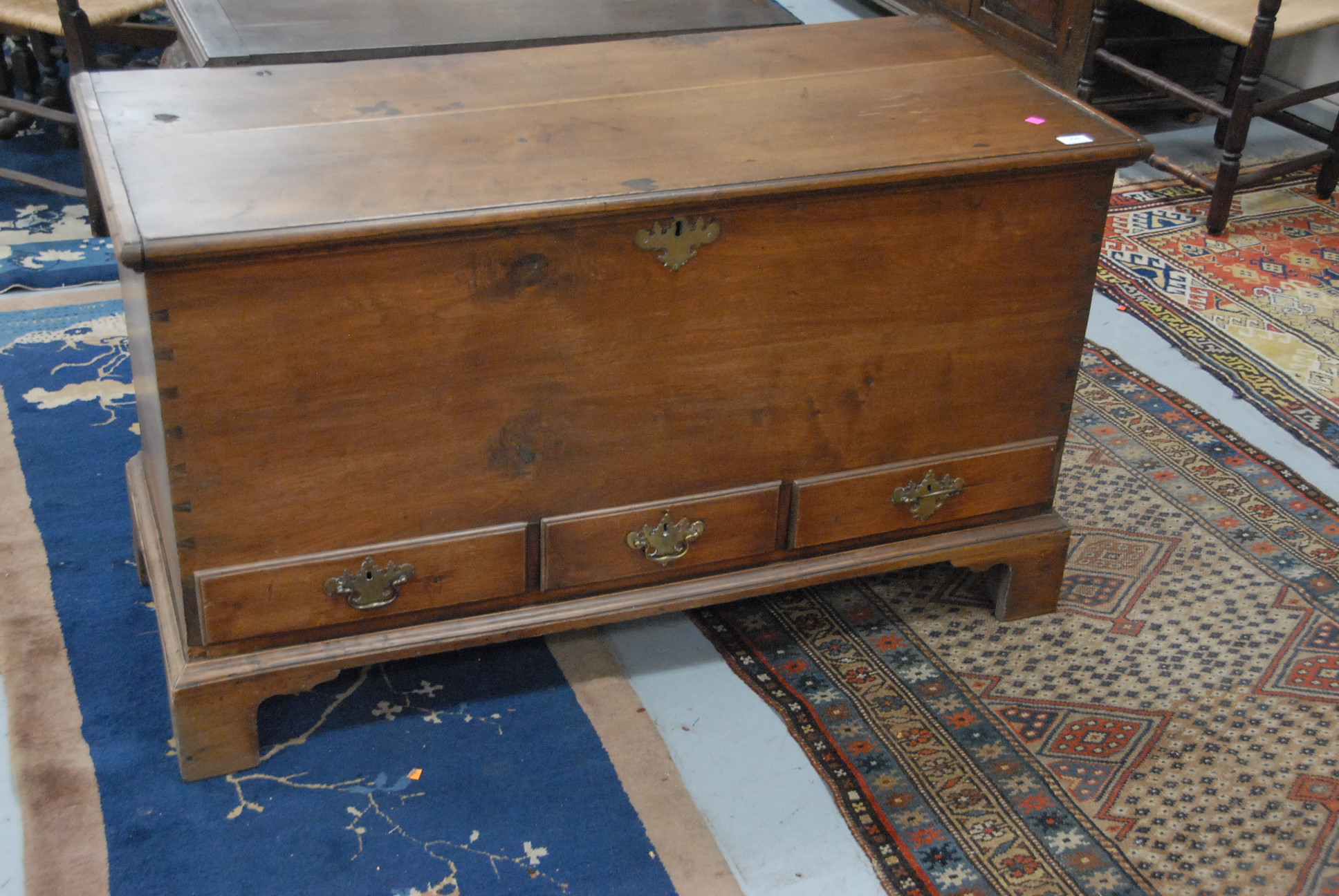 Lot 239: Walnut dower chest with lift top and three drawers on bracket base, 18th century. ht. 29in. wd. 47in.