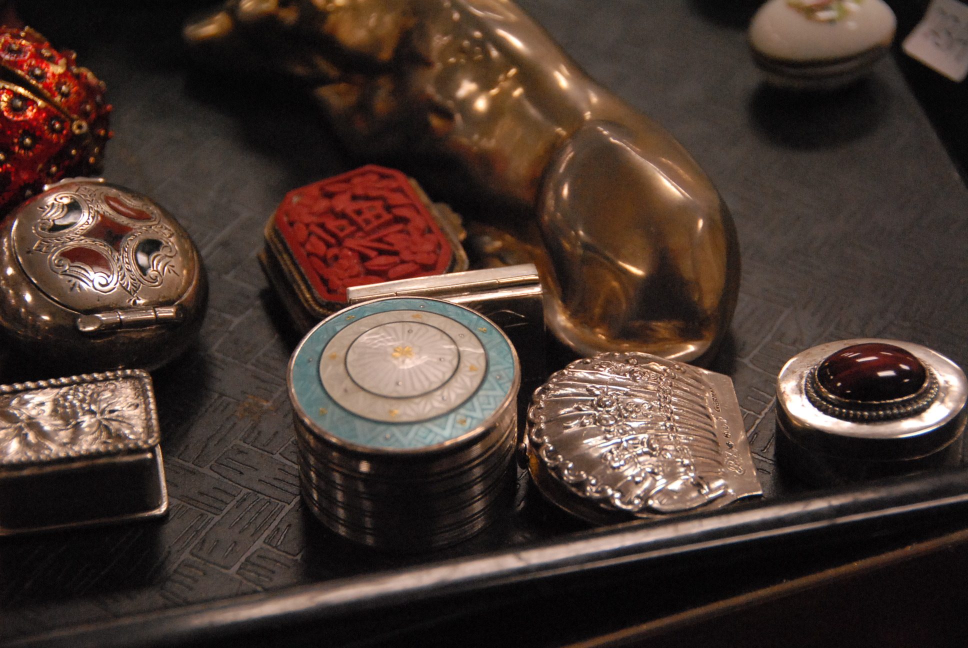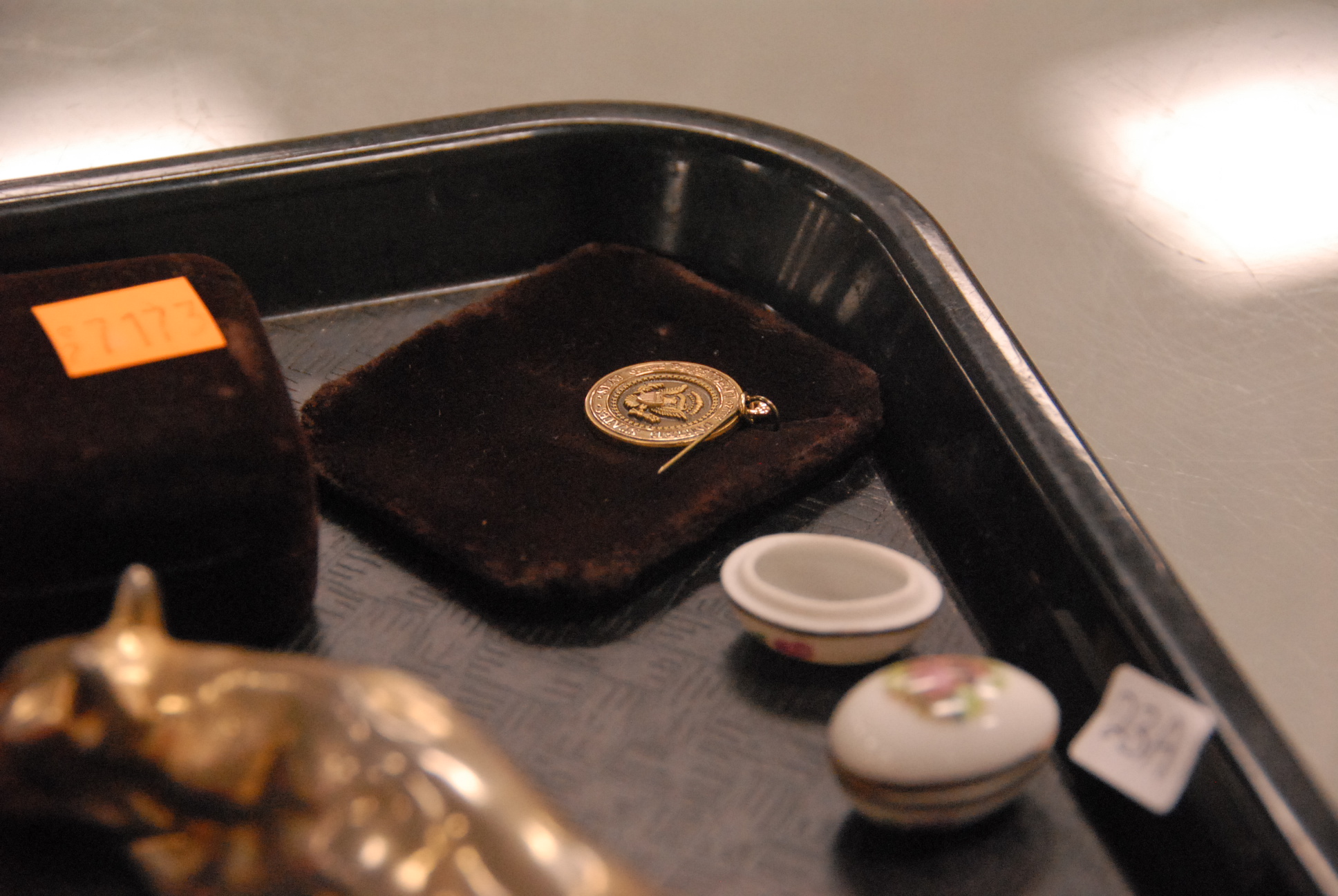 One box with silver enameled box, silver boxes, and two 10K presidential charms.