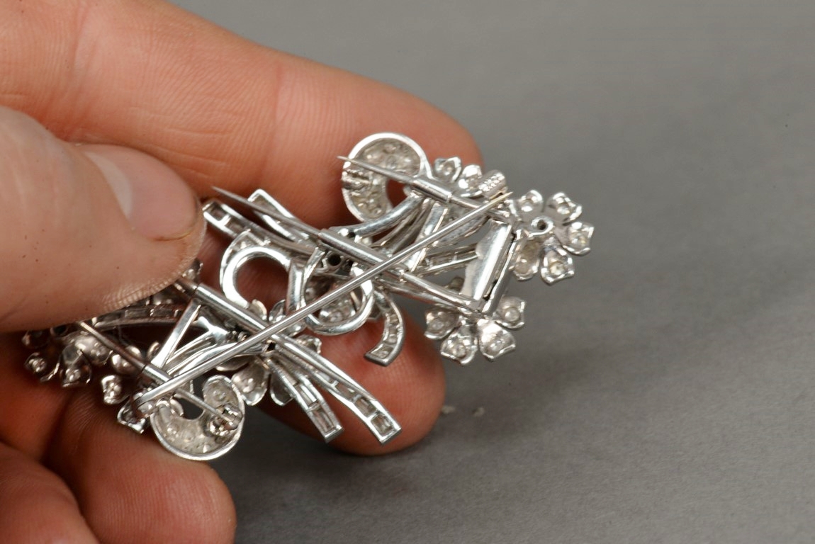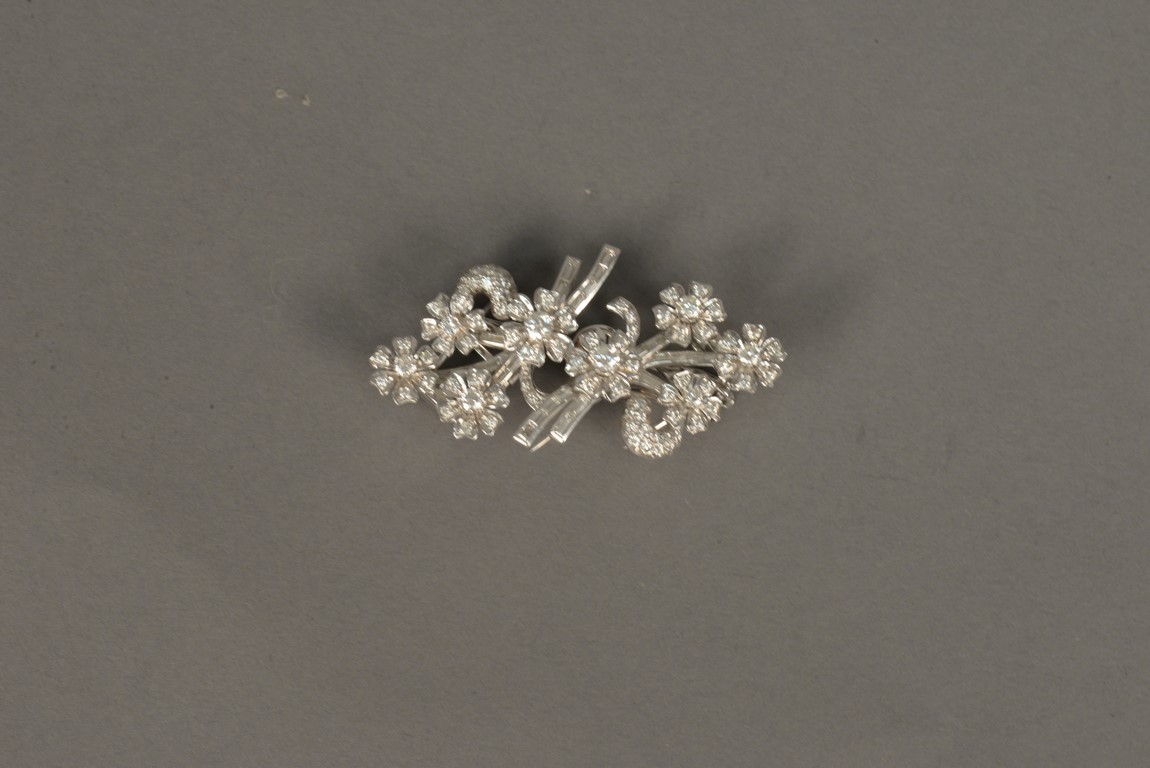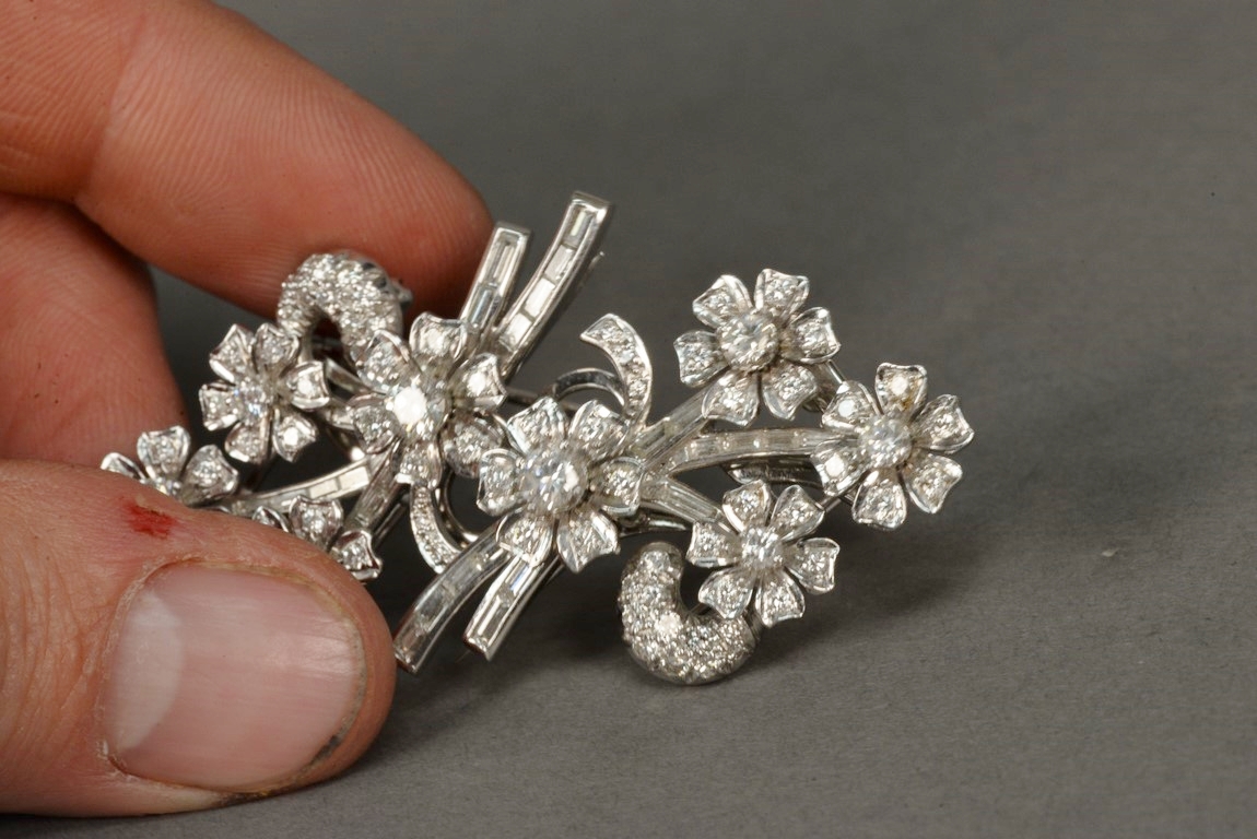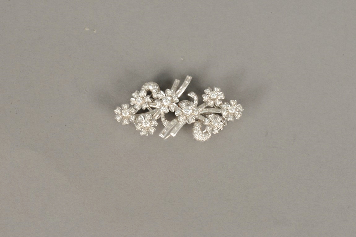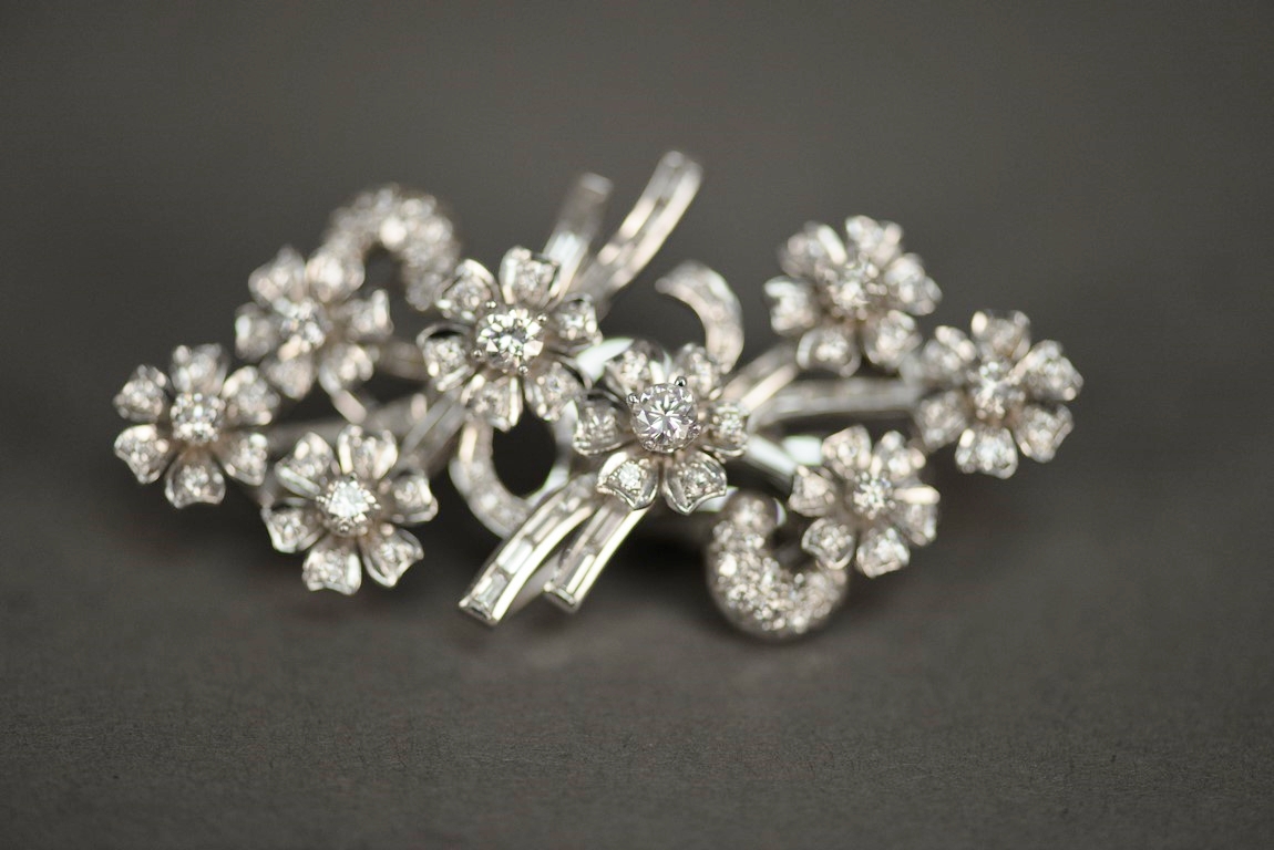 Lot 24: 14K white gold floral diamond pin with eight flowers, each with seven round diamonds. Total of twenty-six baguette diamonds, a total…