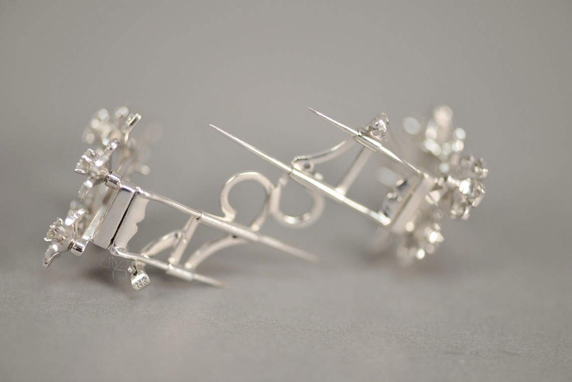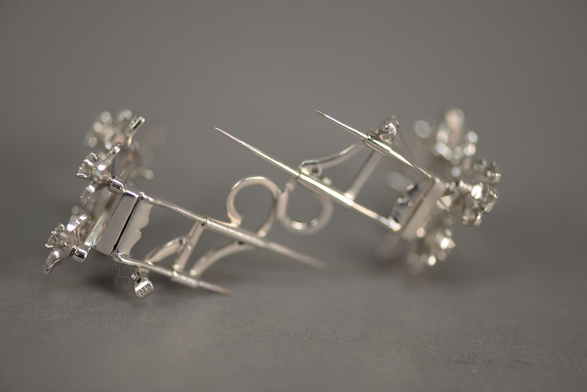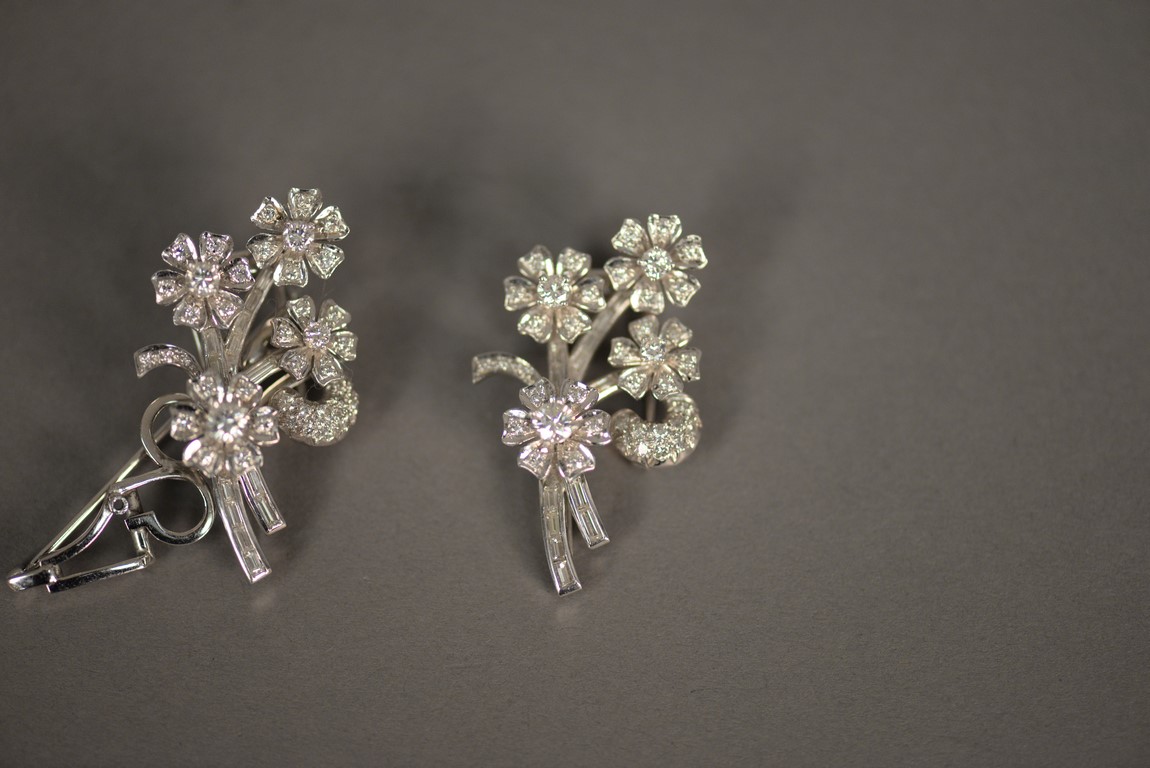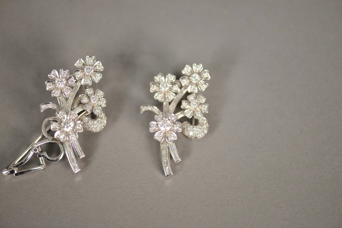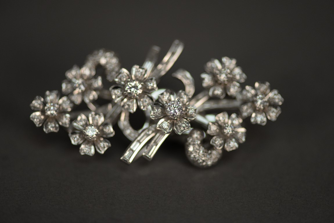 Lot 24: 14K white gold floral diamond pin with eight flowers, each with seven round diamonds. Total of twenty-six baguette diamonds, a total…