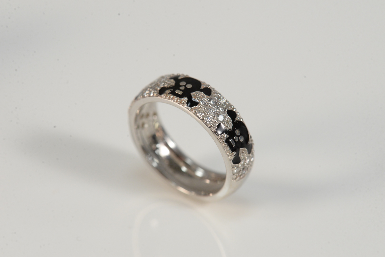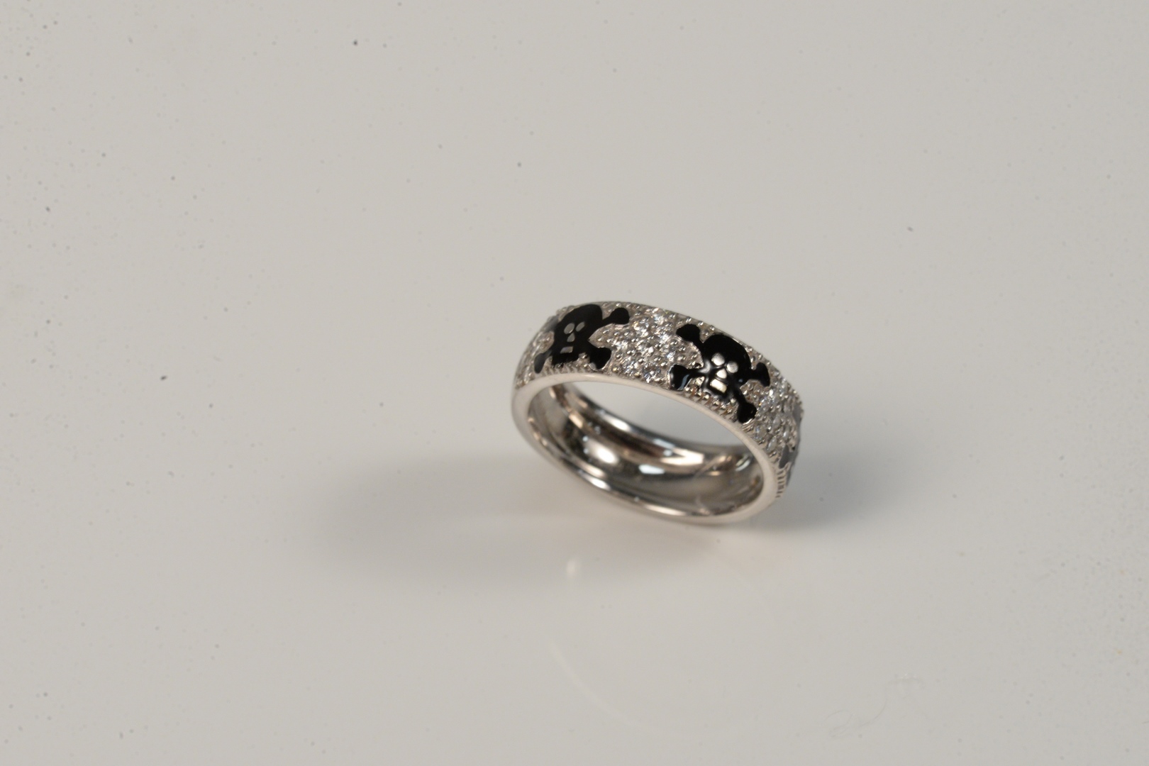 Lot 24: 18 Karat White Gold Hidalgo Ring with skull and crossbone enamel and pave diamonds size 6 1/2, 6.3 grams