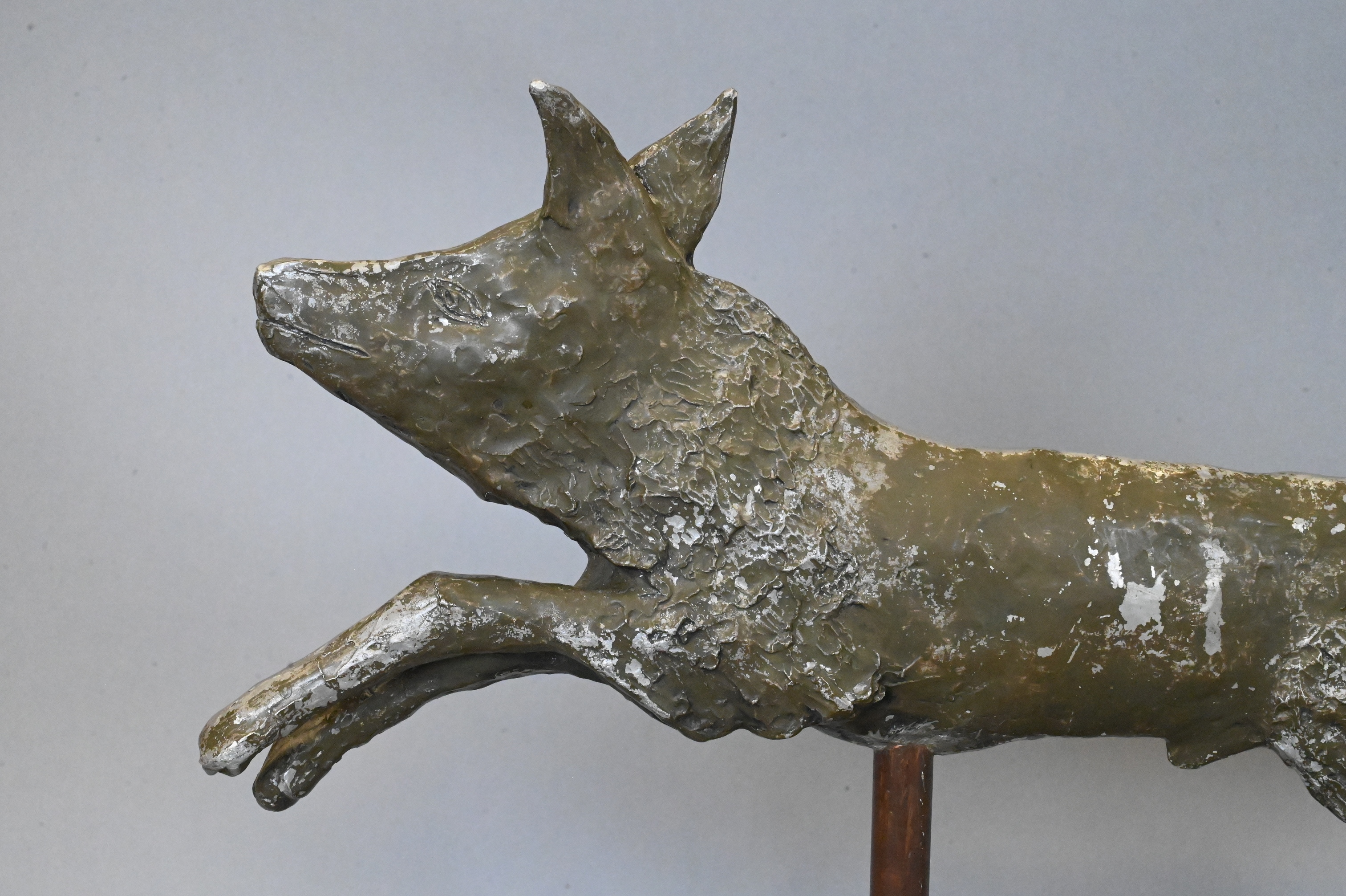 A leaping fox weathervane, cast body with detailed fur modeling, mounted on a later museum stand. Patinated surface with traces of old weathering, originally designed for rooftop display.