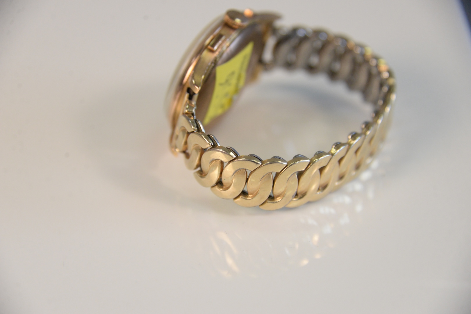 Chronographe Suisse Men’s 14 Karat Gold Wristwatch antimagnetic, seventeen jewel with stop watch and two small dials 37.8 millimeters