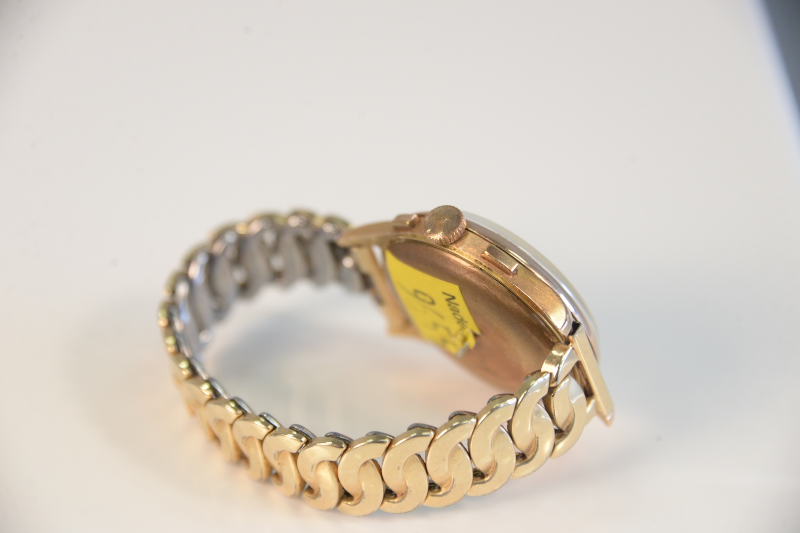 Lot 24: Chronographe Suisse Men’s 14 Karat Gold Wristwatch antimagnetic, seventeen jewel with stop watch and two small dials 37.8 millim…