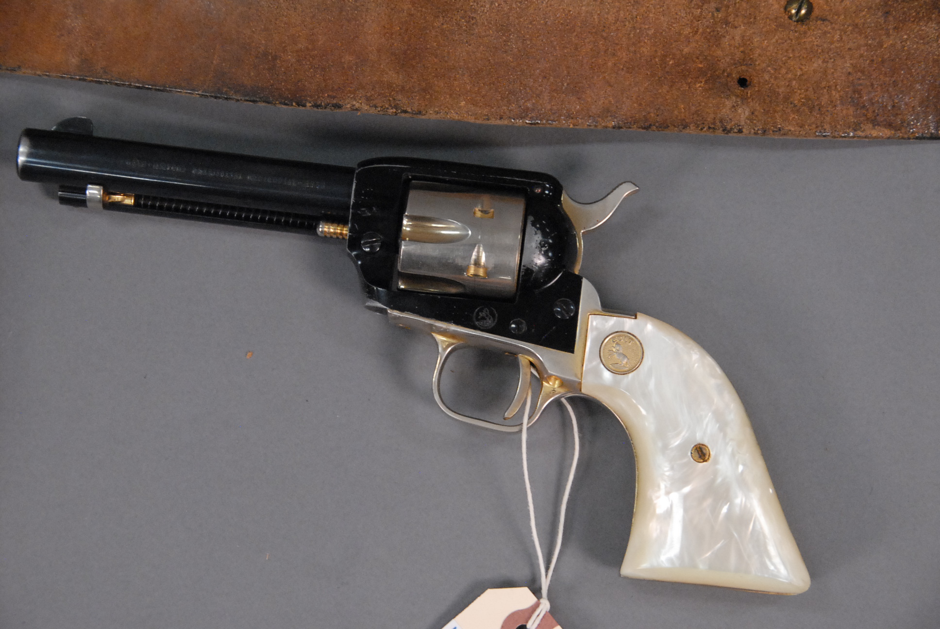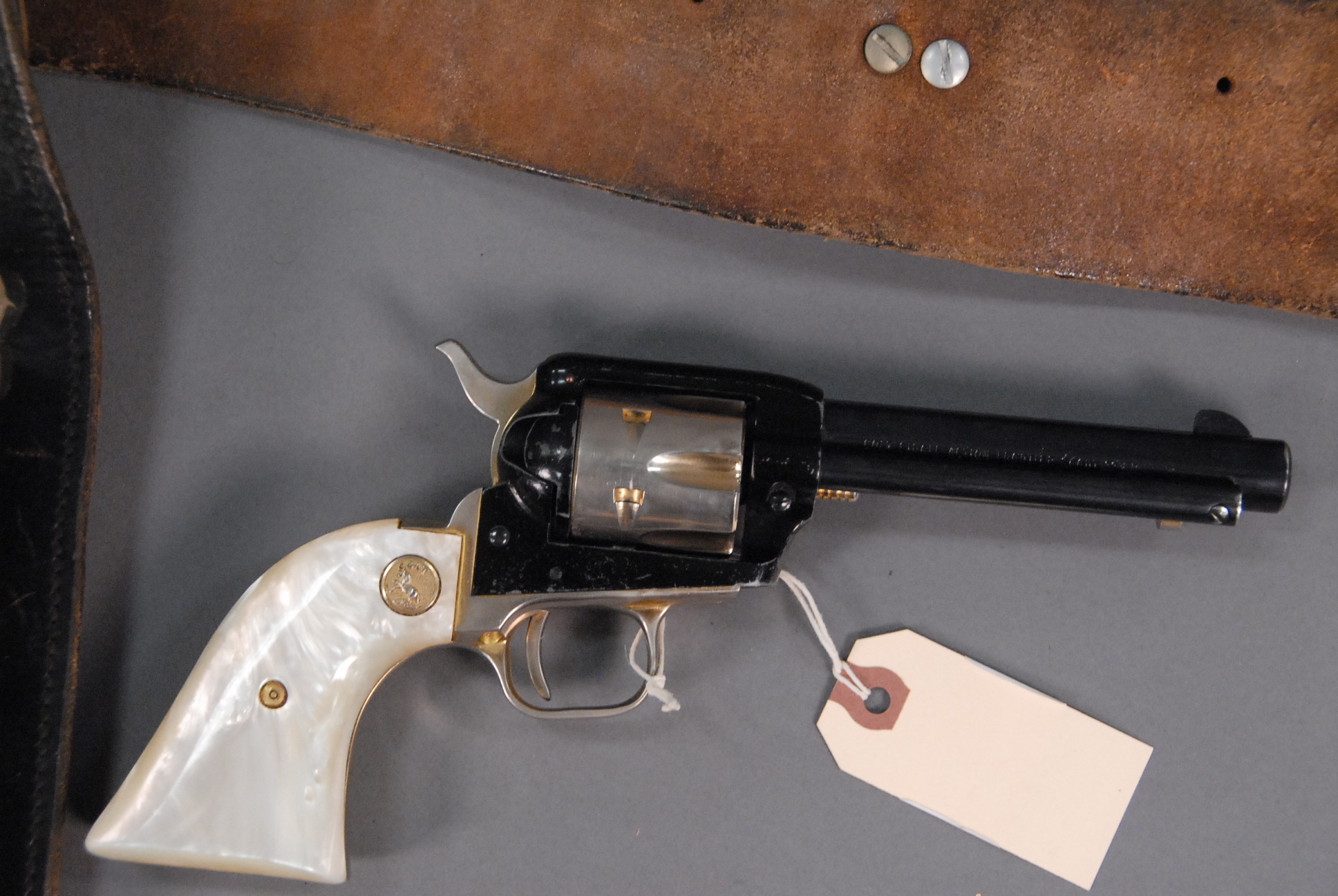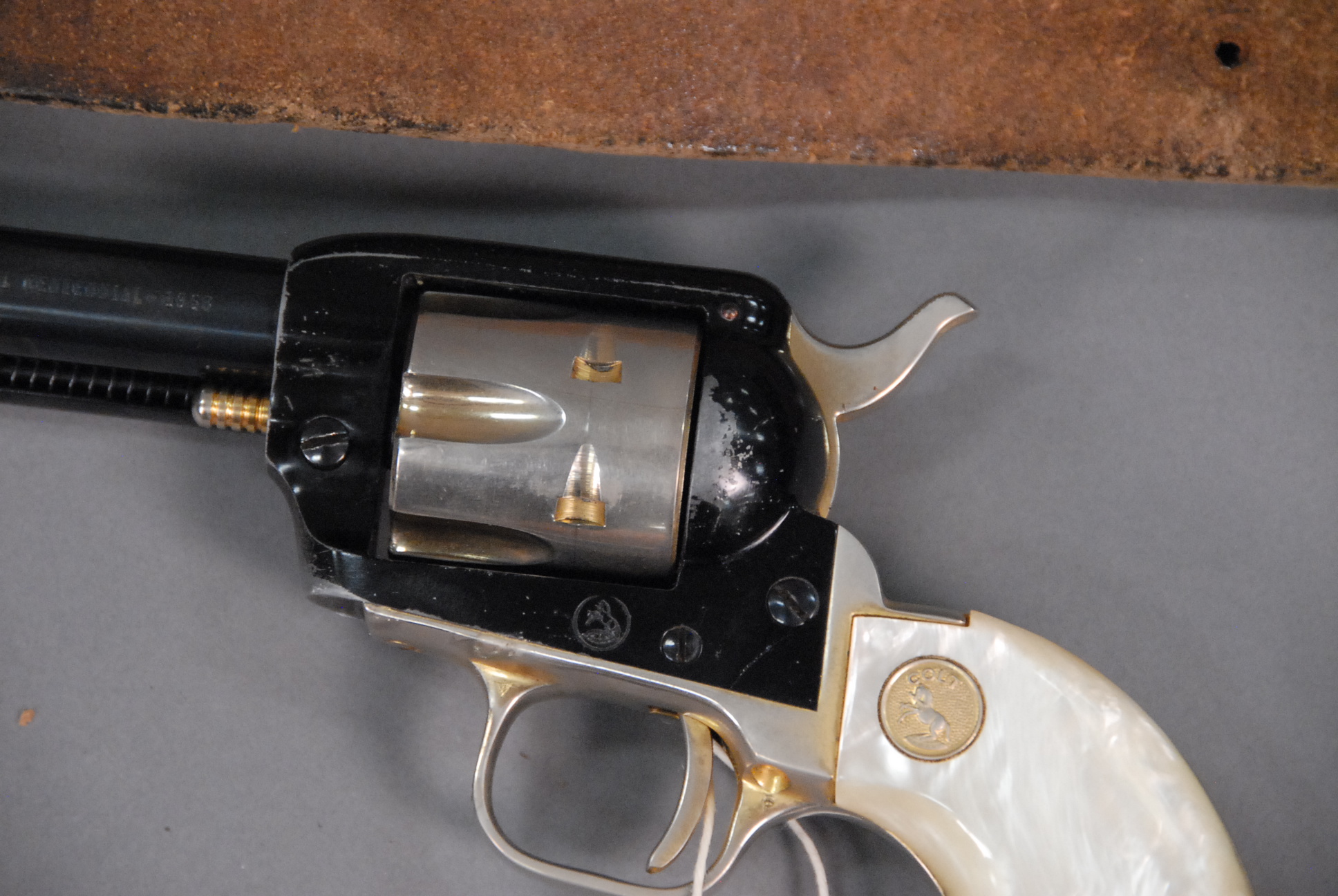Lot 24: Colt Arizona Territorial Centennial Scout revolver 1860-1963, cal 22 LR, having faux pearl medallion grips and leather holster, barr…