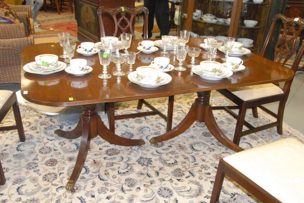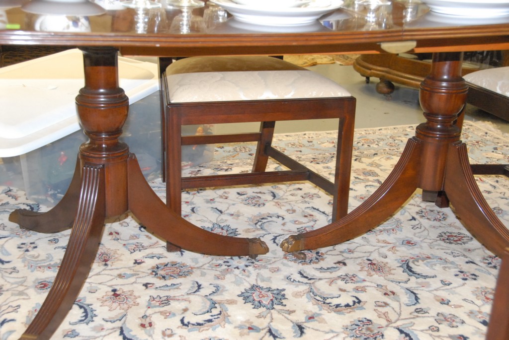 Custom mahogany double pedestal dining table, 47 x 69 plus two 18in. Leaves.