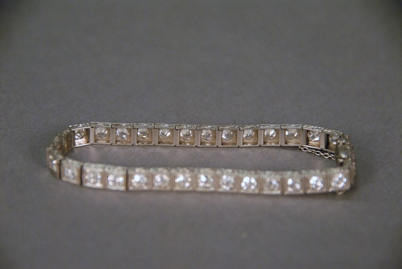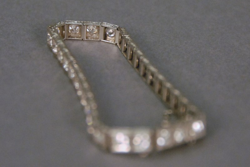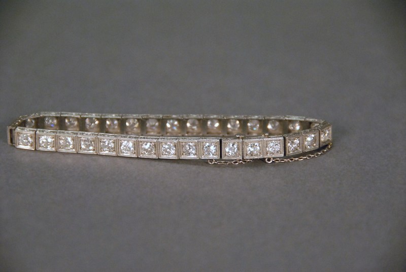 Lot 24: European platinum diamond tennis bracelet having 32 round brilliant cut diamonds, diamonds average H color and SI2 clarity and weigh approximately .20ct each for total weight of 6.30ct by formula, diamonds are set in square mountings with safety chai