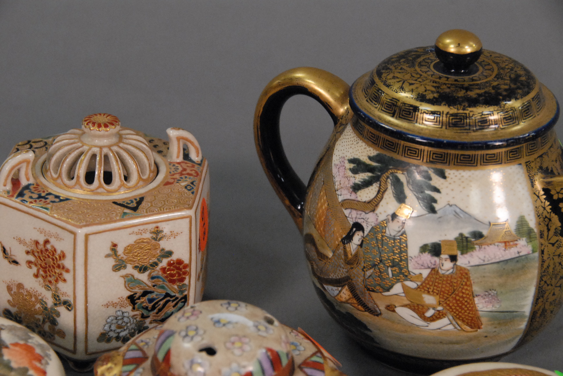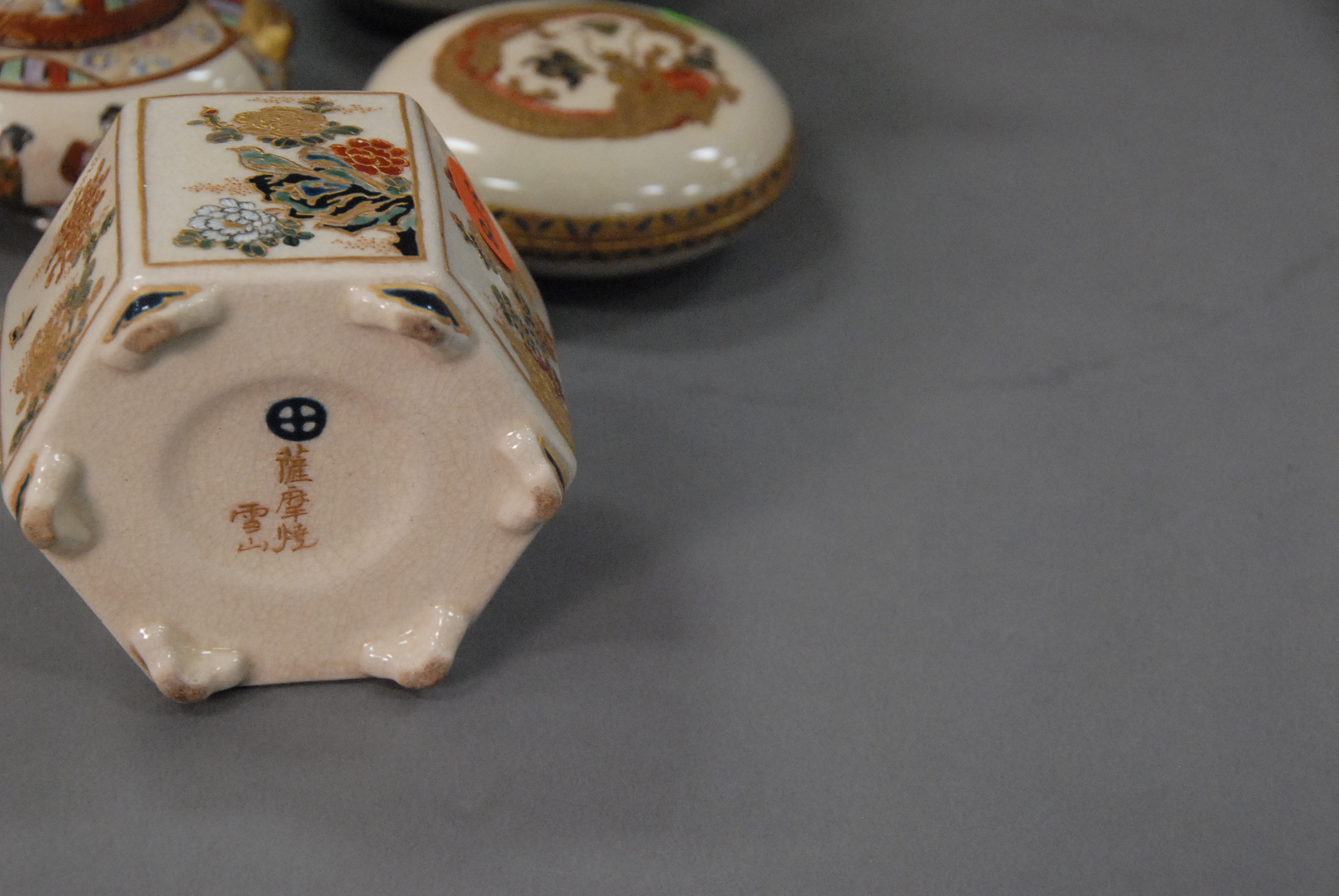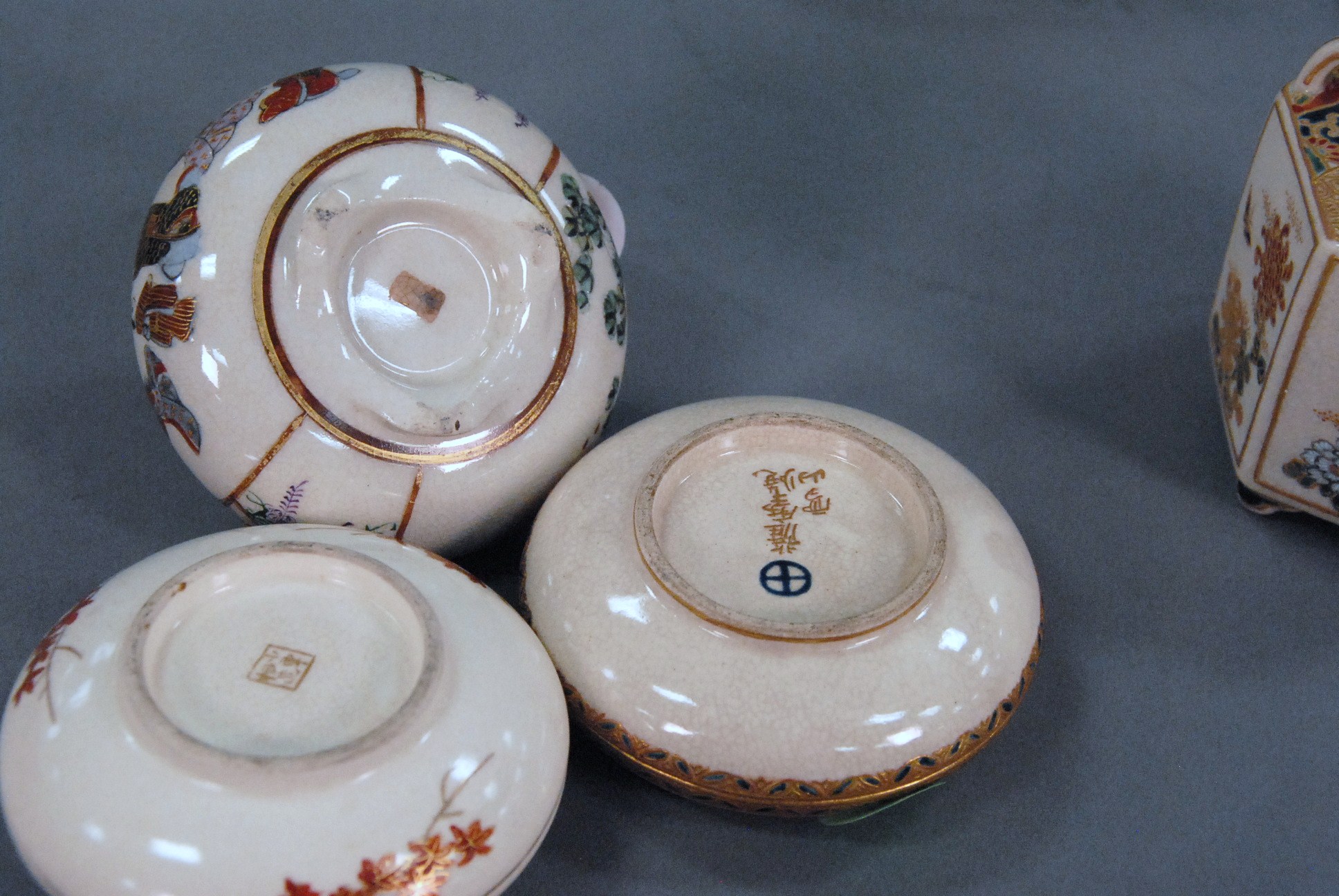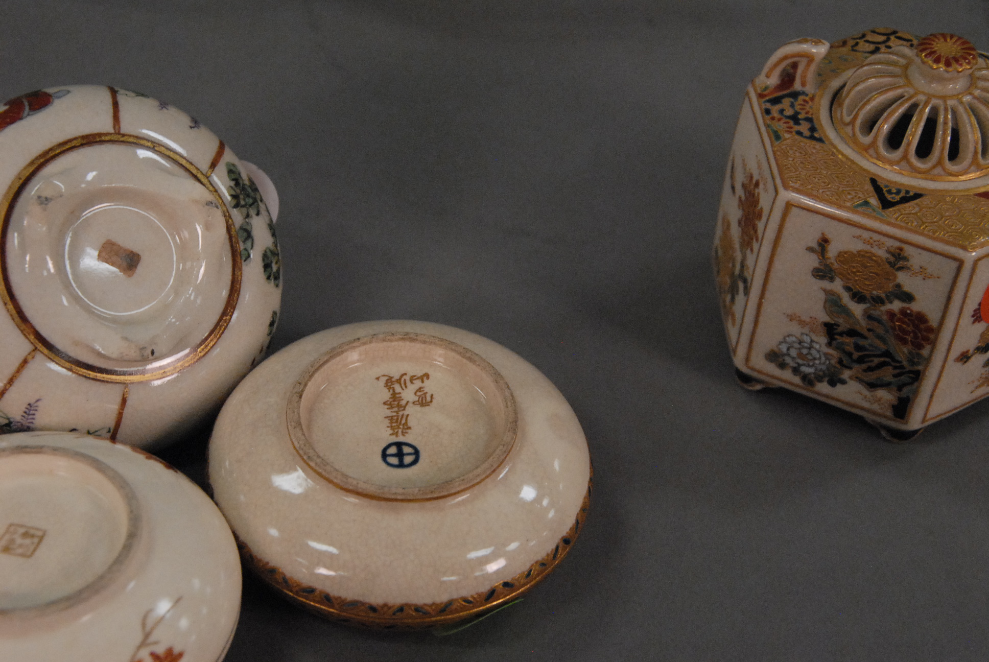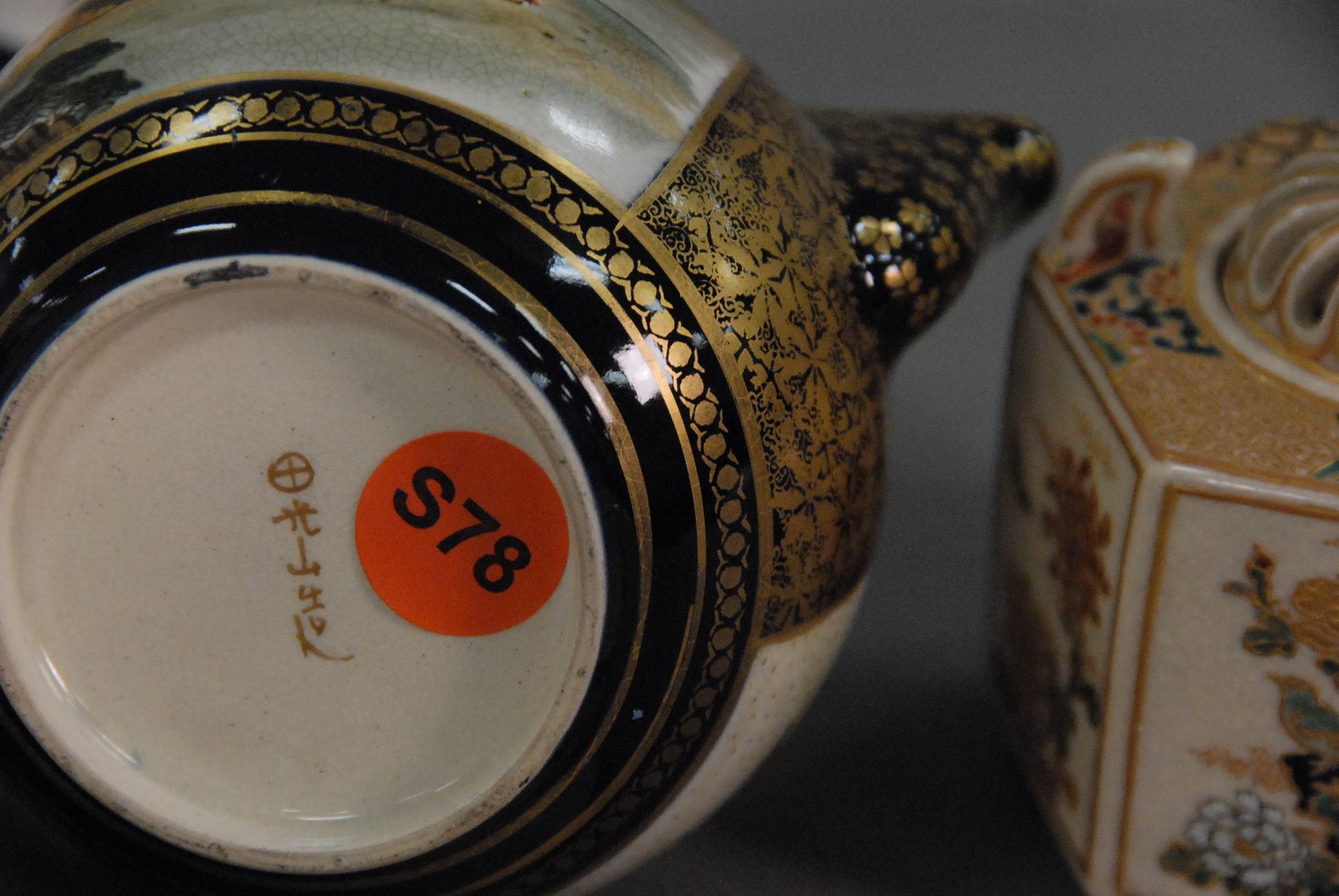 Five pieces of Satsuma to include a three claw dragon paste jar marked on bottom, a paste jar with painted landscape marked on bottom, a small sensor with painted Guanyin figures marked on bottom, six sided sensor with painted panels marked on bottom, and a teapot with two painted scenes marked on bottom.