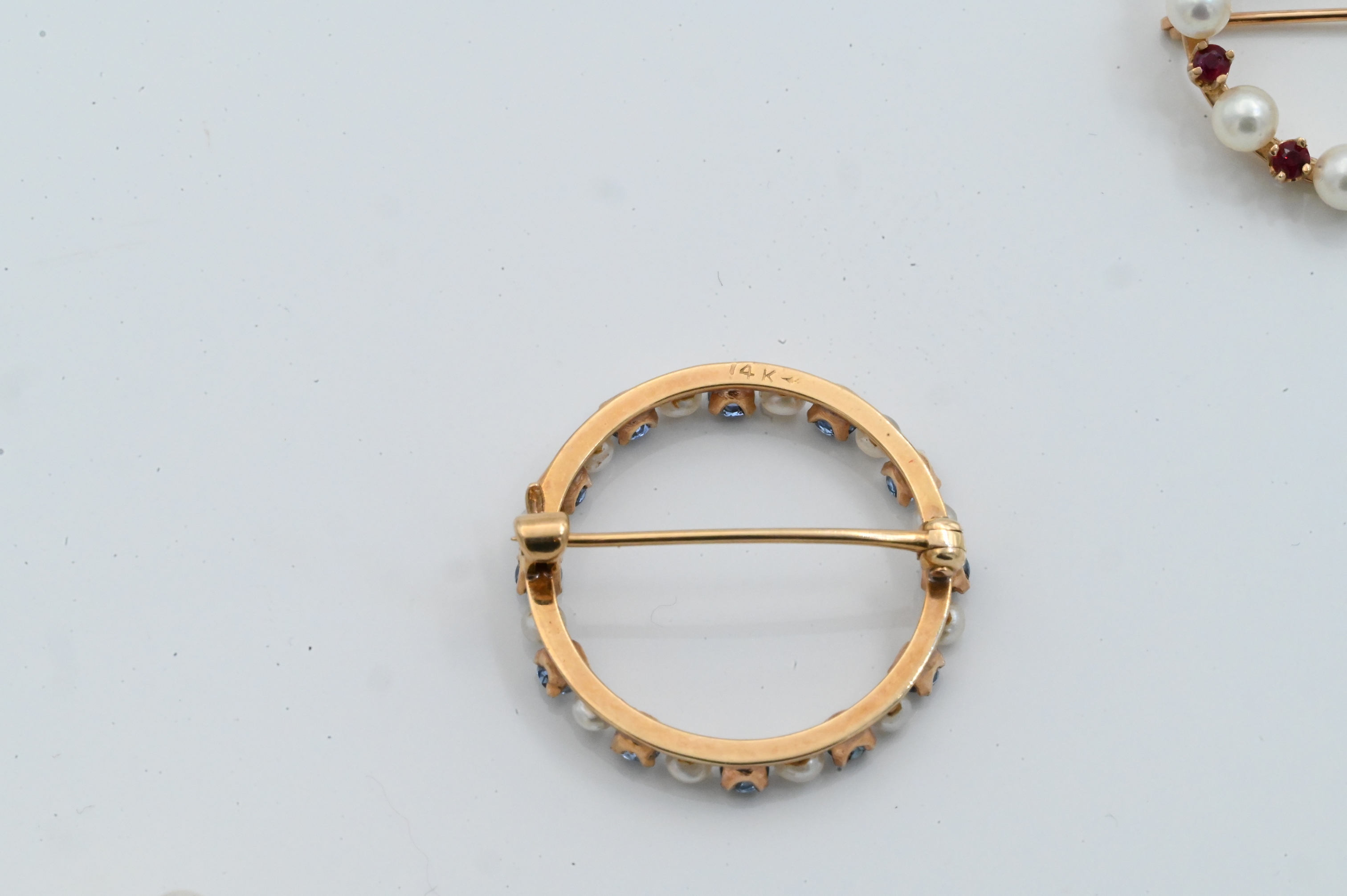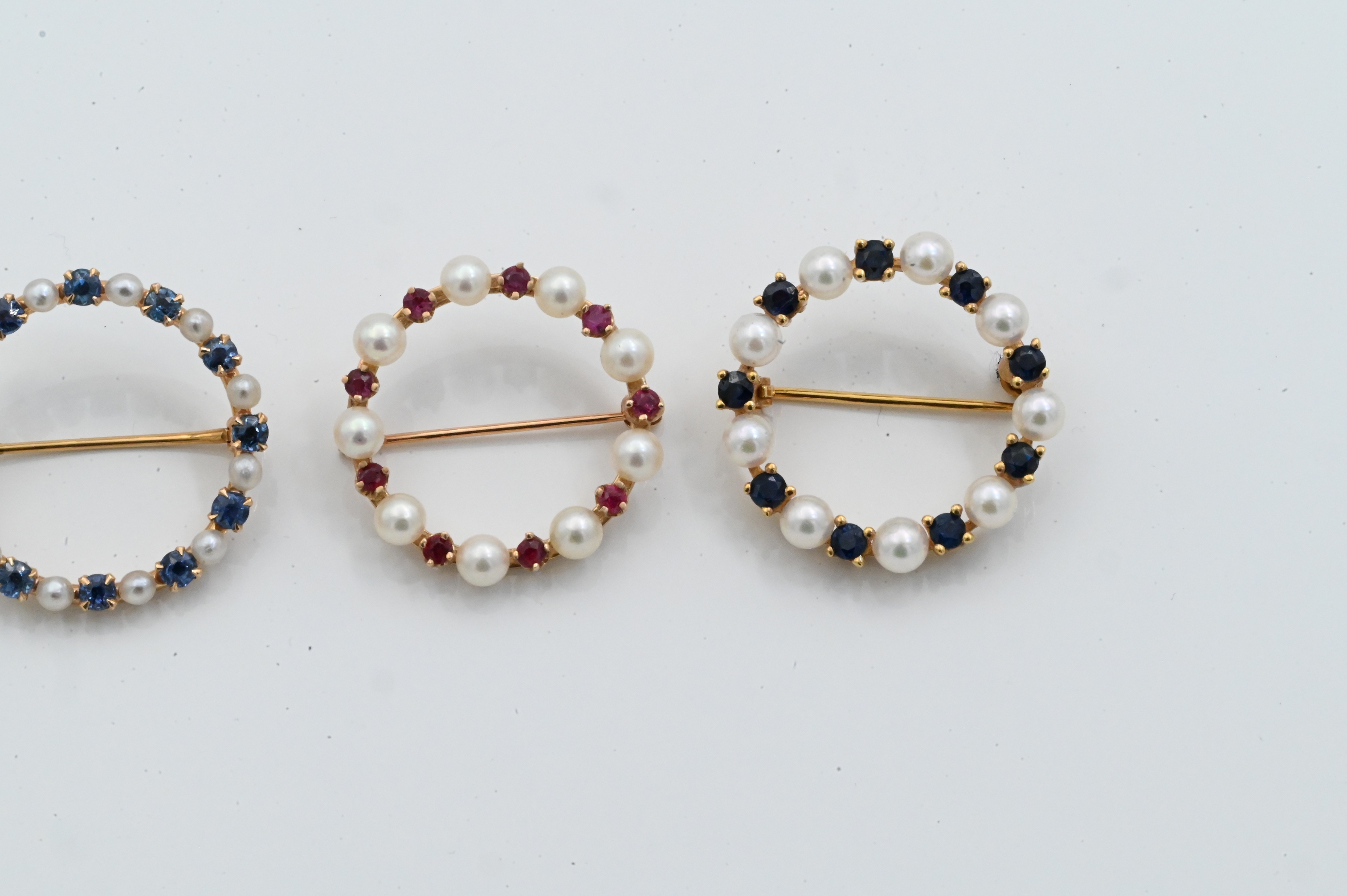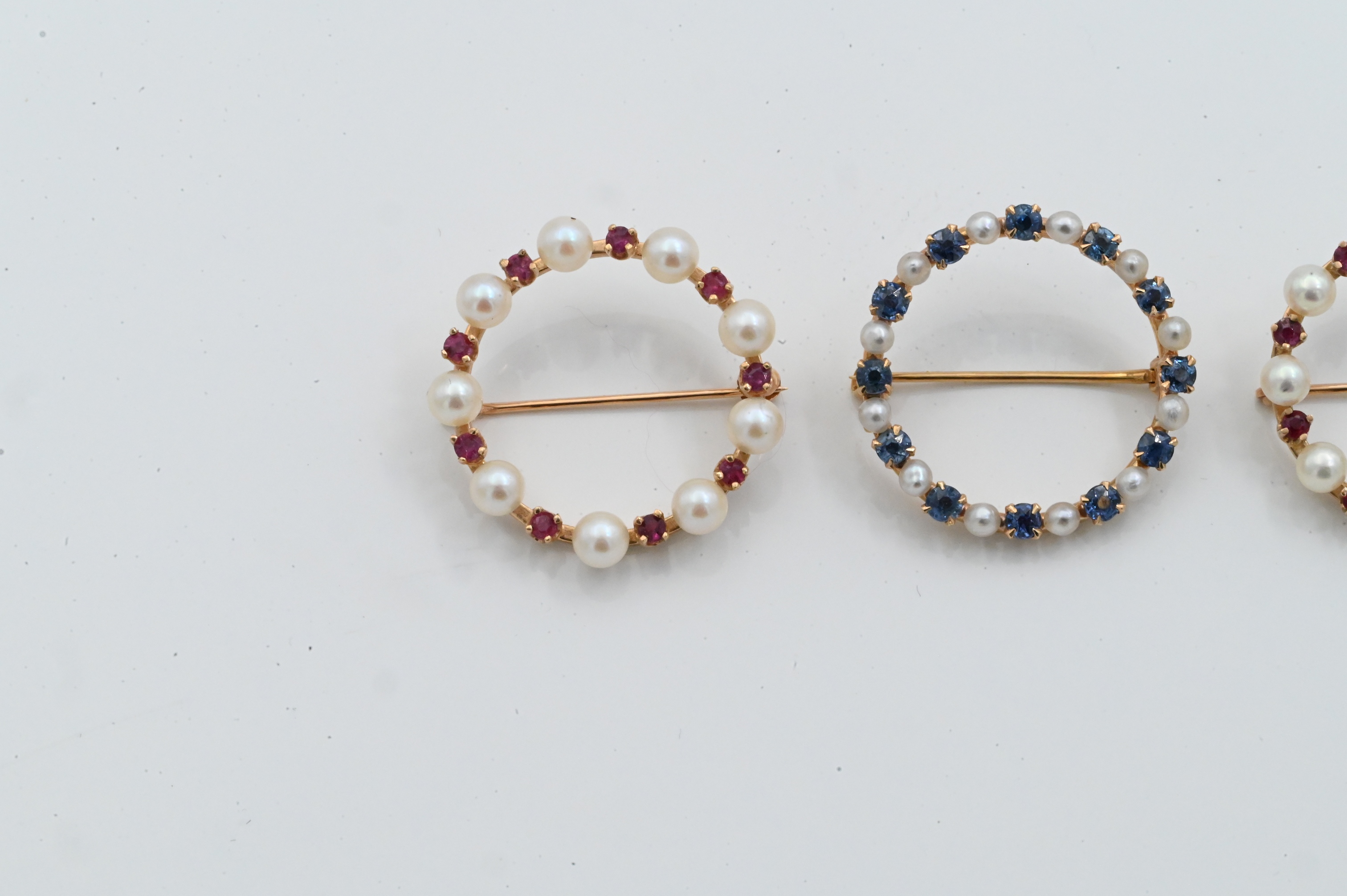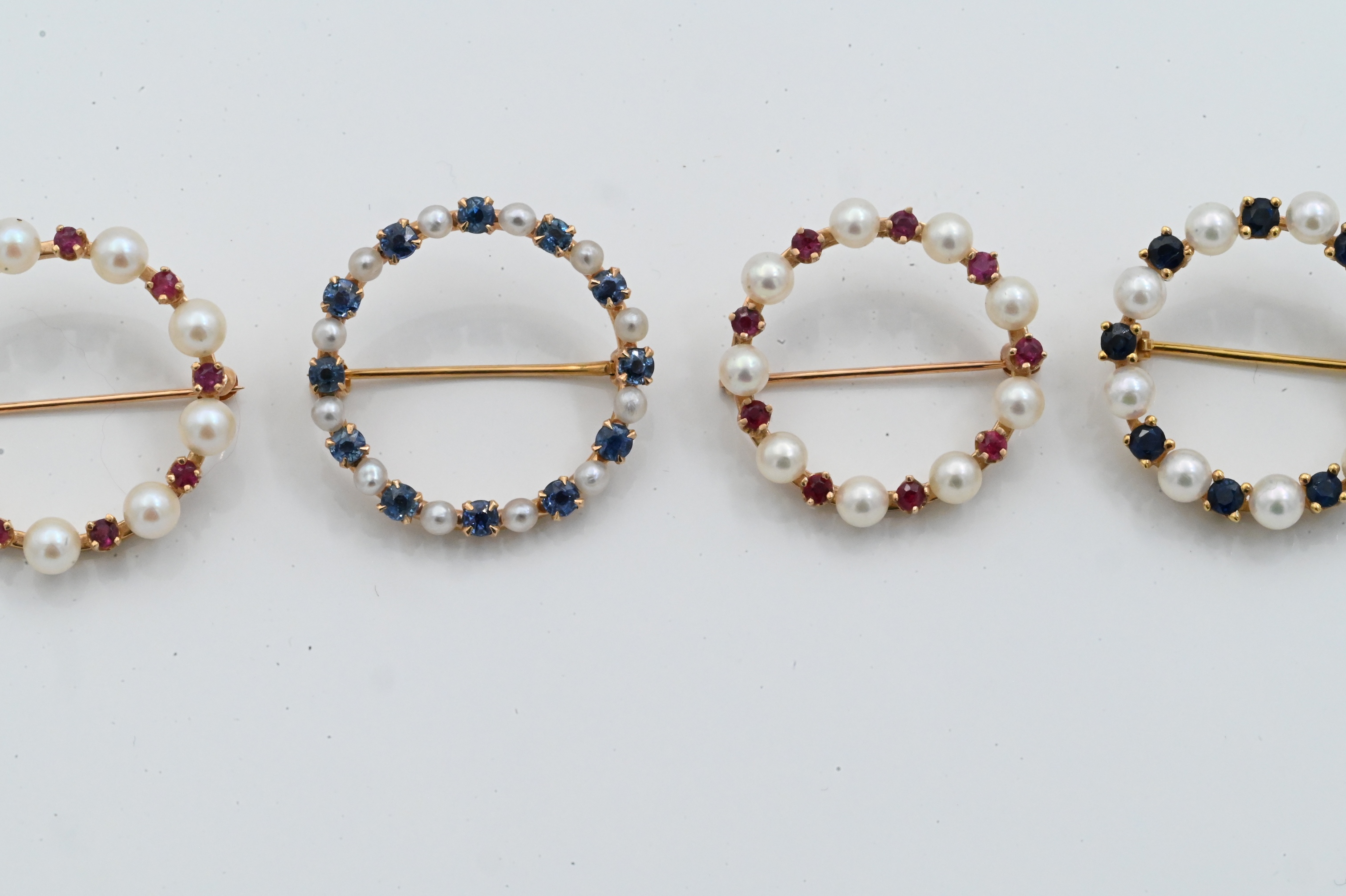 set of four circular brooches alternating cultured pearls with sapphires and rubies, each marked “14K”; likely by the same maker