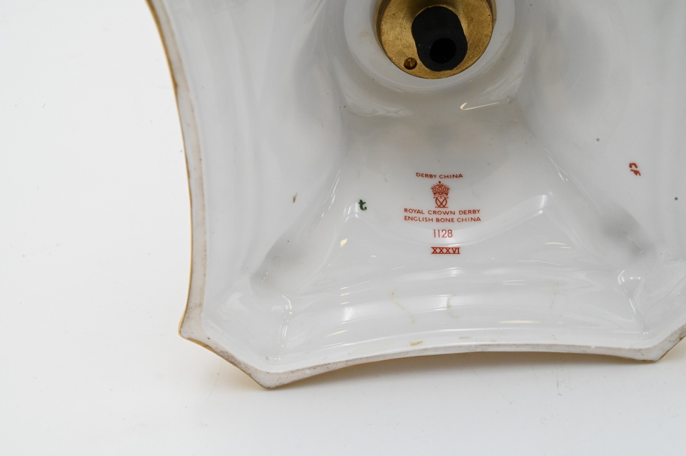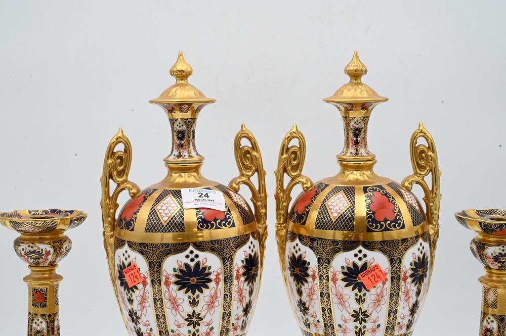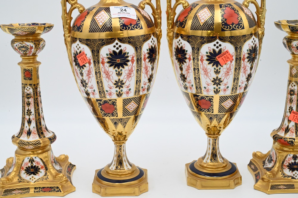 Four Piece Lot of Royal Crown Derby, to include a pair of urns, and a pair of candlesticks, (one urn with small crack to top finial, one corner missing from one candlestick), heights 10 1/2 and 16 1/2 inches. Provenance: Collections of Norma Reilly, New Jersey.