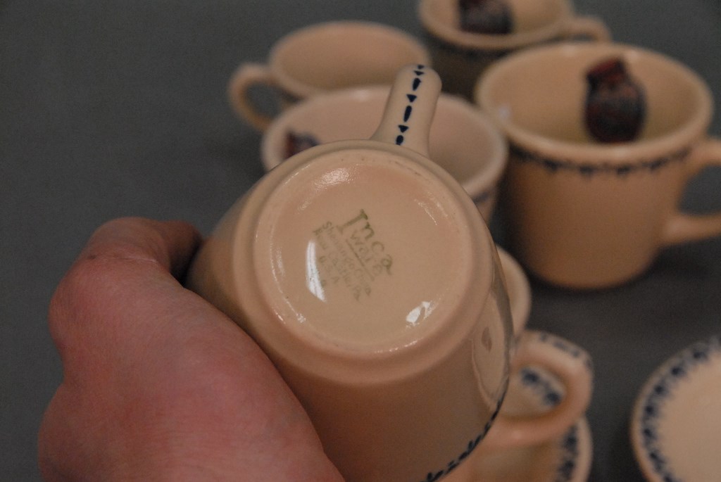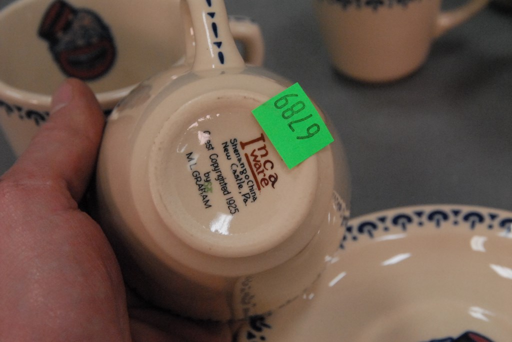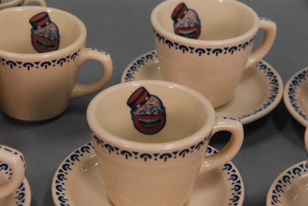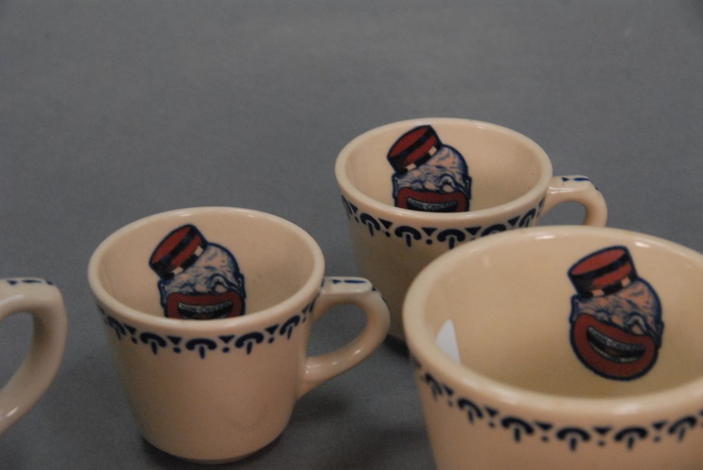 Fourteen piece lot of Coon Chicken china: ten cups in two sizes, and saucers.