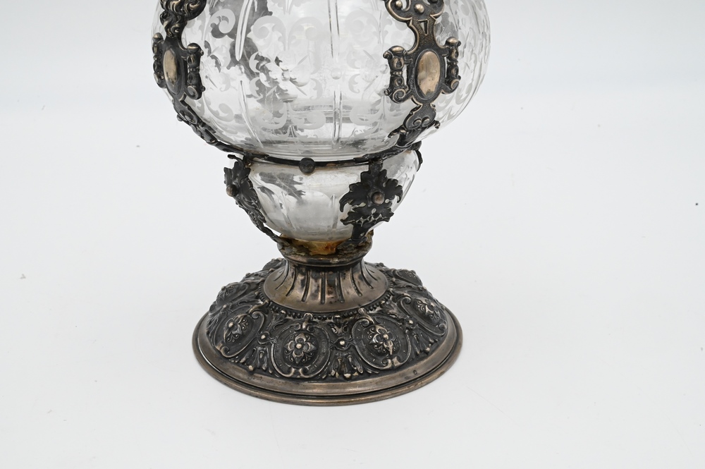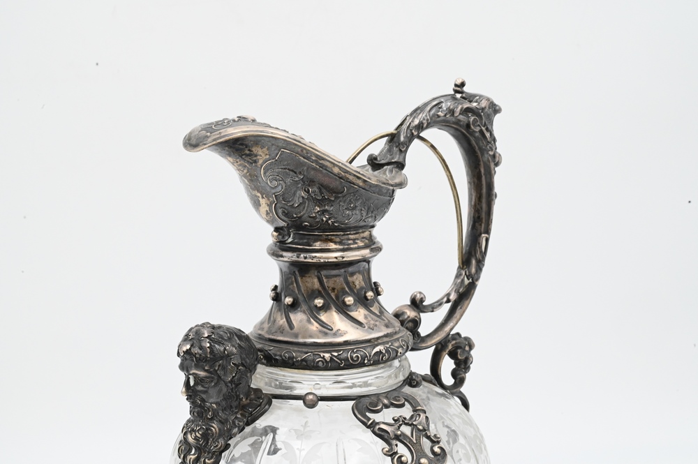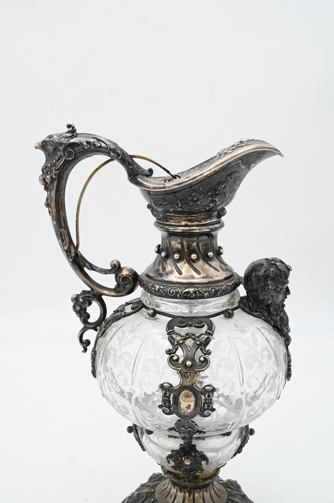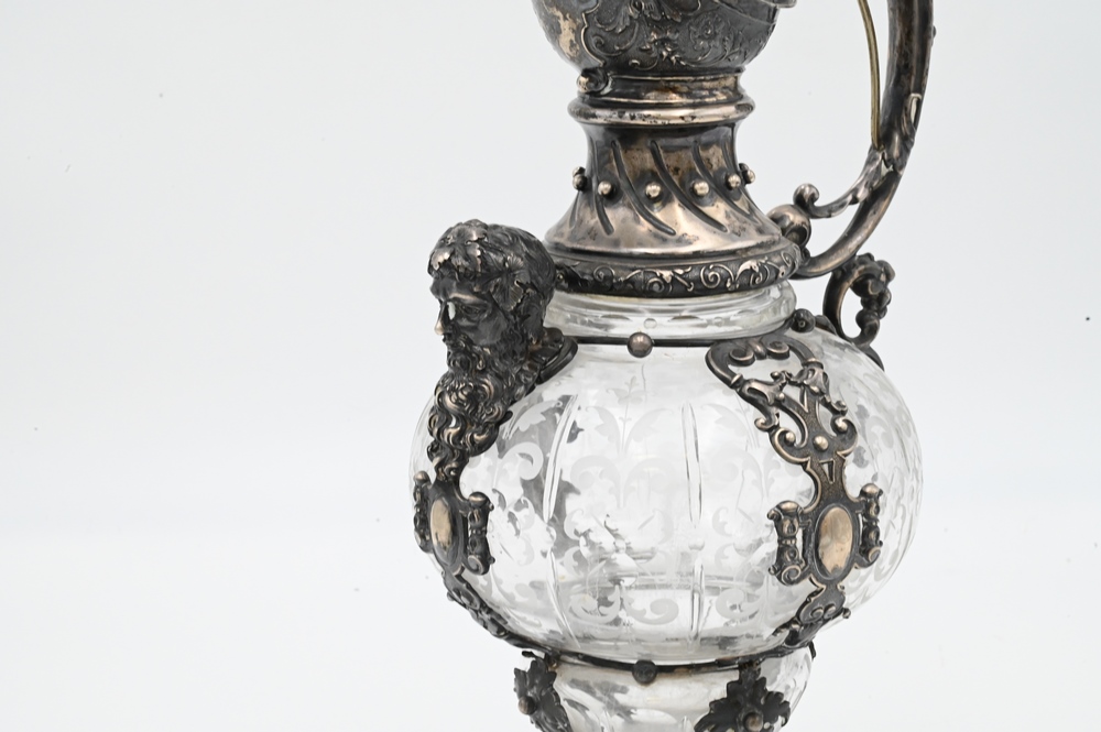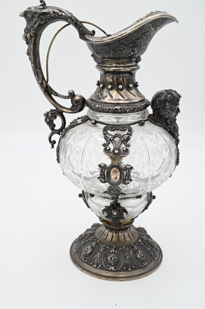 Lot 24: German Rococo Figural Silver and Etched Glass Claret Jug, having silver spout handle and base with bust of a bearded man on the front, base marked 800, height 13 inches.