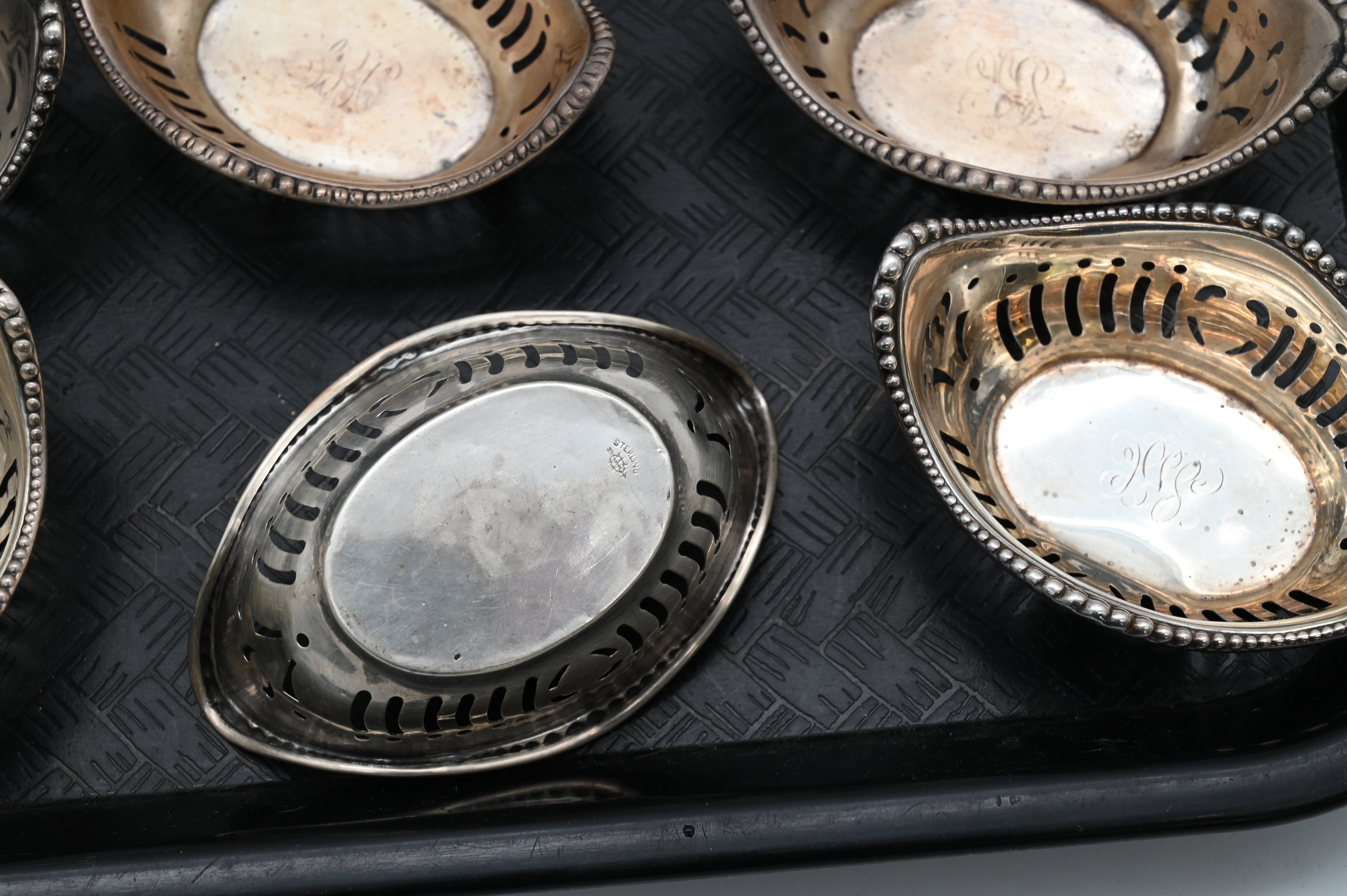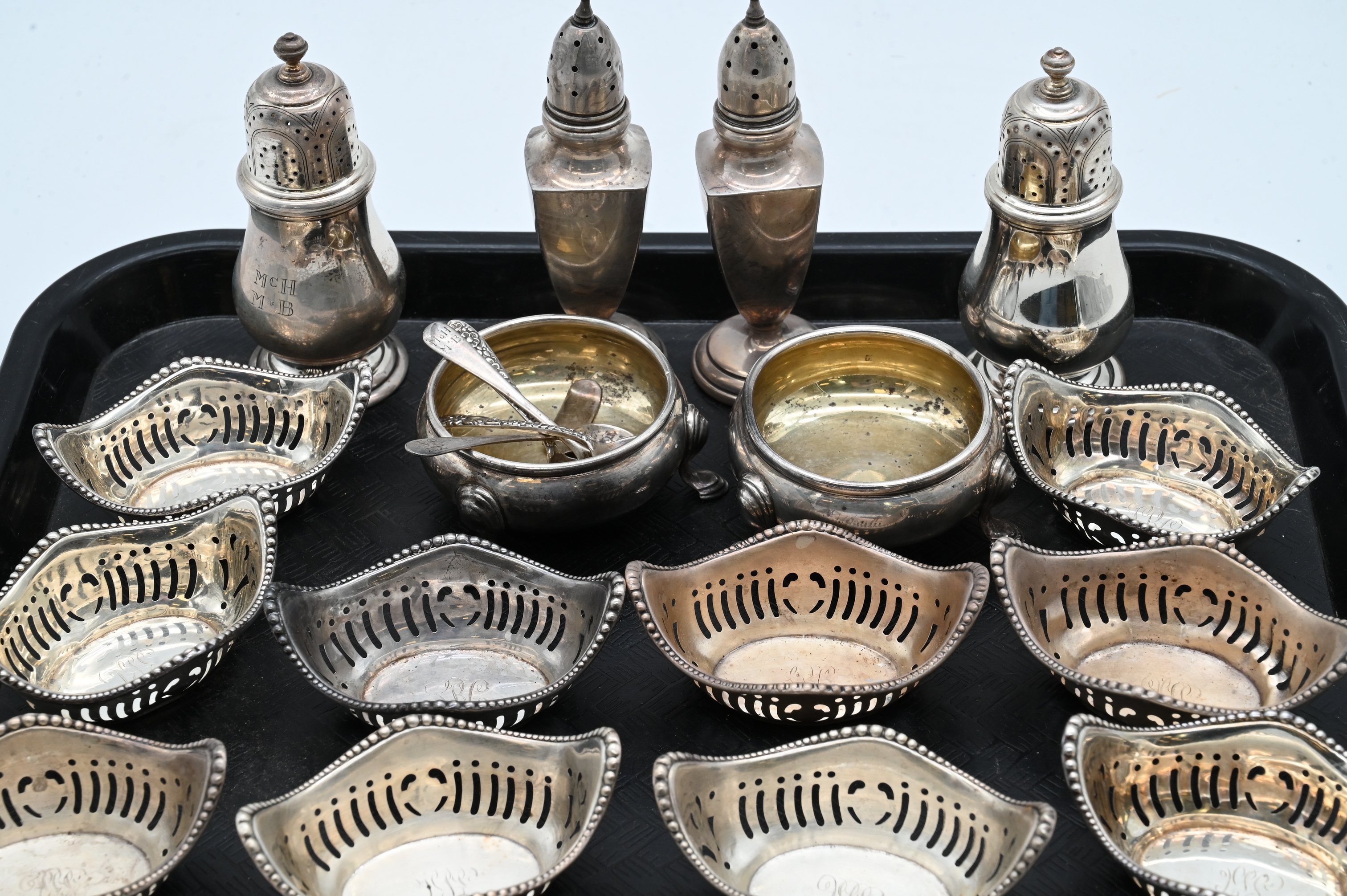to include two pairs of salt / pepper shakers, pair of salts with spoons, and 10 small pierced nut or bon bon dishes