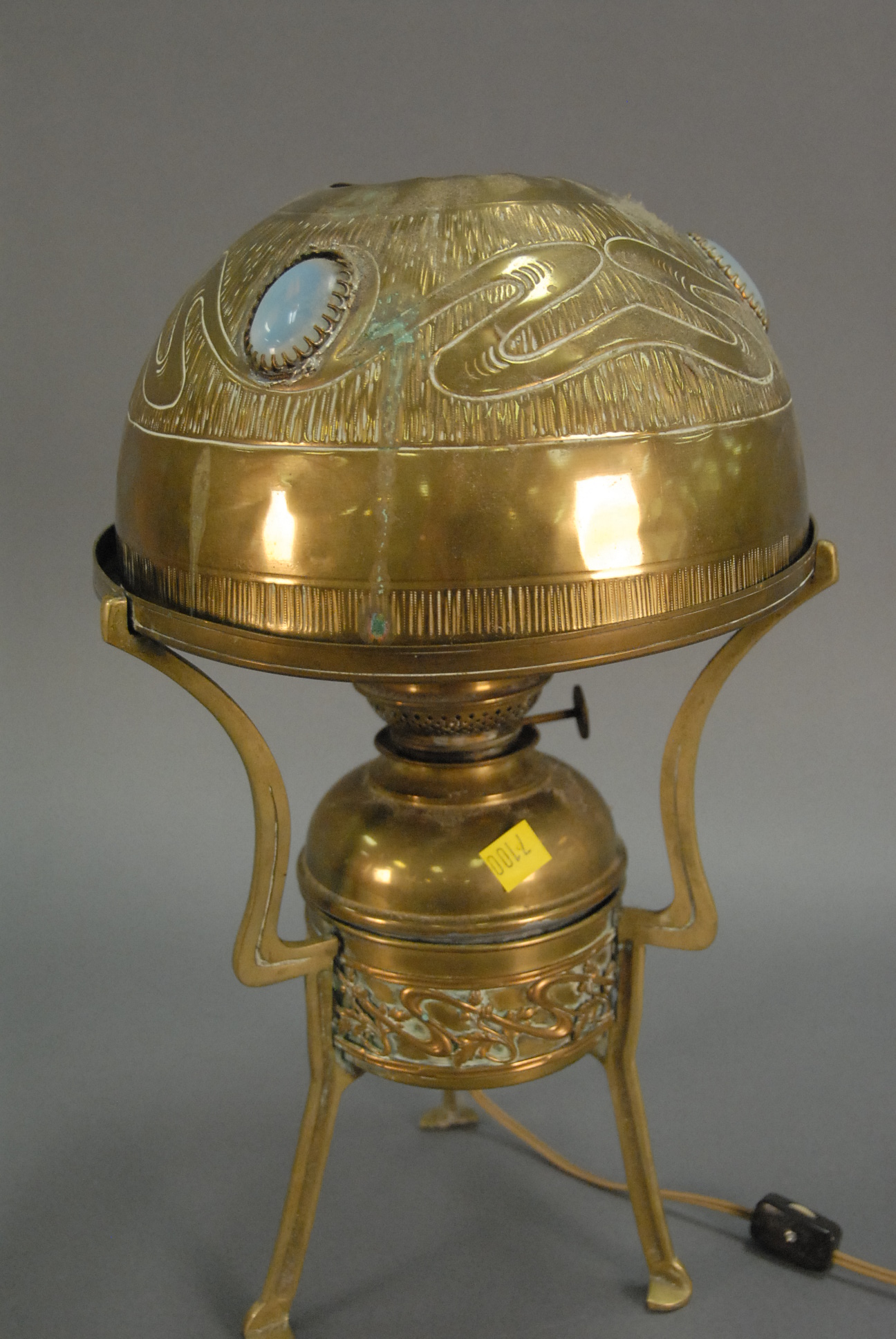 Kosmos brass oil lamp with jeweled and brass shade, ht. 17in.