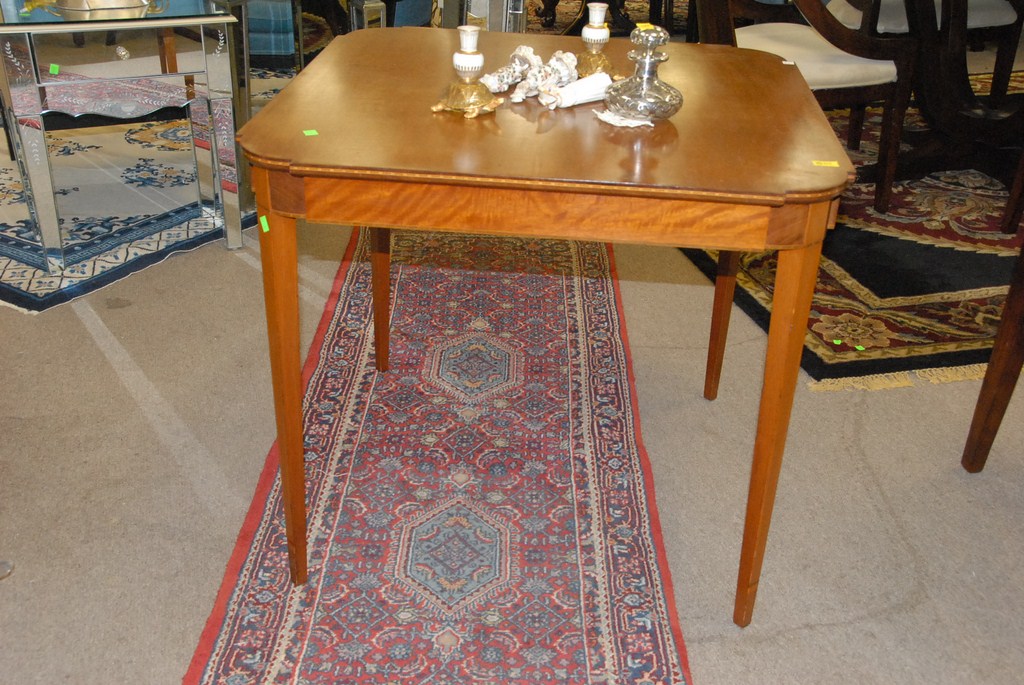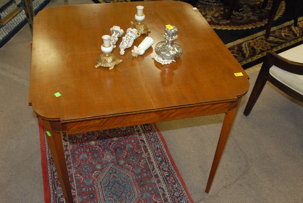 Lot 24: Margolis mahogany shaped top Federal style card table with cut out corners all on square tapered legs, signed Harold Margolis with b…
