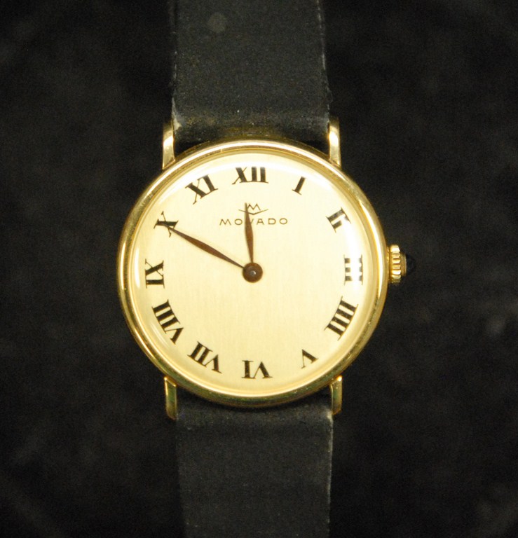 Movado 18K gold man’s wristwatch having gold color face with black Roman numerals and Movado band. Provenance: Estate of Judy McDonough Gengras of Stoner Drive, West Hartford, Connecticut.