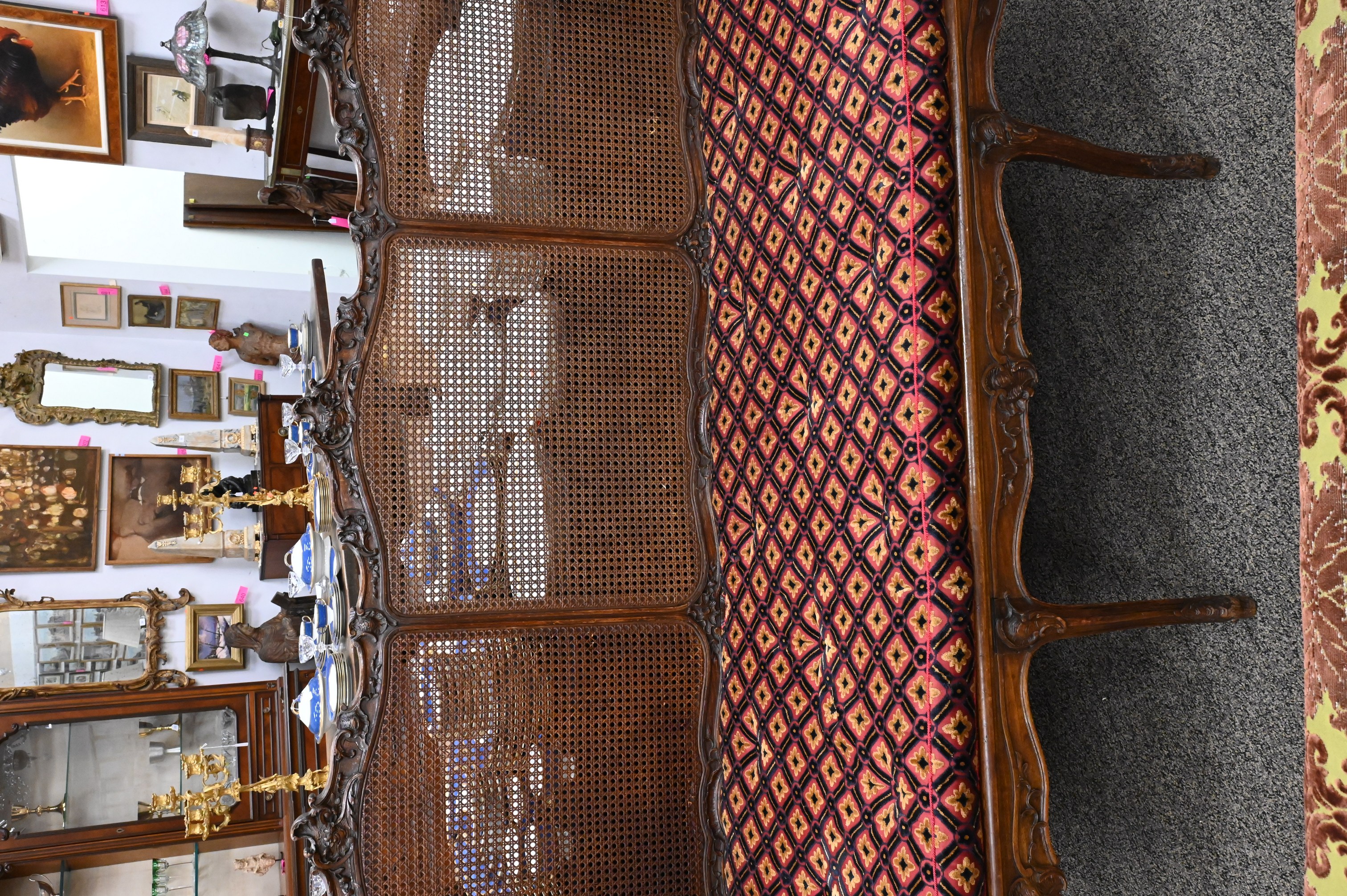 triple-back form settee with finely carved walnut crest rails of scrolling acanthus and floral motifs above woven cane panels continuing to shaped open sides, serpentine seat rail carved with foliate detail, raised on cabriole legs terminating in scrolled toes, upholstered loose seat cushion in patterned fabric
