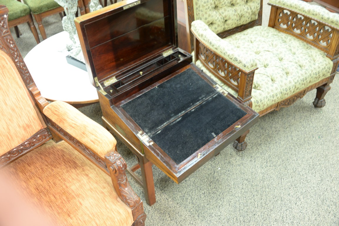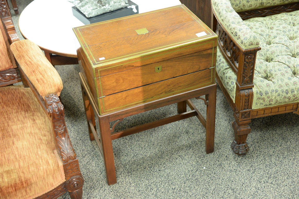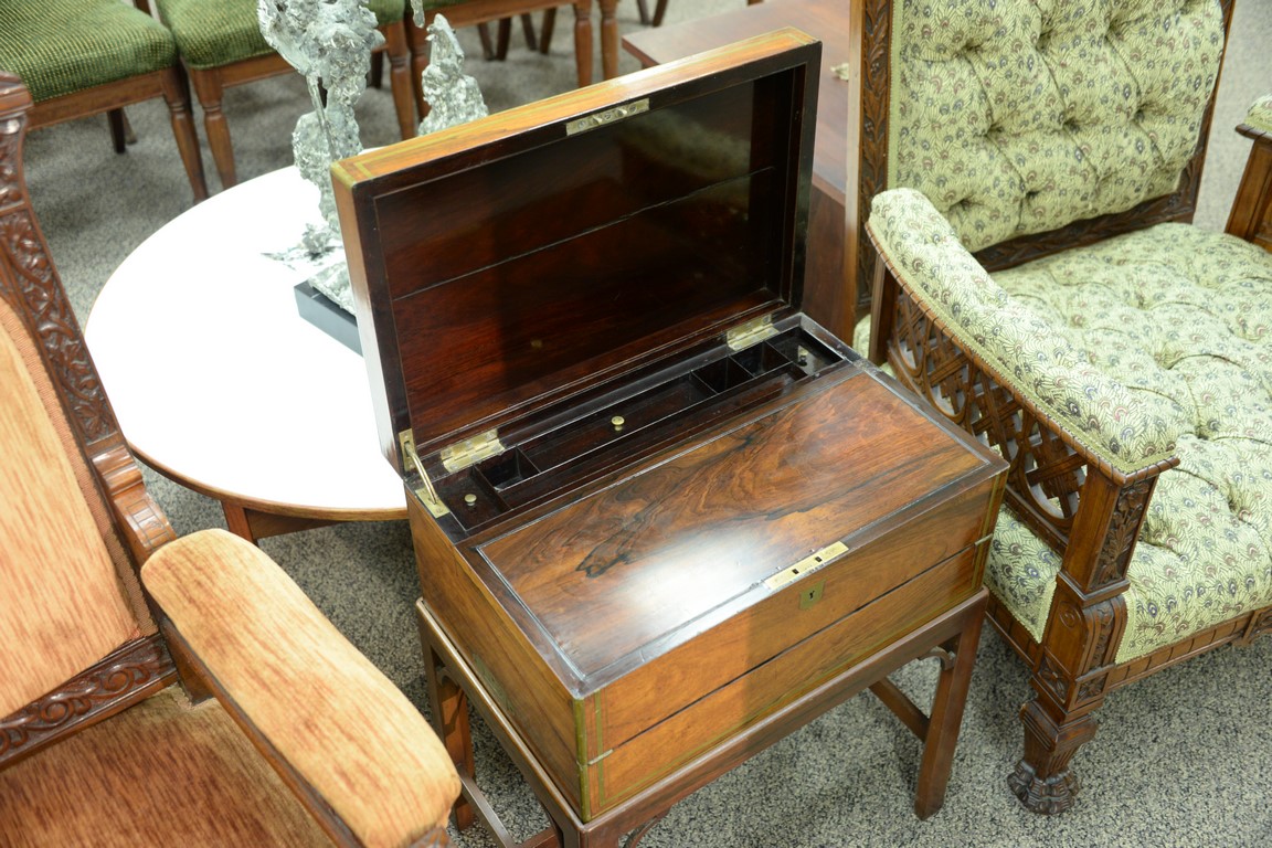 Rosewood brass bound lap desk on stand. height 25 inches, top: 13 x 20