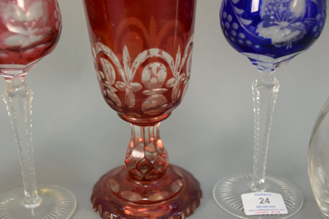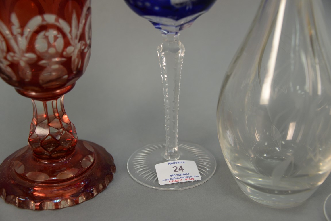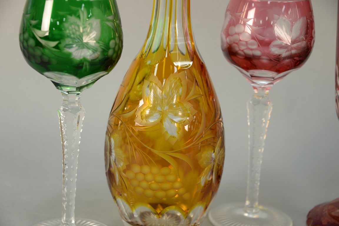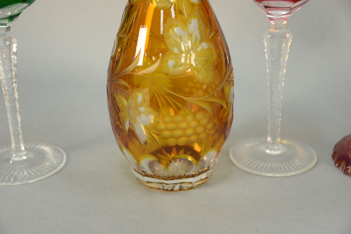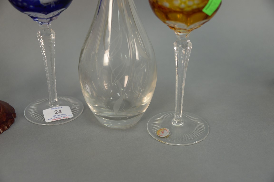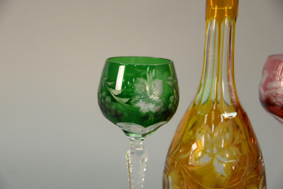 Lot 24: Seven piece crystal group to include a set of four Bleikristall Bavaria colored crystal stems along with two decanters and a ruby cu…