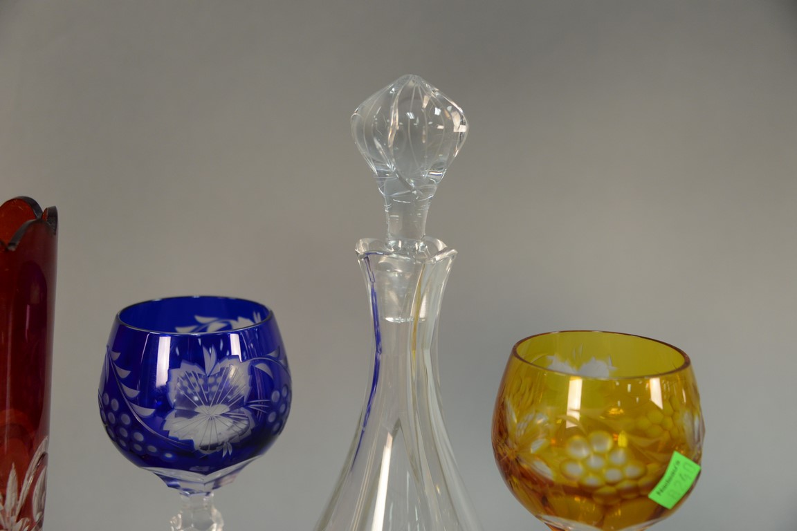 Seven piece crystal group to include a set of four Bleikristall Bavaria colored crystal stems along with two decanters and a ruby cut to clear vase. ht. 8 1/2in. to 15 1/2in.