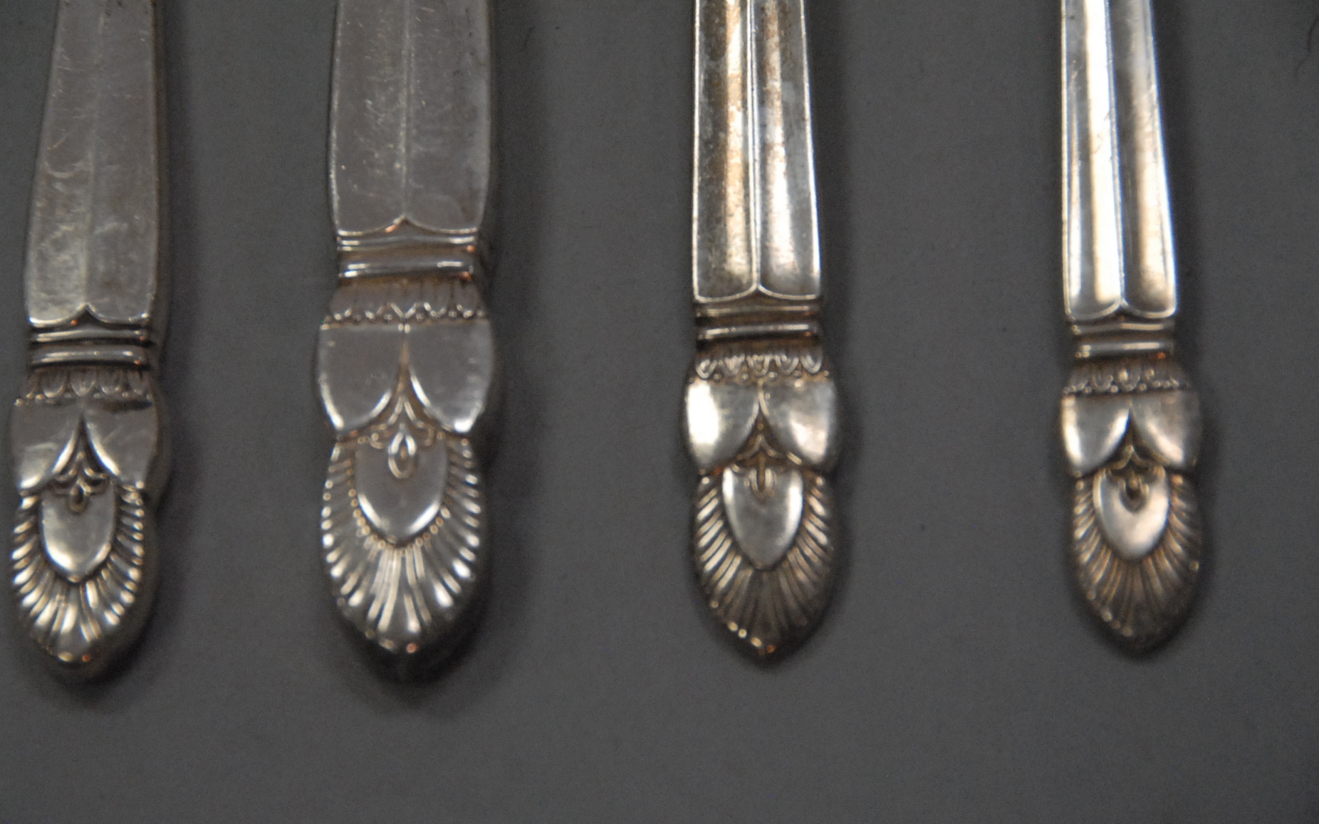 Sterling silver flatware set, setting for twelve including 12 dinner forks, 11 luncheon forks, 12 soup spoons, 19 teaspoons, 12 butter knives, 12 dinner knives. 98.2 t oz. plus 12 handles. total approximate 106 t oz.