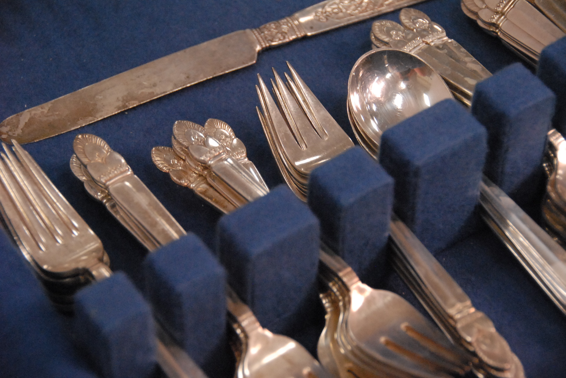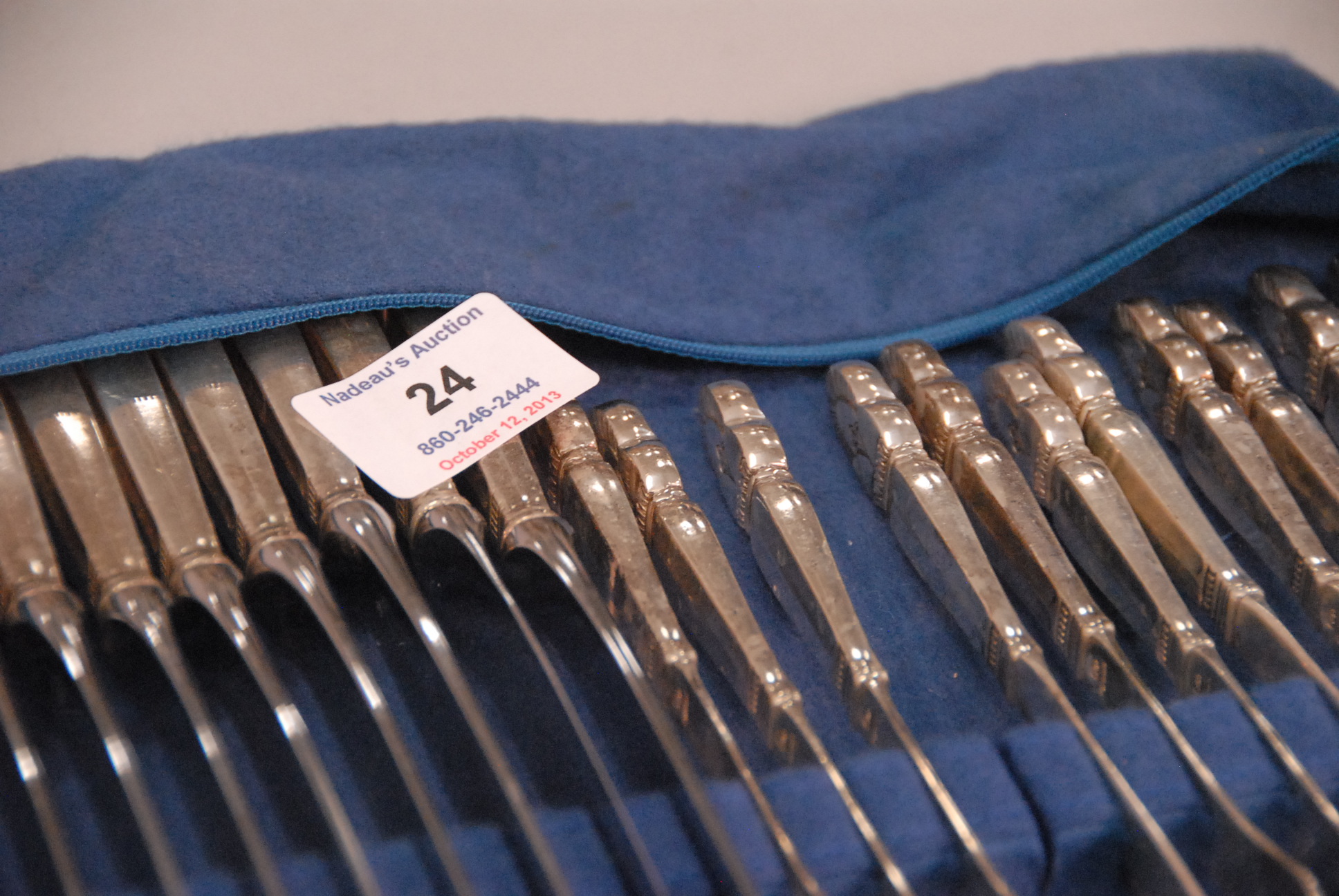 Lot 24: Sterling silver flatware set, setting for twelve including 12 dinner forks, 11 luncheon forks, 12 soup spoons, 19 teaspoons, 12 butter knives, 12 dinner knives. 98.2 t oz. plus 12 handles. total approximate 106 t oz.