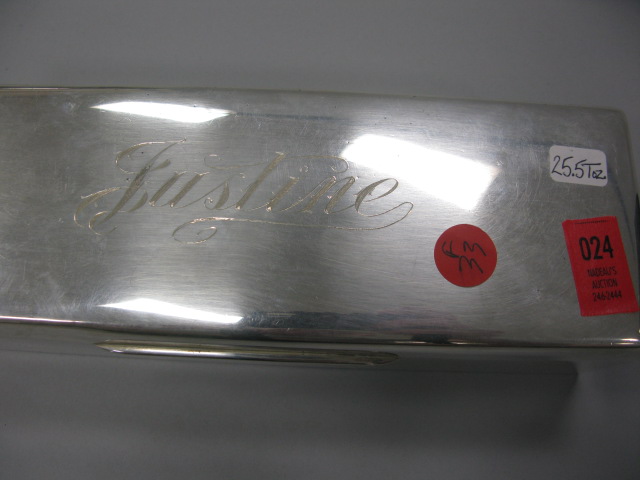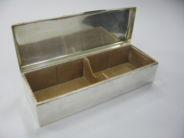 Sterling silver rectangular glove box marked Justine with wooden inserts