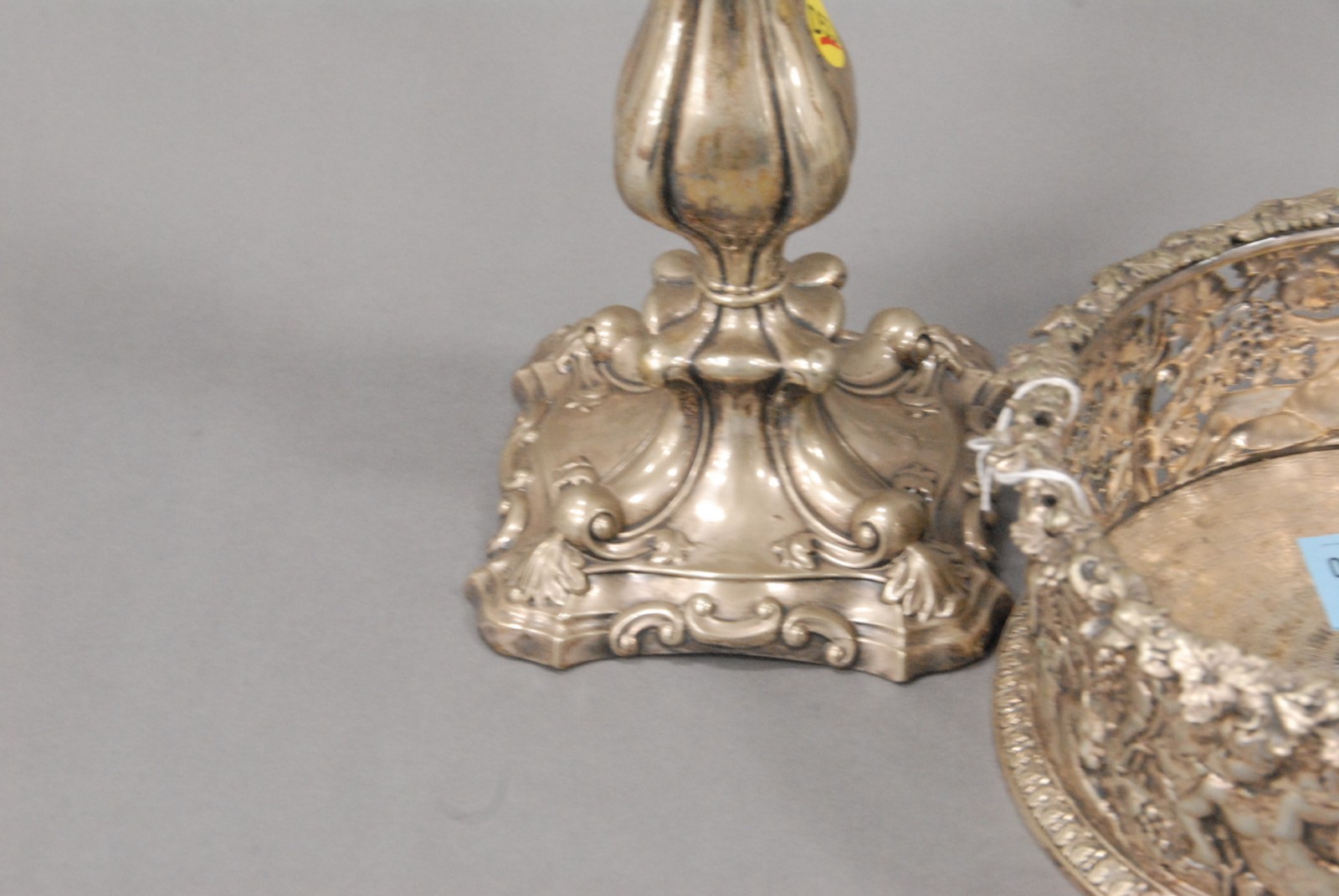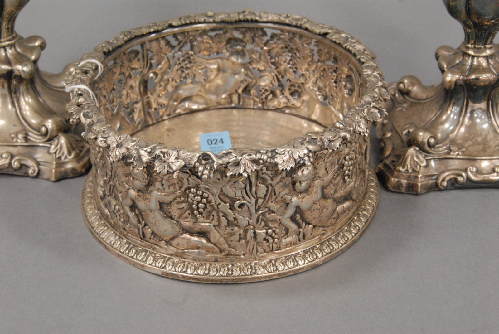 Three piece silver plated lot, pair of candlesticks and wine cooler