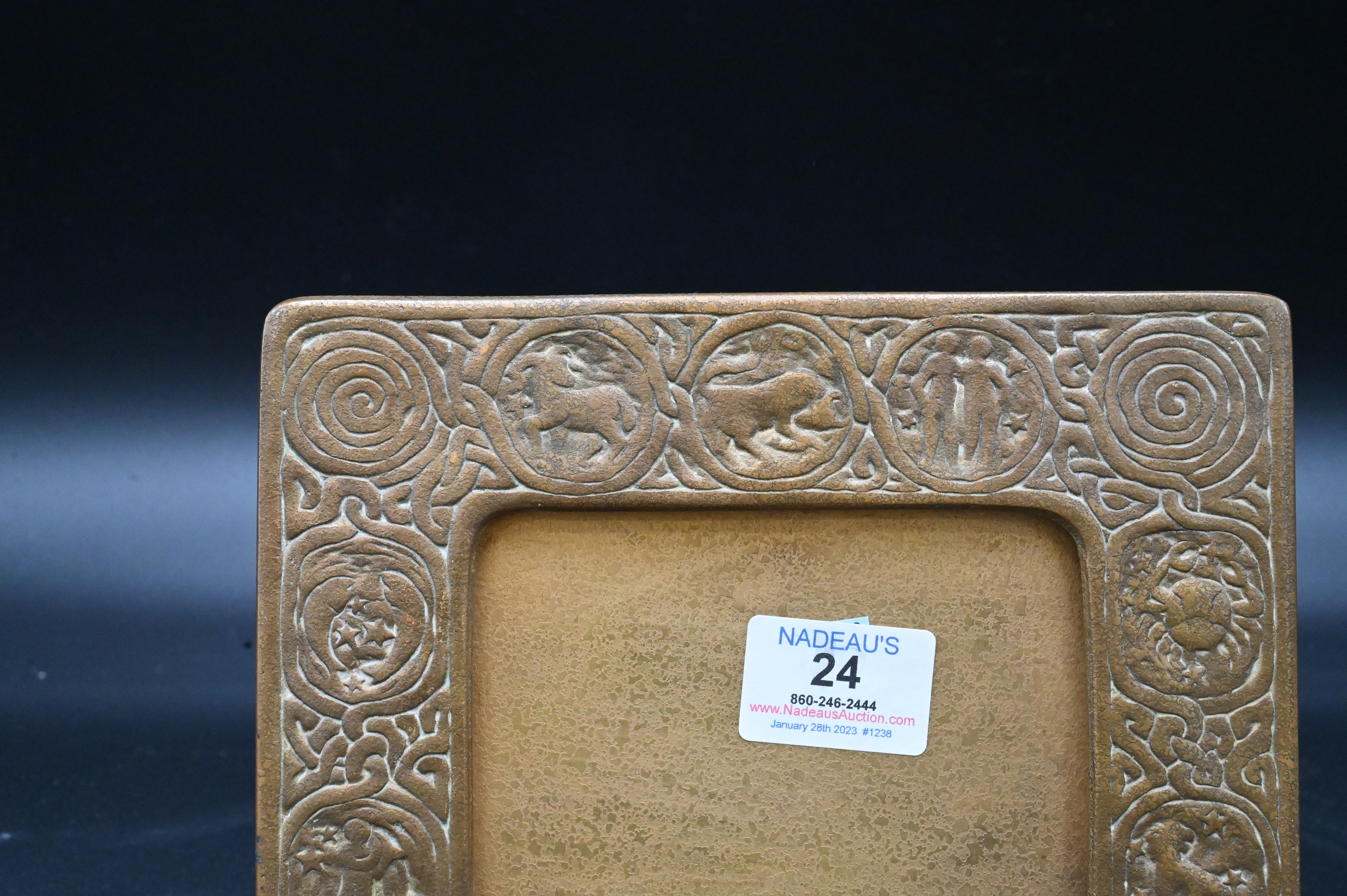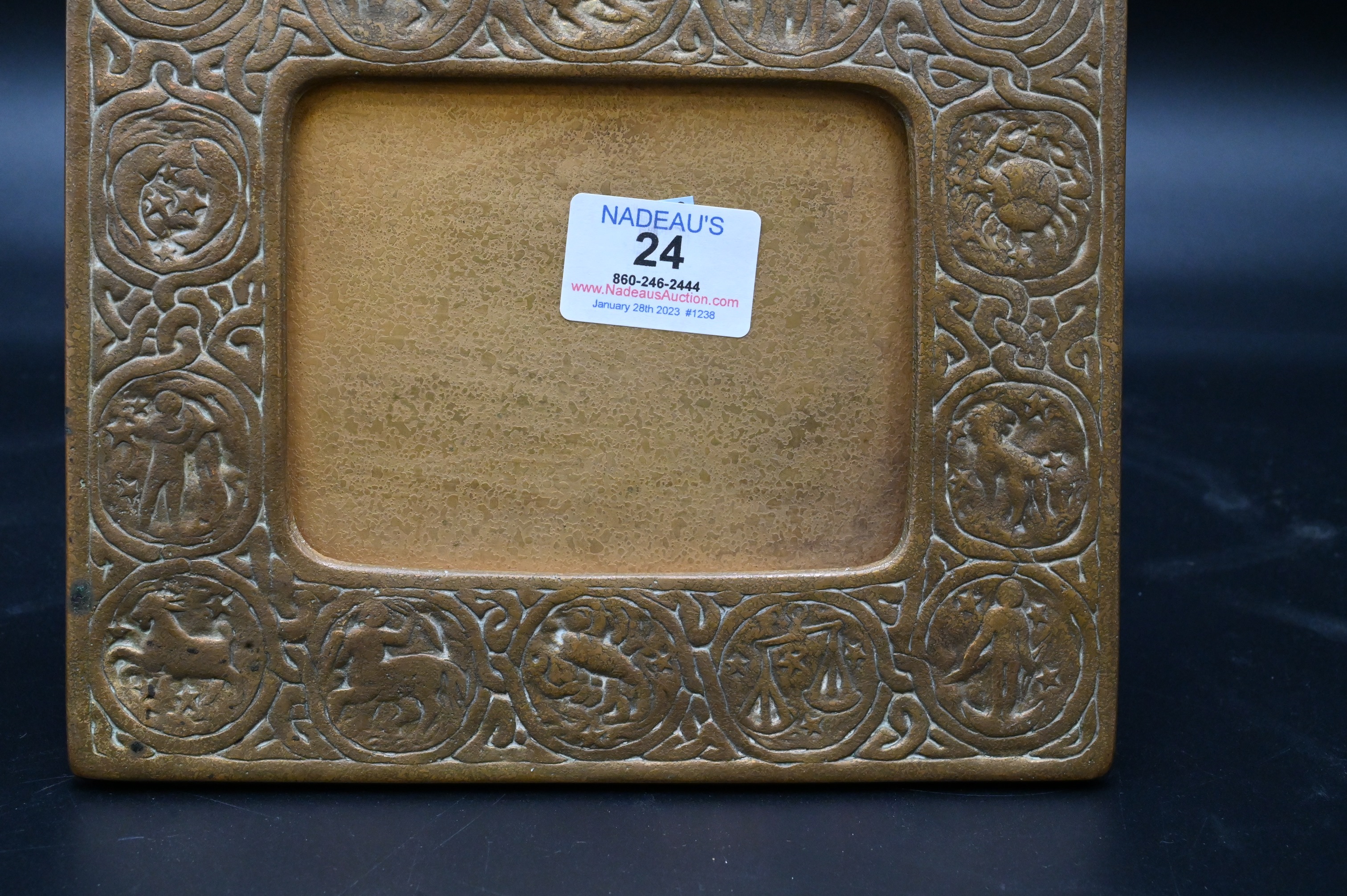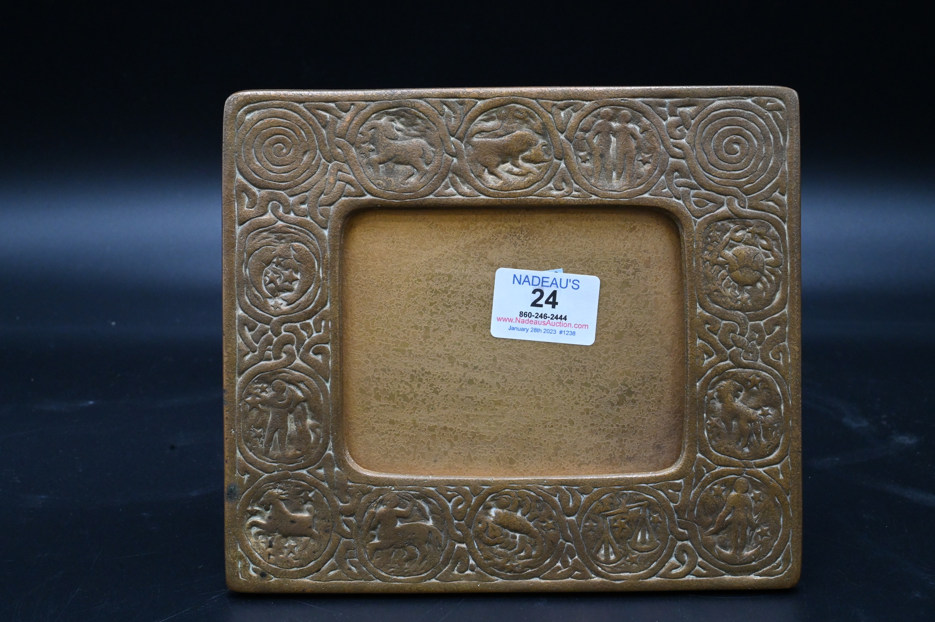Tiffany Studios Zodiac Bronze Picture/Calendar Frame, marked ‘Tiffany Studios, New York 943’, 7 1/4″ x 8″. Provenance: An Estate from Redding, Connecticut.